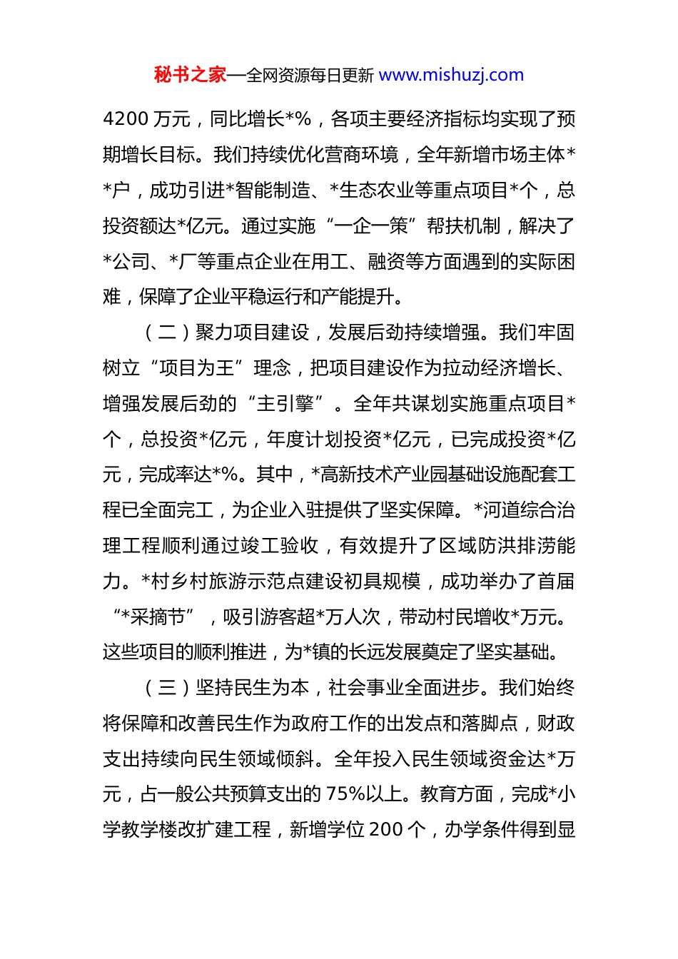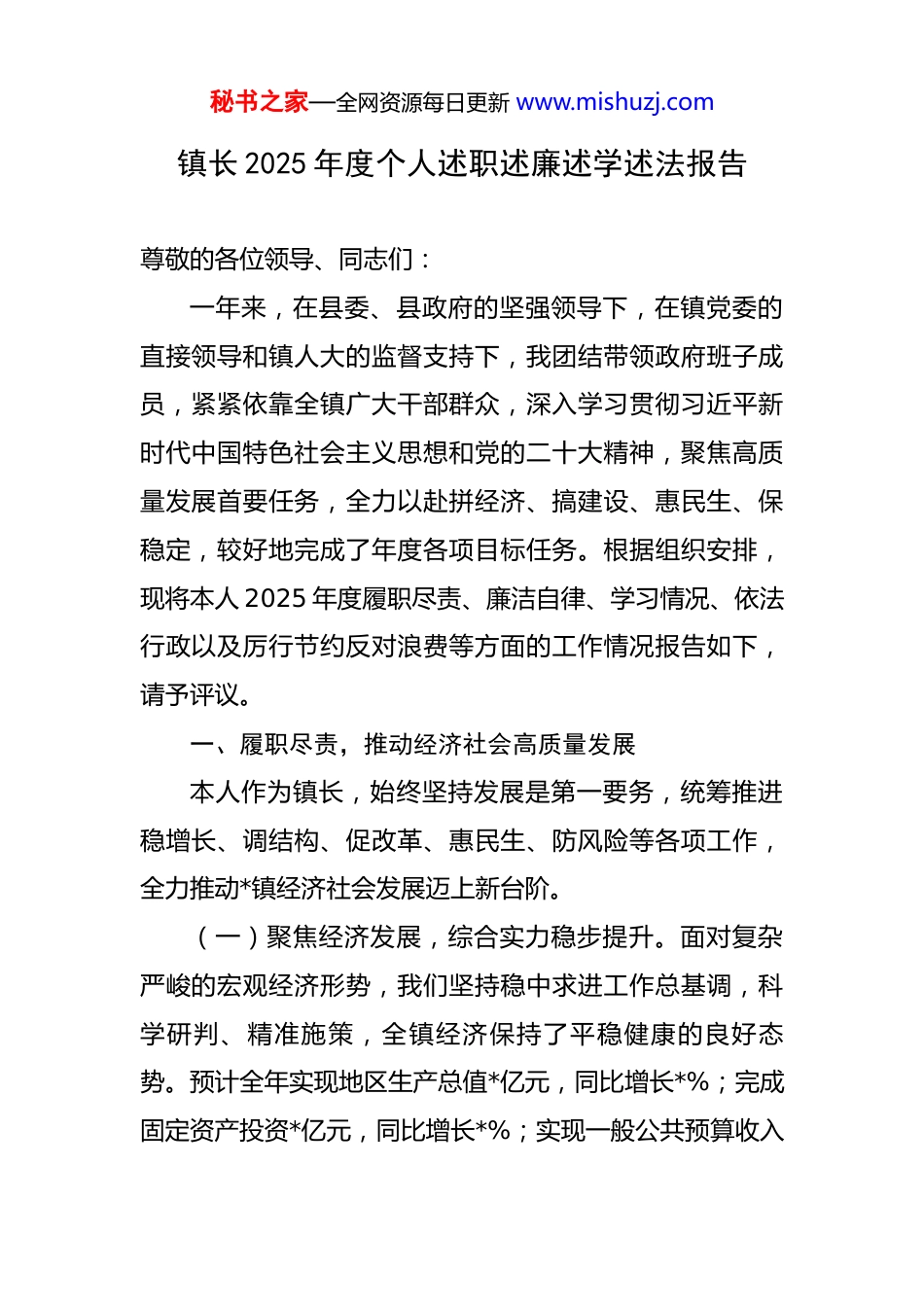 秘书之家—全网资源每日更新 www.mishuzj.com镇长 2025 年度个人述职述廉述学述法报告 尊敬的各位领导、同志们:一年来,在县委、县政府的坚强领导下,在镇党委的直接领导和镇人大的监督支持下,我团结带领政府班子成员,紧紧依靠全镇广大干部群众,深入学习贯彻习近平新时代中国特色社会主义思想和党的二十大精神,聚焦高质量发展首要任务,全力以赴拼经济、搞建设、惠民生、保稳定,较好地完成了年度各项目标任务。根据组织安排,现将本人 2025 年度履职尽责、廉洁自律、学习情况、依法行政以及厉行节约反对浪费等方面的工作情况报告如下,请予评议。一、履职尽责,推动经济社会高质量发展本人作为镇长,始终坚持发展是第一要务,统筹推进稳增长、调结构、促改革、惠民生、防风险等各项工作,全力推动*镇经济社会发展迈上新台阶。(一)聚焦经济发展,综合实力稳步提升。面对复杂严峻的宏观经济形势,我们坚持稳中求进工作总基调,科学研判、精准施策,全镇经济保持了平稳健康的良好态势。预计全年实现地区生产总值*亿元,同比增长*%;完成固定资产投资*亿元,同比增长*%;实现一般公共预算收入秘书之家—全网资源每日更新 www.mishuzj.com4200 万元,同比增长*%,各项主要经济指标均实现了预期增长目标。我们持续优化营商环境,全年新增市场主体**户,成功引进*智能制造、*生态农业等重点项目*个,总投资额达*亿元。通过实施“一企一策”帮扶机制,解决了*公司、*厂等重点企业在用工、融资等方面遇到的实际困难,保障了企业平稳运行和产能提升。(二)聚力项目建设,发展后劲持续增强。我们牢固树立“项目为王”理念,把项目建设作为拉动经济增长、增强发展后劲的“主引擎”。全年共谋划实施重点项目*个,总投资*亿元,年度计划投资*亿元,已完成投资*亿元,完成率达*%。其中,*高新技术产业园基础设施配套工程已全面完工,为企业入驻提供了坚实保障。*河道综合治理工程顺利通过竣工验收,有效提升了区域防洪排涝能力。*村乡村旅游示范点建设初具规模,成功举办了首届“*采摘节”,吸引游客超*万人次,带动村民增收*万元。这些项目的顺利推进,为*镇的长远发展奠定了坚实基础。(三)坚持民生为本,社会事业全面进步。我们始终将保障和改善民生作为政府工作的出发点和落脚点,财政支出持续向民生领域倾斜。全年投入民生领域资金达*万元,占一般公共预算支出的 75%以上。教育方面,完成*小学教学楼改扩建工程,新增学位 200 个,办学条件得到显秘书之家—全网资源每日更新 www.mishuzj.com著改善。医疗卫生方面,镇卫生院标准化建设全面达标,家庭医生签约服务覆盖率达到*%。社会保障方面,城乡居民基本医疗保险参保率稳定在 98%以上,城乡低保、特困供养等政策全面落实,发放各类救助资金*万元,惠及群众*千余人次。人居环境方面,深入开展农村人居环境整治提升行动,完成*个村的“美丽庭院”创建,新建和改造农村公路*公里,安装太阳能路灯**盏,群众的获得感、幸福感、安全感不断增强。(四)筑牢安全防线,社会大局和谐稳定。我们始终绷紧安全稳定这根弦,严格落实安全生产责任制,全年未发生较大及以上安全生产事故。深入开展矛盾纠纷排查化解,成功调处各类矛盾纠纷*起,化解率达到 98%以上,实现了“小事不出村、大事不出镇、矛盾不上交”。常态化开展扫黑除恶斗争,严厉打击各类违法犯罪活动,群众安全感测评位居全县前列。同时,扎实做好防汛抗旱、森林防火、食品药品安全监管等工作,确保了人民群众生命财产安全和社会大局的和谐稳定。二、严于律己,永葆清正廉洁政治本色作为政府主要负责人,我深知廉洁自律是履职尽责的根本保障。一年来,我始终把党风廉政建设放在心上、抓在手上、扛在肩上。秘书之家—全网资源每日更新 www.mishuzj.com(一)强化理论学习,筑牢思想防线。深入学习《中国共产党廉洁自律准则》《中国共产党纪律处分条例》等党内法规,不断加强党性修养,坚定理想信念。通过参加党委中心组学习、专题研讨等方式,深刻领悟“两个确立”的决定性意义,增强“四个意识”、坚定“四个自信”、做到“两个维护”,始终保持清醒的政治头脑和...