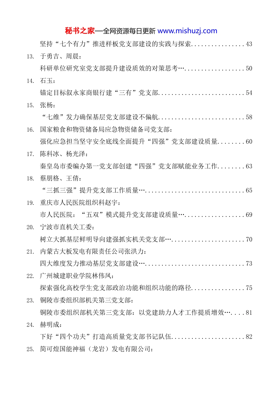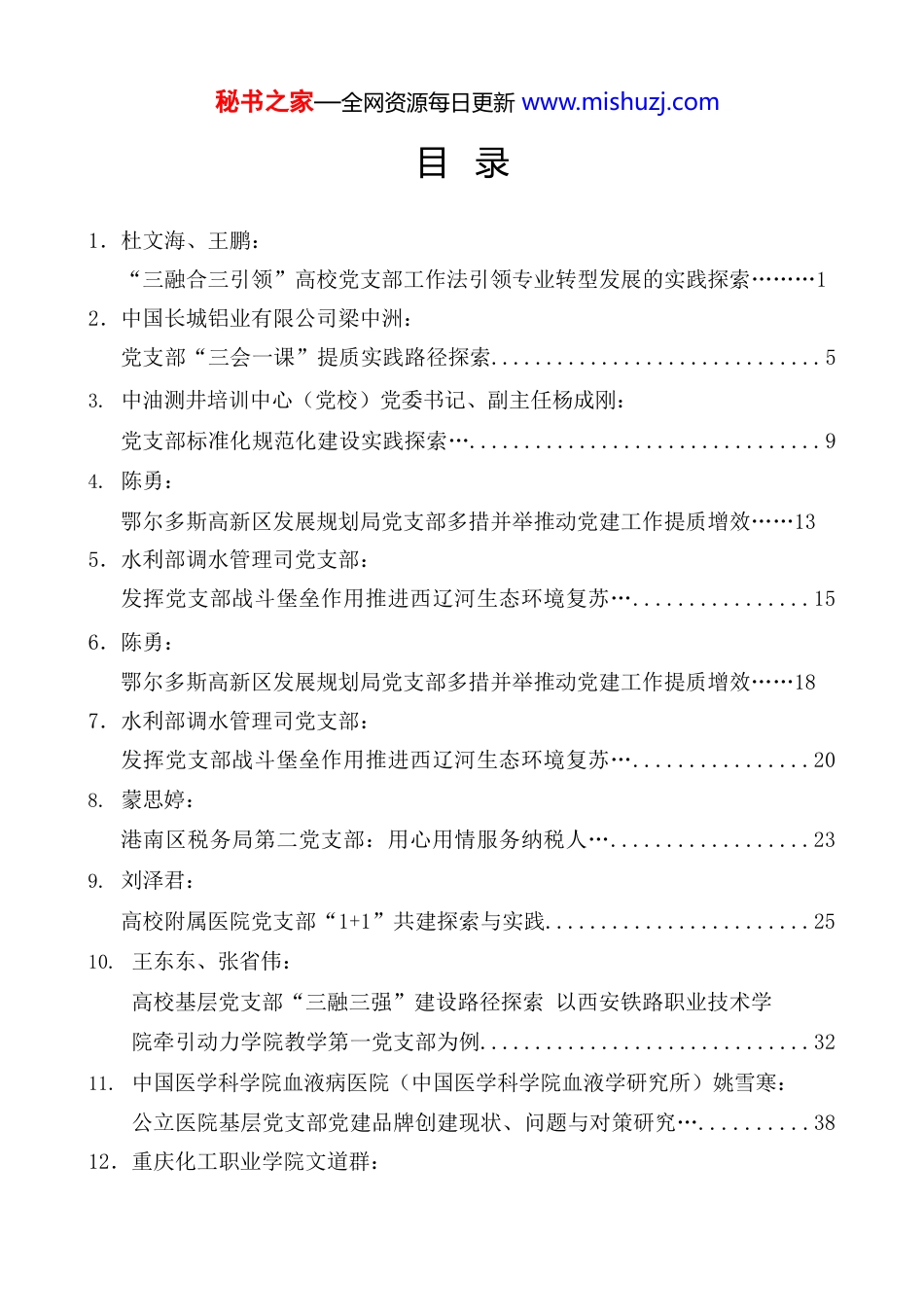 秘书之家—全网资源每日更新 www.mishuzj.com目 录 1.杜文海、王鹏: “三融合三引领”高校党支部工作法引领专业转型发展的实践探索………1 2.中国长城铝业有限公司梁中洲: 党支部“三会一课”提质实践路径探索..............................5 3. 中油测井培训中心(党校)党委书记、副主任杨成刚: 党支部标准化规范化建设实践探索…................................9 4. 陈勇: 鄂尔多斯高新区发展规划局党支部多措并举推动党建工作提质增效……13 5.水利部调水管理司党支部: 发挥党支部战斗堡垒作用推进西辽河生态环境复苏…................15 6.陈勇: 鄂尔多斯高新区发展规划局党支部多措并举推动党建工作提质增效……18 7.水利部调水管理司党支部: 发挥党支部战斗堡垒作用推进西辽河生态环境复苏…................20 8. 蒙思婷: 港南区税务局第二党支部:用心用情服务纳税人…..................23 9. 刘泽君: 高校附属医院党支部“1+1”共建探索与实践........................25 10. 王东东、张省伟: 高校基层党支部“三融三强”建设路径探索 以西安铁路职业技术学 院牵引动力学院教学第一党支部为例..............................32 11. 中国医学科学院血液病医院(中国医学科学院血液学研究所)姚雪寒: 公立医院基层党支部党建品牌创建现状、问题与对策研究…..........38 12.重庆化工职业学院文道群: 秘书之家—全网资源每日更新 www.mishuzj.com坚持“七个有力”推进样板党支部建设的实践与探索................43 13. 于勇吉、周晨: 科研单位研究室党支部提升建设质效的对策思考…..................50 14. 石玉: 锚定目标叙永家商银行建“三有”党支部..........................54 15. 张杨: “七维”发力确保基层党支部建设不偏航..........................58 16. 国家粮食和物资储备局应急物资储备司党支部: 强化应急担当坚守安全底线全面提升“四强”党支部建设质量........60 17. 陈科冰、杨光泽: 秦皇岛市委编办第一党支部创建“四强”党支部赋能业务工作........63 18. 蔡朋格、王倩: “三抓三强”提升党支部工作质量…..............................65 19. 重庆市人民医院组织科赵宇: 市人民医院:“五双”模式提升党支部建设质量…..................69 20. 宁波市直机关工委: 树立大抓基层鲜明导向建强抓实机关党支部…......................70 21. 内蒙古大板发电有限责任公司张洪力: 四大维度发力推动基层党支部建设…..............................73 22. 广州城建职业学院林伟凤: 探索强化高校学生党支部政治功能和组织功能的路径................75 23. 铜陵市委组织部机关第三党支部: 铜陵市委组织部机关第三党支部:以党建助力人才工作提质增效…....81 24. 赫明成: 下好“四个功夫”打造高质量党支部书记队伍......................82 25. 简可煌国能神福(龙岩)发电有限公司: 秘书之家—全网资源每日更新 www.mishuzj.com新时代国有企业基层党支部做好党建工作的路径…..................86 26. 天津市河北区市场监督管理局 12315 投诉举报中心王芳: 新时代基层党支部标准化建设的实践路径探析......................92 27. 郑州科技学院方加奇、李燕: 新时代民办高校学生党支部品牌建设探索..........................94 28. 中石油西部钻探井下作业公司执行董事、党委书记夏奡: 新时期国企基层党支部的“九个堡垒作用”…......................99 29. 冀中能源股份有限公司李军涛: 新形势下如何发挥国有煤炭企业机关党支部的作用…..............103 30. 淮河能源控股集团煤炭销售中心何飞: 扎实开展基层党建提升党支部工作活力…........................106 31. 刘华维: 州委州直机关工委党支部:拧紧基层党建“责任链条”…..........109 秘书之家—全网资源每日更新 www.mishuzj.com秘书之家—全网资源每日更新 www.mishuzj.com“三融合三引领”高校党支部工作法引领专业转型发展的实践...