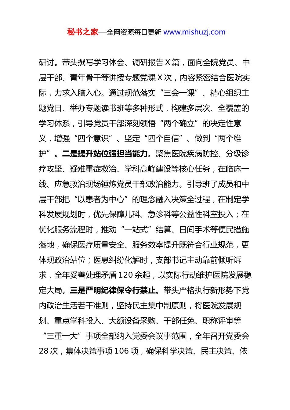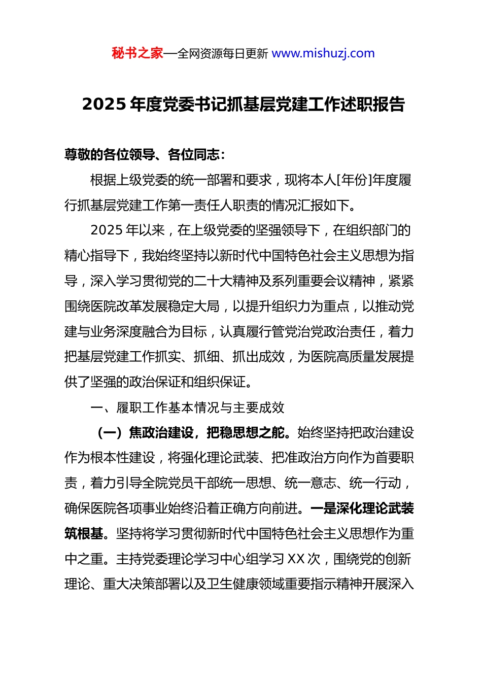 秘书之家—全网资源每日更新 www.mishuzj.com2025 年度党委书记抓基层党建工作述职报告尊敬的各位领导、各位同志:根据上级党委的统一部署和要求,现将本人[年份]年度履行抓基层党建工作第一责任人职责的情况汇报如下。2025 年以来,在上级党委的坚强领导下,在组织部门的精心指导下,我始终坚持以新时代中国特色社会主义思想为指导,深入学习贯彻党的二十大精神及系列重要会议精神,紧紧围绕医院改革发展稳定大局,以提升组织力为重点,以推动党建与业务深度融合为目标,认真履行管党治党政治责任,着力把基层党建工作抓实、抓细、抓出成效,为医院高质量发展提供了坚强的政治保证和组织保证。一、履职工作基本情况与主要成效(一)焦政治建设,把稳思想之舵。始终坚持把政治建设作为根本性建设,将强化理论武装、把准政治方向作为首要职责,着力引导全院党员干部统一思想、统一意志、统一行动,确保医院各项事业始终沿着正确方向前进。一是深化理论武装筑根基。坚持将学习贯彻新时代中国特色社会主义思想作为重中之重。主持党委理论学习中心组学习 XX 次,围绕党的创新理论、重大决策部署以及卫生健康领域重要指示精神开展深入秘书之家—全网资源每日更新 www.mishuzj.com研讨。带头撰写学习体会、调研报告 X 篇,面向全院党员、中层干部、青年骨干等讲授专题党课 X 次,内容紧密结合医院实际,力求入脑入心。通过规范落实“三会一课”、精心组织主题党日、举办专题读书班等多种形式,构建多层次、全覆盖的学习体系,引导党员干部深刻领悟“两个确立”的决定性意义,增强“四个意识”、坚定“四个自信”、做到“两个维护”。二是提升站位强担当能力。聚焦医院疾病防控、分级诊疗攻坚、疑难重症救治、学科高峰建设等核心任务,在临床一线、应急救治现场锤炼党员干部政治能力。引导班子成员和中层干部把“以患者为中心”的理念融入决策全过程,在制定学科发展规划时,优先保障儿科、急诊科等公益性科室投入;在优化服务流程时,推动“一站式”结算、日间手术等便民措施落地,确保医疗质量安全、服务效率提升既符合行业规范,更体现政治站位;医患纠纷化解时,支部书记主动靠前倾听诉求,全年妥善处理矛盾 120 余起,以实际行动维护医院发展稳定大局。三是严明纪律保令行禁止。带头严格执行新形势下党内政治生活若干准则,坚持民主集中制原则,将医院发展规划、重点学科投入、大额设备采购、干部任免、职称评审等“三重一大”事项全部纳入党委会议事范围,全年召开党委会28 次,集体决策事项 106 项,确保科学决策、民主决策、依秘书之家—全网资源每日更新 www.mishuzj.com法决策。坚决贯彻党中央关于卫生健康工作的部署要求,推动紧密型医联体建设覆盖社区卫生服务中心 15 家,落实药品耗材集中采购节约患者费用超 300 万元,严格执行公益性导向的绩效考核办法。加强纪律监督与医疗行业规范融合,常态化检查各支部在落实《医疗机构工作人员廉洁从业九项准则》、红包回扣专项整治、医保基金安全监管等方面的纪律执行情况。(二)健全责任体系,拧紧履职之链。我深入落实抓基层党建的“第一责任人”职责,着力在明责、履责、督责上下功夫,构建齐抓共管的工作格局。一是明晰责任清单。主持召开党委会专题研究党建工作 XX 次,审议通过年度党建工作要点、全面从严治党主体责任清单等重要文件,将党建工作要求融入医院年度工作目标和绩效考核体系。坚持党建工作与业务工作同谋划、同部署、同推进、同考核,年初召开党建工作会议进行全面部署,年中听取进展情况汇报,年底开展述职评议考核,形成闭环管理。二是压紧压实责任。与全院 XX 个党支部书记逐一签订《党建工作目标责任书》,将责任细化量化具体化。定期组织召开党支部书记例会,听取党建工作汇报,交流经验,解决问题。将抓基层党建工作情况作为评价支部班子和支部书记工作实绩的重要标准,与评先评优、干部任用等挂钩,有效激发了各支部抓党建的内生动力。三是聚焦群众关秘书之家—全网资源每日更新 www.mishuzj.com切。落实联系点制度,全年深入临床一线、医技科室、后勤班组等基层党支部调研指导...