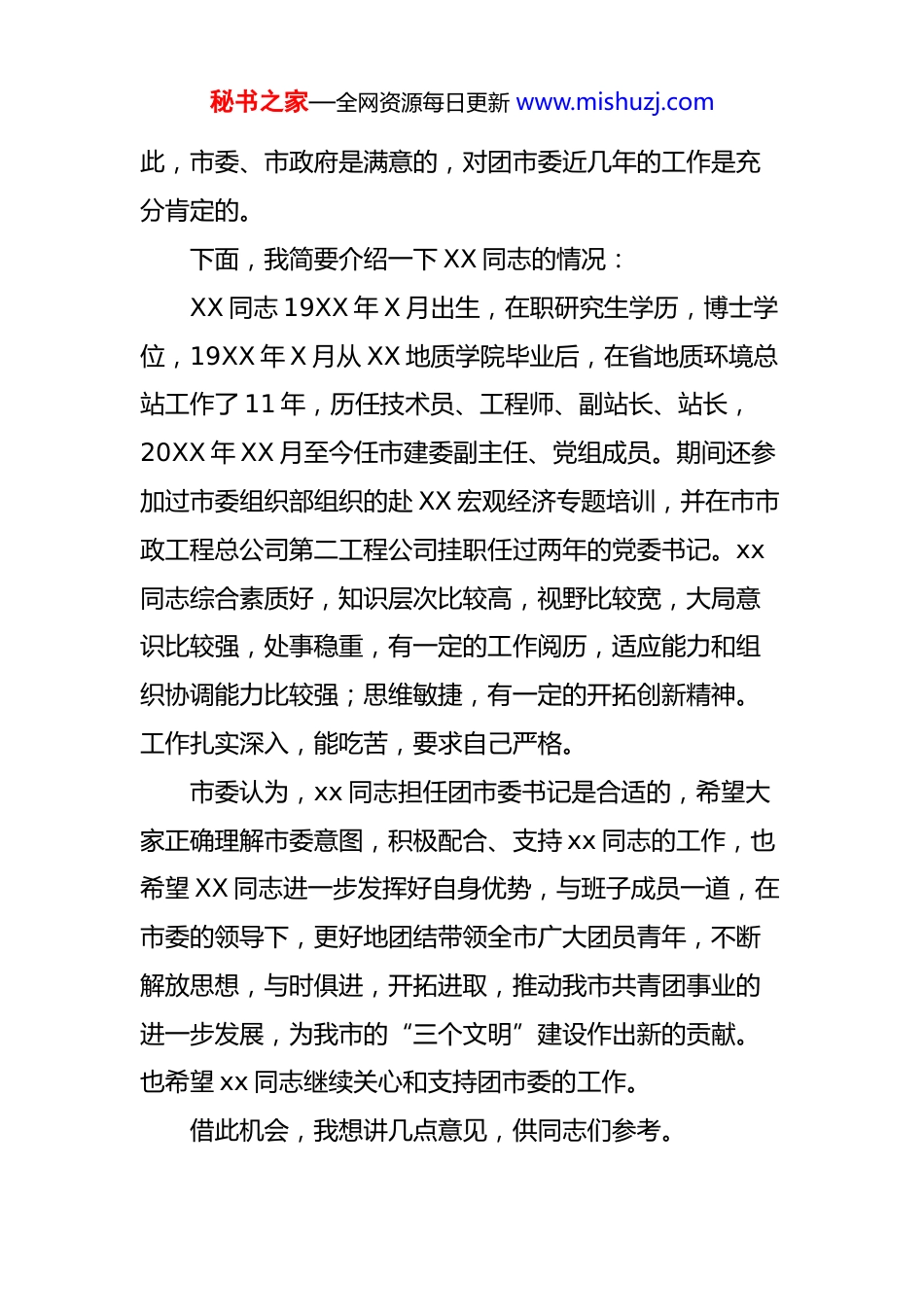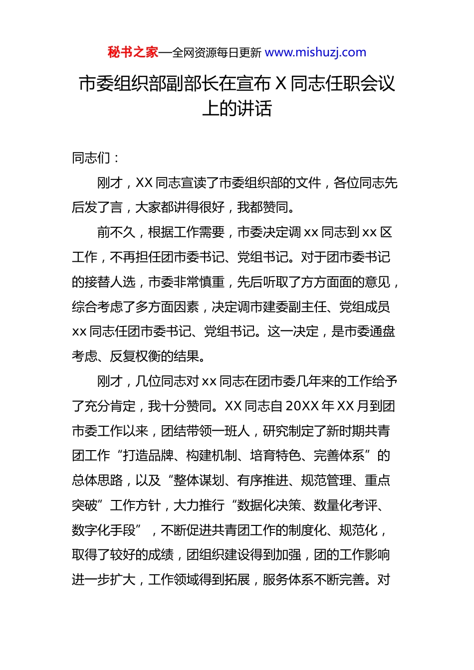 秘书之家—全网资源每日更新 www.mishuzj.com市委组织部副部长在宣布 X 同志任职会议上的讲话同志们:刚才,XX 同志宣读了市委组织部的文件,各位同志先后发了言,大家都讲得很好,我都赞同。前不久,根据工作需要,市委决定调 xx 同志到 xx 区工作,不再担任团市委书记、党组书记。对于团市委书记的接替人选,市委非常慎重,先后听取了方方面面的意见,综合考虑了多方面因素,决定调市建委副主任、党组成员xx 同志任团市委书记、党组书记。这一决定,是市委通盘考虑、反复权衡的结果。刚才,几位同志对 xx 同志在团市委几年来的工作给予了充分肯定,我十分赞同。XX 同志自 20XX 年 XX 月到团市委工作以来,团结带领一班人,研究制定了新时期共青团工作“打造品牌、构建机制、培育特色、完善体系”的总体思路,以及“整体谋划、有序推进、规范管理、重点突破”工作方针,大力推行“数据化决策、数量化考评、数字化手段”,不断促进共青团工作的制度化、规范化,取得了较好的成绩,团组织建设得到加强,团的工作影响进一步扩大,工作领域得到拓展,服务体系不断完善。对秘书之家—全网资源每日更新 www.mishuzj.com此,市委、市政府是满意的,对团市委近几年的工作是充分肯定的。下面,我简要介绍一下 XX 同志的情况:XX 同志 19XX 年 X 月出生,在职研究生学历,博士学位,19XX 年 X 月从 XX 地质学院毕业后,在省地质环境总站工作了 11 年,历任技术员、工程师、副站长、站长,20XX 年 XX 月至今任市建委副主任、党组成员。期间还参加过市委组织部组织的赴 XX 宏观经济专题培训,并在市市政工程总公司第二工程公司挂职任过两年的党委书记。xx同志综合素质好,知识层次比较高,视野比较宽,大局意识比较强,处事稳重,有一定的工作阅历,适应能力和组织协调能力比较强;思维敏捷,有一定的开拓创新精神。工作扎实深入,能吃苦,要求自己严格。市委认为,xx 同志担任团市委书记是合适的,希望大家正确理解市委意图,积极配合、支持 xx 同志的工作,也希望 XX 同志进一步发挥好自身优势,与班子成员一道,在市委的领导下,更好地团结带领全市广大团员青年,不断解放思想,与时俱进,开拓进取,推动我市共青团事业的进一步发展,为我市的“三个文明”建设作出新的贡献。也希望 xx 同志继续关心和支持团市委的工作。借此机会,我想讲几点意见,供同志们参考。秘书之家—全网资源每日更新 www.mishuzj.com第一,要不断地加强学习,努力提高思想政治素质和工作能力学习是每个同志的一项基本功。提高从学习开始,落实从学习起步,差距也从学习拉开。当今社会,生存与发展的竞争就是学习的竞争,谁要在学习上固步自封,不思进取,谁就会被时代所淘汰。大家都知道,团的岗位是学习的岗位、锻炼的岗位、提高的岗位。根据共青团工作的特点,在座的各位特别是领导班子成员,不会在共青团岗位上工作一辈子,未来还有很长的路要走,还有更艰巨的任务等着你们去完成。“凡事预则立,不预则废”,要从现在开始,培养良好的学习习惯,把学习作为一种自觉的行动,把眼光放得远一点,目标定得高一点,主动给自己压担子,永不满足,永不懈怠,努力把自己培养成一名学习型干部,不断拓宽视野,及时更新知识,做好应对更大挑战的准备。要把学习作为一种工具和手段,通过学习达到这样几个目的:一是通过学习提高政治敏锐性和鉴别力,不断增强贯彻落实党的路线方针和政策的自觉性;二是通过学习提高自身综合素质,特别是提高自身修养;三是通过学习提高业务工作水平。作为领导干部,要求拥有的知识结构和一般干部是不一样的,必须具备统筹全局和协调各方的能力,所以眼界必须更开阔些,懂得的东西必须更秘书之家—全网资源每日更新 www.mishuzj.com多些,这些都不是天生得来的,而是靠扎扎实实的学习积累起来的。古人讲“登东山而小鲁,登泰山而小天下”,只有通过学习打下深厚的理论功底,我们在实际工作中才能“不畏浮云遮望眼”,才能面对复杂的新情况、新问题、新变化,正确应对,做好工作,求得发展。学习是多方面的,我觉得当前有三位领导的几次讲话值...