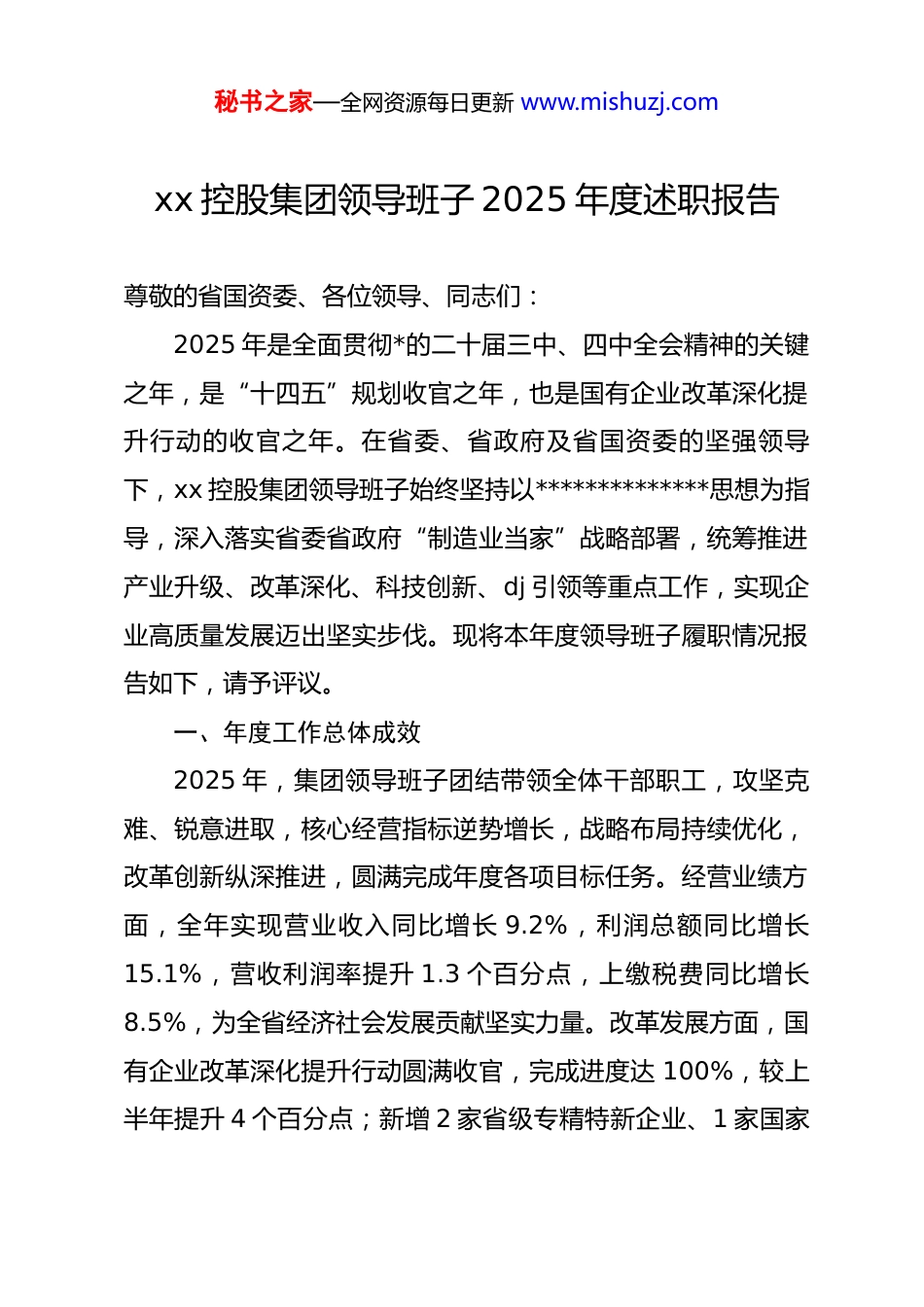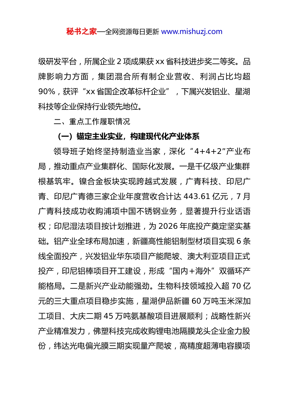 秘书之家—全网资源每日更新 www.mishuzj.comxx 控股集团领导班子 2025 年度述职报告尊敬的省国资委、各位领导、同志们:2025 年是全面贯彻*的二十届三中、四中全会精神的关键之年,是“十四五”规划收官之年,也是国有企业改革深化提升行动的收官之年。在省委、省政府及省国资委的坚强领导下,xx 控股集团领导班子始终坚持以**************思想为指导,深入落实省委省政府“制造业当家”战略部署,统筹推进产业升级、改革深化、科技创新、dj 引领等重点工作,实现企业高质量发展迈出坚实步伐。现将本年度领导班子履职情况报告如下,请予评议。一、年度工作总体成效2025 年,集团领导班子团结带领全体干部职工,攻坚克难、锐意进取,核心经营指标逆势增长,战略布局持续优化,改革创新纵深推进,圆满完成年度各项目标任务。经营业绩方面,全年实现营业收入同比增长 9.2%,利润总额同比增长15.1%,营收利润率提升 1.3 个百分点,上缴税费同比增长8.5%,为全省经济社会发展贡献坚实力量。改革发展方面,国有企业改革深化提升行动圆满收官,完成进度达 100%,较上半年提升 4 个百分点;新增 2 家省级专精特新企业、1 家国家秘书之家—全网资源每日更新 www.mishuzj.com级研发平台,所属企业 2 项成果获 xx 省科技进步奖二等奖。品牌影响力方面,集团混合所有制企业营收、利润占比均超90%,获评“xx 省国企改革标杆企业”,下属兴发铝业、星湖科技等企业保持行业领先地位。二、重点工作履职情况(一)锚定主业实业,构建现代化产业体系领导班子始终坚持制造业当家,深化“4+4+2”产业布局,推动重点产业集群化、国际化发展。一是千亿级产业集群根基筑牢。镍合金板块实现跨越式发展,广青科技、印尼广青、印尼广青德三家企业年度营收合计达 443.61 亿元,7 月广青科技成功收购浦项中国不锈钢业务,显著提升行业话语权;印尼湿法项目按计划推进,为 2026 年底投产奠定坚实基础。铝产业全球布局加速,新疆高性能铝制型材项目实现 6 条线全面投产,兴发铝业华东项目产能爬坡、澳大利亚项目正式投产,印尼铝棒项目开工建设,形成“国内+海外”双循环产能格局。二是新兴产业动能强劲。生物科技领域投入超 70 亿元的三大重点项目稳步实施,星湖伊品新疆 60 万吨玉米深加工项目、大庆二期 45 万吨氨基酸项目进展顺利;战略性新兴产业精准发力,佛塑科技完成收购锂电池隔膜龙头企业金力股份,纬达光电偏光膜三期实现量产爬坡,高精度超薄电容膜项秘书之家—全网资源每日更新 www.mishuzj.com目有序推进。三是“人工智能+”赋能升级。推动兴发铝业“铝型材模具 ai 设计”、星湖科技“ai 菌种筛选”等 8 个重点项目落地,建成工业互联网创新与服务平台,ai 技术在生产研发各环节实现降本增效,全年通过智能化改造实现新增效益超 2 亿元。(二)深化改革攻坚,提升治理效能以改革深化提升行动为抓手,推动体制机制系统性重塑。一是公司治理持续优化。实施新一轮“一企一策”差异化授放权,修订董事会制度,优化外派董事管理机制,对 4 家 a 类拓新企业实施提级赋能、扁平化管理,决策效率提升 30%以上。二是市场化机制全面深化。实现经理层成员任期制和契约化管理全覆盖,深化薪酬分配改革,推动薪酬向关键岗位、核心人才倾斜,建立“业绩升、薪酬升,业绩降、薪酬降”的联动机制。14 家二、三级企业成功引入积极股东,混合所有制改革质量持续提升。三是精益管理成效显著。总部牵头实施 23 项精益专项,覆盖组织优化、风险防控等领域,全集团开展精益专项行动超 150 项,年度实现收益 1.8 亿元,较上半年增加 0.7亿元;培养精益绿带 65 名,构建全员参与的精益管理体系。(三)坚持创新驱动,增强核心竞争力牢固树立“创新是第一动力”理念,构建“人才+项目+秘书之家—全网资源每日更新 www.mishuzj.com机制”三位一体创新体系。一是创新平台能级提升。筹建省新材料产业科技创新应用中心,制定“科创领航榜”评价方案,在经营业绩考核中设置科技创新专项权重,推动“四加一减”政策落地,激发创新主体活力。二是关键技术突破见效。...