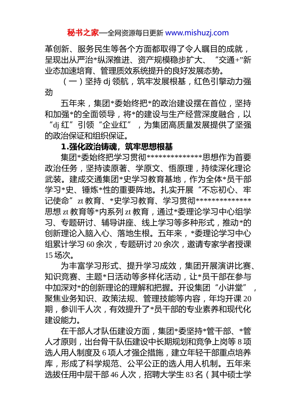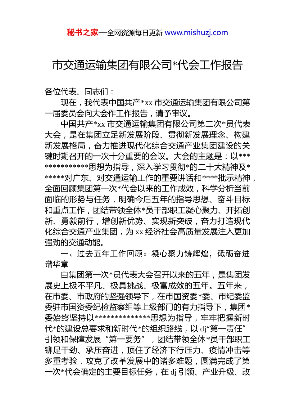 秘书之家—全网资源每日更新 www.mishuzj.com市交通运输集团有限公司*代会工作报告各位代表、同志们:现在,我代表中国共产*xx 市交通运输集团有限公司第一届委员会向大会作工作报告,请予审议。中国共产*xx 市交通运输集团有限公司第二次*员代表大会,是在集团立足新发展阶段、贯彻新发展理念、构建新发展格局,奋力推进现代化综合交通产业集团建设的关键时期召开的一次十分重要的会议。大会的主题是:以**************思想为指导,深入学习贯彻*的二十大精神及******对广东、对交通运输工作的重要讲话和****批示精神,全面回顾集团第一次*代会以来的工作成效,科学分析当前面临的形势与任务,明确今后五年的指导思想、奋斗目标和重点工作,团结带领全体*员干部职工凝心聚力、开拓创新、勇毅前行,增创新优势、实现新突破,奋力打造现代化综合交通产业集团,为 xx 经济社会高质量发展注入更加强劲的交通动能。一、过去五年工作回顾:凝心聚力铸辉煌,砥砺奋进谱华章自集团第一次*员代表大会召开以来的五年,是集团发展史上极不平凡、极具挑战、极富成效的五年。五年来,在市委、市政府的坚强领导下,在市国资委*委、市纪委监委驻市国资委纪检监察组等上级部门的有力指导下,集团*委始终坚持以**************思想为指导,牢牢把握新时代*的建设总要求和新时代*的组织路线,以 dj“第一责任”引领和保障发展“第一要务”,团结带领全体*员干部职工铆足干劲、承压奋进,顶住了经济下行压力、疫情冲击等多重考验,攻克了改革发展中的诸多难题,圆满完成了第一次*代会确定的主要目标任务,在 dj 引领、产业升级、改秘书之家—全网资源每日更新 www.mishuzj.com革创新、服务民生等各个方面都取得了令人瞩目的成就,呈现出从严治*纵深推进、资产规模稳步扩大、“交通+”新业态加速培育、管理质效系统提升的良好发展态势。(一)坚持 dj 领航,筑牢发展根基,红色引擎动力强劲五年来,集团*委始终把*的政治建设摆在首位,坚持和加强*的全面领导,将*的建设与生产经营深度融合,以“dj 红”引领“企业红”,为集团高质量发展提供了坚强的政治保证和组织保证。1.强化政治铸魂,筑牢思想根基集团*委始终把学习贯彻**************思想作为首要政治任务,坚持读原著、学原文、悟原理,持续深化理论武装。建成交通集团*史学习教育基地,作为全体*员干部学习*史、锤炼*性的重要阵地。扎实开展“不忘初心、牢记使命”zt 教育、*史学习教育、学习贯彻**************思想 zt 教育等*内系列 zt 教育,通过*委理论学习中心组学习、专题研讨、辅导讲座、线上学习等多种形式,推动*的创新理论入脑入心、落地生根。五年来,*委理论学习中心组累计学习 60 余次,专题研讨 20 余次,邀请专家学者授课15 场次。为丰富学习形式、提升学习成效,集团开展演讲比赛、知识竞赛、主题*日活动等多样化活动,让*员干部在参与中加深对*的创新理论的理解和把握。开设集团“小讲堂”,聚焦业务知识、政策法规、管理技能等内容,年均开课 20期,参训千人次,有效提升了*员干部的专业素养和现代化建设能力。在干部人才队伍建设方面,集团*委坚持*管干部、*管人才原则,出台骨干队伍建设中长期规划和竞争上岗等 8 项选人用人制度及 6 项人才强企措施,建立年轻干部重点培养库,形成了科学规范、公平公正的选人用人机制。五年来选拔任用中层干部 46 人次,招聘大学生 83 名(其中硕士学秘书之家—全网资源每日更新 www.mishuzj.com历以上 7 名),干部人才队伍的年龄结构、知识结构、专业结构得到持续优化,为集团发展注入了新鲜血液。2.建强战斗堡垒,夯实组织基础集团*委坚持*的组织全覆盖与企业发展同频共振,不断提升基层*组织的政治功能和组织功能。在工程建设、运输服务等一线设立*员示范岗、*员责任区,充分发挥*员的先锋模范作用。逐步形成“一企一品牌”“一支部一特色”dj 矩阵,各基层*组织结合自身业务特点,打造了一批有影响力、有辨识度的 dj 品牌。五年来,集团成功创建 3 个市级及国资系统 dj 品牌、1个市级“青年文明号”,下属客运公司凭借扎实的 dj 工作突出...