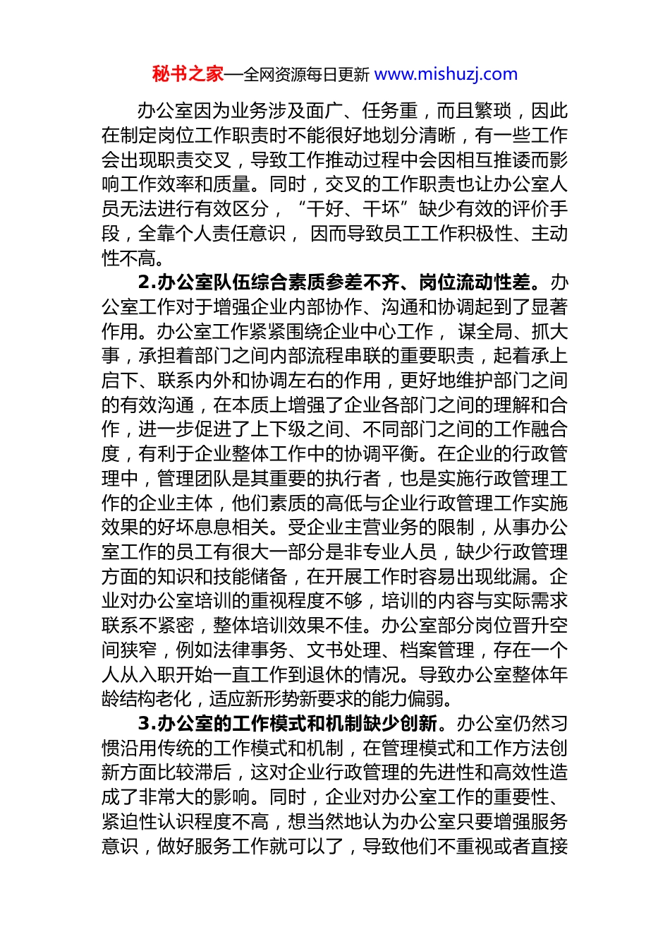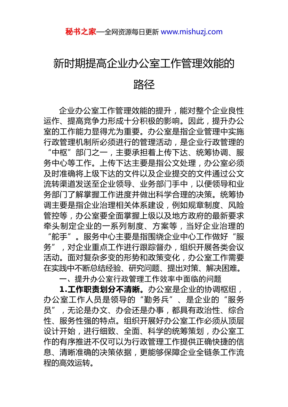 秘书之家—全网资源每日更新 www.mishuzj.com新时期提高企业办公室工作管理效能的路径企业办公室工作管理效能的提升,能对整个企业良性运作、提高竞争力形成十分积极的影响。因此,提升办公室的工作能力显得尤为重要。办公室是指企业管理中实施行政管理机制所必须进行的管理活动,是企业行政管理的“中枢”部门之一,主要承担着上传下达、统筹协调、服务中心等工作。上传下达主要是指公文处理,办公室必须及时准确将上级下达的文件以及企业提交的文件通过公文流转渠道发送至企业领导、业务部门手中,以便领导和业务部门了解掌握工作进度并做出科学合理的决策。统筹协调主要是指企业治理相关体系建设,例如规章制度、风险管控等,办公室要全面掌握上级以及地方政府的最新要求牵头制定企业的一系列制度、方案等,当好企业治理的“舵手”。服务中心主要是指围绕企业中心工作做好“服务”,对企业重点工作进行跟踪督办,组织开展各类会议活动。面对复杂多变的形势和政策变化,办公室工作需要在实践中不断总结经验、研究问题、提出对策、解决困难。一、提升办公室行政管理工作效率中面临的问题1.工作职责划分不清晰。办公室是企业的协调枢纽,办公室工作人员是领导的“勤务兵”、是企业的“服务员”,无论是办文、办会还是办事,都具有政治性、综合性、服务性强的特点。组织开展好办公室工作必须从顶层设计开始,进行细致、全面、科学的统筹策划,办公室工作的有序推进不仅可以为行政管理工作提供正确快捷的信息、清晰准确的决策依据,更能够保障企业全链条工作流程的高效运转。秘书之家—全网资源每日更新 www.mishuzj.com办公室因为业务涉及面广、任务重,而且繁琐,因此在制定岗位工作职责时不能很好地划分清晰,有一些工作会出现职责交叉,导致工作推动过程中会因相互推诿而影响工作效率和质量。同时,交叉的工作职责也让办公室人员无法进行有效区分,“干好、干坏”缺少有效的评价手段,全靠个人责任意识, 因而导致员工工作积极性、主动性不高。2.办公室队伍综合素质参差不齐、岗位流动性差。办公室工作对于增强企业内部协作、沟通和协调起到了显著作用。办公室工作紧紧围绕企业中心工作, 谋全局、抓大事,承担着部门之间内部流程串联的重要职责,起着承上启下、联系内外和协调左右的作用,更好地维护部门之间的有效沟通,在本质上增强了企业各部门之间的理解和合作,进一步促进了上下级之间、不同部门之间的工作融合度,有利于企业整体工作中的协调平衡。在企业的行政管理中,管理团队是其重要的执行者,也是实施行政管理工作的企业主体,他们素质的高低与企业行政管理工作实施效果的好坏息息相关。受企业主营业务的限制,从事办公室工作的员工有很大一部分是非专业人员,缺少行政管理方面的知识和技能储备,在开展工作时容易出现纰漏。企业对办公室培训的重视程度不够,培训的内容与实际需求联系不紧密,整体培训效果不佳。办公室部分岗位晋升空间狭窄,例如法律事务、文书处理、档案管理,存在一个人从入职开始一直工作到退休的情况。导致办公室整体年龄结构老化,适应新形势新要求的能力偏弱。3.办公室的工作模式和机制缺少创新。办公室仍然习惯沿用传统的工作模式和机制,在管理模式和工作方法创新方面比较滞后,这对企业行政管理的先进性和高效性造成了非常大的影响。同时,企业对办公室工作的重要性、紧迫性认识程度不高,想当然地认为办公室只要增强服务意识,做好服务工作就可以了,导致他们不重视或者直接秘书之家—全网资源每日更新 www.mishuzj.com忽视企业办公室工作,这也直接影响了行政管理工作的整体效能。二、提高企业办公室管理效能的路径1.做好队伍的业务能力提升工作。提升行政管理人员素质是新时代对于企业的必然要求,企业的竞争就是人才储备的竞争,有高素质的人才团队,企业才能在竞争中占据主动优势。办公室工作职责包含制度建设、档案管理、公务活动组织筹备等一系列工作,涉及的业务领域广泛,对人员的综合素质要求更高,必须更加注重业务技能培训办公室可以结合业务领域,建立“走出去、请进来”常态长效培训模式,定期输送工作人员到上级单位...