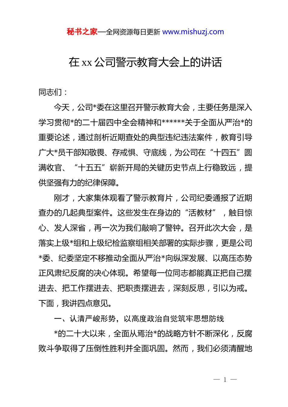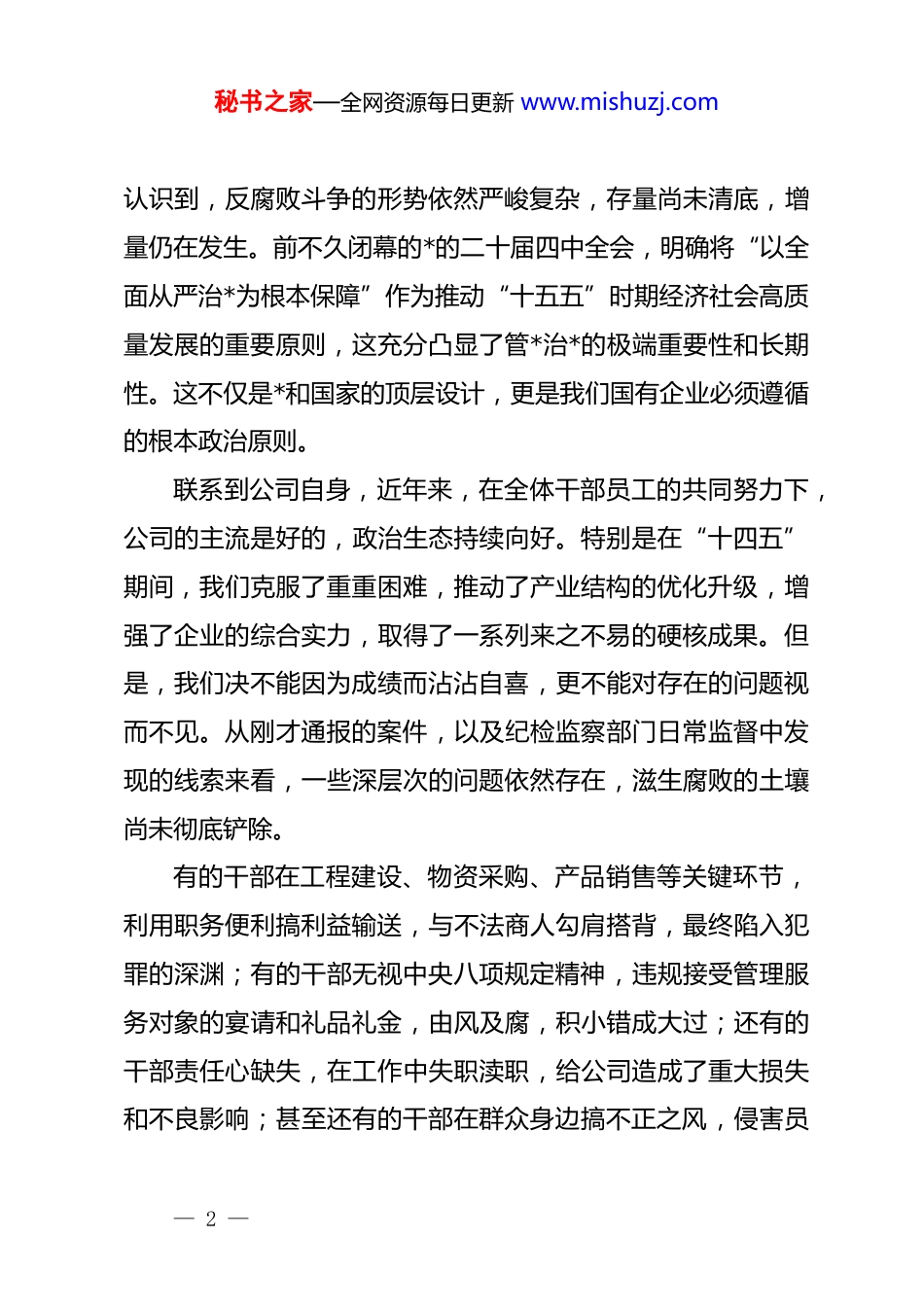 秘书之家—全网资源每日更新 www.mishuzj.com在 xx 公司警示教育大会上的讲话同志们:今天,公司*委在这里召开警示教育大会,主要任务是深入学习贯彻*的二十届四中全会精神和******关于全面从严治*的重要论述,通过剖析近期查处的典型违纪违法案件,教育引导广大*员干部知敬畏、存戒惧、守底线,为公司在“十四五”圆满收官、“十五五”崭新开局的关键历史节点上行稳致远,提供坚强有力的纪律保障。刚才,大家集体观看了警示教育片,公司纪委通报了近期查办的几起典型案件。这些发生在身边的“活教材”,触目惊心、发人深省,再一次为我们敲响了警钟。召开此次大会,是落实上级*组和上级纪检监察组相关部署的实际步骤,更是公司*委、纪委坚定不移推动全面从严治*向纵深发展、以高压态势正风肃纪反腐的决心体现。希望每一位同志都能真正把自己摆进去、把工作摆进去、把职责摆进去,深刻反思,引以为戒。下面,我讲四点意见。一、认清严峻形势,以高度政治自觉筑牢思想防线*的二十大以来,全面从焉治*的战略方针不断深化,反腐败斗争取得了压倒性胜利并全面巩固。然而,我们必须清醒地— 1 —秘书之家—全网资源每日更新 www.mishuzj.com认识到,反腐败斗争的形势依然严峻复杂,存量尚未清底,增量仍在发生。前不久闭幕的*的二十届四中全会,明确将“以全面从严治*为根本保障”作为推动“十五五”时期经济社会高质量发展的重要原则,这充分凸显了管*治*的极端重要性和长期性。这不仅是*和国家的顶层设计,更是我们国有企业必须遵循的根本政治原则。联系到公司自身,近年来,在全体干部员工的共同努力下,公司的主流是好的,政治生态持续向好。特别是在“十四五”期间,我们克服了重重困难,推动了产业结构的优化升级,增强了企业的综合实力,取得了一系列来之不易的硬核成果。但是,我们决不能因为成绩而沾沾自喜,更不能对存在的问题视而不见。从刚才通报的案件,以及纪检监察部门日常监督中发现的线索来看,一些深层次的问题依然存在,滋生腐败的土壤尚未彻底铲除。有的干部在工程建设、物资采购、产品销售等关键环节,利用职务便利搞利益输送,与不法商人勾肩搭背,最终陷入犯罪的深渊;有的干部无视中央八项规定精神,违规接受管理服务对象的宴请和礼品礼金,由风及腐,积小错成大过;还有的干部责任心缺失,在工作中失职渎职,给公司造成了重大损失和不良影响;甚至还有的干部在群众身边搞不正之风,侵害员— 2 —秘书之家—全网资源每日更新 www.mishuzj.com工利益。这些问题的发生,虽然是个别人、个别事,但其性质是恶劣的,影响是极坏的。它不仅损害了公司的经济利益,更严重污染了公司的政治生态,挫伤了广大干部员工干事创业的积极性。面对这些问题,任何人、任何时候都不能有“看客”心态,觉得那是别人的事,与自己无关;更不能有“侥幸”心理,认为规定是“稻草人”,只要手段隐蔽就不会被发现。要深刻认识到,全面从严治*就在身边,纪律和规矩的“高压线”时刻通着电。从旁观者到案中人,往往只有一步之遥。全体*员干部特别是领导干部,必须从讲政治的高度,深刻认识当前反腐败斗争的严峻性、复杂性,深刻认识我们肩负的责任,以如履薄冰、如临深渊的警觉,时刻绷紧廉洁自律这根弦。二、深刻汲取教训,以案为鉴做到警钟长鸣案例是最好的清醒剂。刚才通报的每一个案例,都是一部沉痛的“忏悔录”,都为我们提供了深刻的镜鉴。透过这些案件的表象,我们必须深挖其根源,汲取教训,举一反三,防微杜渐。第一,根源在于理想信念的“总开关”失灵。纵观所有违纪违法的干部,他们走向堕落的起点,无一不是从思想上的滑坡、信念上的动摇开始的。当世界观、人生观、价值观这个— 3 —秘书之家—全网资源每日更新 www.mishuzj.com“总开关”出了问题,就会在各种诱惑面前丧失抵抗力,把*的宗旨、组织的重托、员工的期盼抛诸脑后,最终在错误的道路上越走越远。每一名*员干部都必须把加强理论学习、坚定理想信念作为终身课题,持续巩固深化 zt 教育成果,不断筑牢信仰之基、补足精神之钙、把稳思想之舵,确保在任何时候、任何情况下都能做到政治立场不移、政治方...