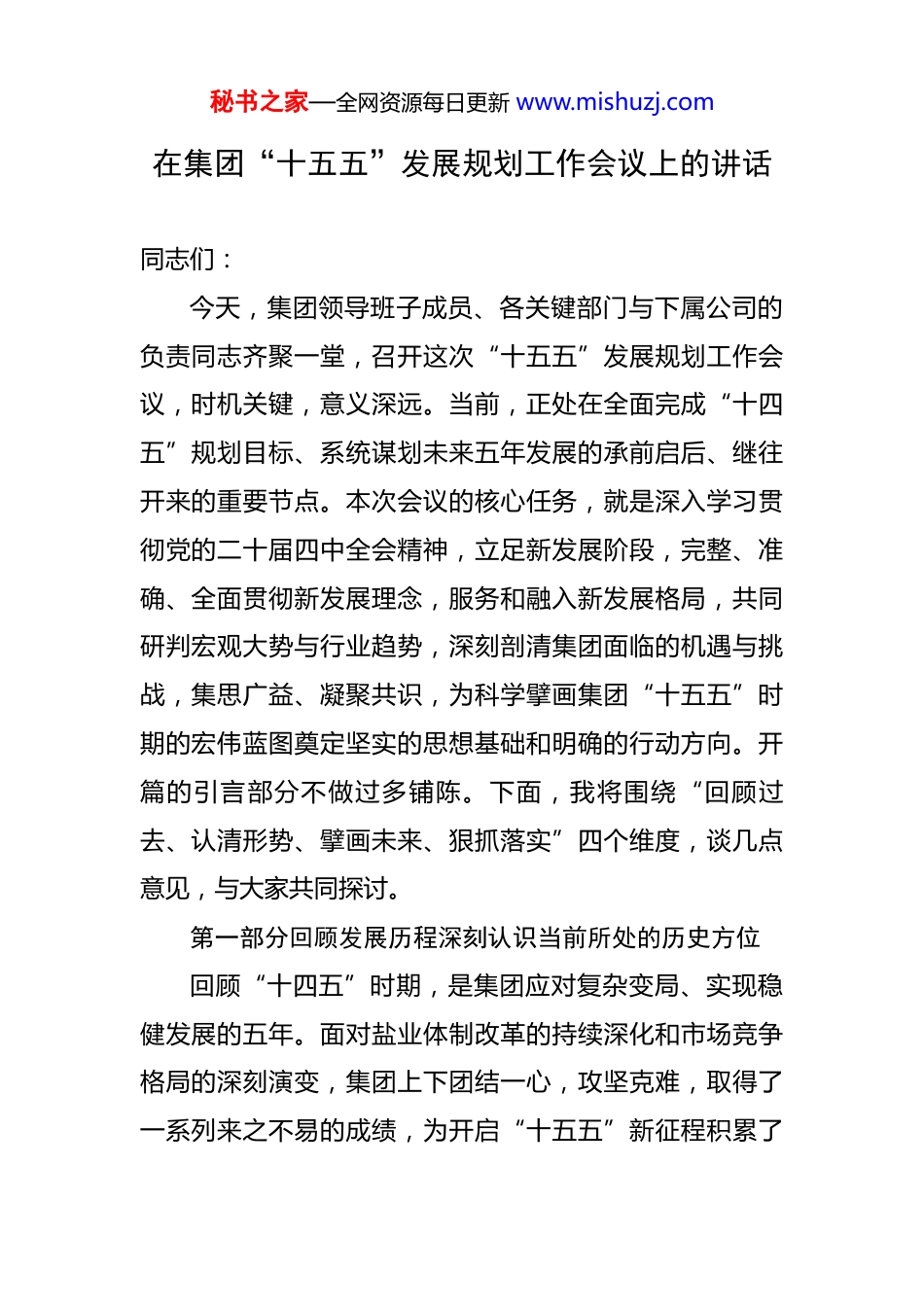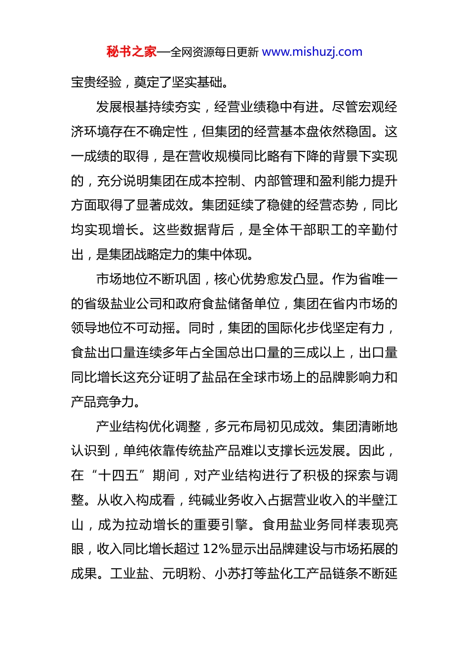 秘书之家—全网资源每日更新 www.mishuzj.com在集团“十五五”发展规划工作会议上的讲话 同志们:今天,集团领导班子成员、各关键部门与下属公司的负责同志齐聚一堂,召开这次“十五五”发展规划工作会议,时机关键,意义深远。当前,正处在全面完成“十四五”规划目标、系统谋划未来五年发展的承前启后、继往开来的重要节点。本次会议的核心任务,就是深入学习贯彻党的二十届四中全会精神,立足新发展阶段,完整、准确、全面贯彻新发展理念,服务和融入新发展格局,共同研判宏观大势与行业趋势,深刻剖清集团面临的机遇与挑战,集思广益、凝聚共识,为科学擘画集团“十五五”时期的宏伟蓝图奠定坚实的思想基础和明确的行动方向。开篇的引言部分不做过多铺陈。下面,我将围绕“回顾过去、认清形势、擘画未来、狠抓落实”四个维度,谈几点意见,与大家共同探讨。第一部分回顾发展历程深刻认识当前所处的历史方位回顾“十四五”时期,是集团应对复杂变局、实现稳健发展的五年。面对盐业体制改革的持续深化和市场竞争格局的深刻演变,集团上下团结一心,攻坚克难,取得了一系列来之不易的成绩,为开启“十五五”新征程积累了秘书之家—全网资源每日更新 www.mishuzj.com宝贵经验,奠定了坚实基础。发展根基持续夯实,经营业绩稳中有进。尽管宏观经济环境存在不确定性,但集团的经营基本盘依然稳固。这一成绩的取得,是在营收规模同比略有下降的背景下实现的,充分说明集团在成本控制、内部管理和盈利能力提升方面取得了显著成效。集团延续了稳健的经营态势,同比均实现增长。这些数据背后,是全体干部职工的辛勤付出,是集团战略定力的集中体现。市场地位不断巩固,核心优势愈发凸显。作为省唯一的省级盐业公司和政府食盐储备单位,集团在省内市场的领导地位不可动摇。同时,集团的国际化步伐坚定有力,食盐出口量连续多年占全国总出口量的三成以上,出口量同比增长这充分证明了盐品在全球市场上的品牌影响力和产品竞争力。产业结构优化调整,多元布局初见成效。集团清晰地认识到,单纯依靠传统盐产品难以支撑长远发展。因此,在“十四五”期间,对产业结构进行了积极的探索与调整。从收入构成看,纯碱业务收入占据营业收入的半壁江山,成为拉动增长的重要引擎。食用盐业务同样表现亮眼,收入同比增长超过 12%显示出品牌建设与市场拓展的成果。工业盐、元明粉、小苏打等盐化工产品链条不断延秘书之家—全网资源每日更新 www.mishuzj.com伸初步形成了盐业主导、盐化并举、多点支撑的产业新格局。在肯定成绩的同时,必须清醒地、深刻地认识到前进道路上存在的矛盾与挑战。正如在之前的务虚会上深入探讨的那样,当前集团正面临着市场供需阶段性失衡与产品价格持续下行的双重压力。一是市场竞争的白热化。自 2016 年《盐业体制改革方案》实施以来市场准入门槛降低,跨区域经营成为常态,各类资本纷纷涌入,盐行业的竞争已经从区域性竞争演变为全国性乃至全球性的全方位竞争。价格战、渠道战、品牌战此起彼伏,对集团传统的市场份额和盈利空间构成了严峻挑战。二是产业升级的紧迫性。当前集团的产品结构仍以大宗原料型产品为主,附加值有待提升。在国家大力推动高质量发展和绿色转型的背景下,传统盐化工产业面临着能耗、环保、安全等多重约束。如何加快技术迭代,延伸产业链,向精细化、高端化、绿色化方向转型,是必须破解的时代课题。三是内部管理的精细化。随着企业规模的扩大和业务的多元化,原有的管理模式、组织架构和人才体系面临新的考验。如何通过数字化转型提升运营效率,如何建立更秘书之家—全网资源每日更新 www.mishuzj.com加科学的激励与约束机制,如何培养一支能够适应未来发展需要的高素质专业化人才队伍,都是摆在面前的现实问题。因此,“十五五”时期,将是集团发展的关键“窗口期”,既是挑战与压力并存的攻坚期,更是转型与突破并存的机遇期。能否准确识变、科学应变、主动求变,直接决定了集团未来五年的发展高度和长远竞争力。第二部分擘画发展蓝图确立“十五五”时期的战略总纲谋定而后动,方能行稳致远。编制“十五五”发展规划,首要任务是确立科学的...