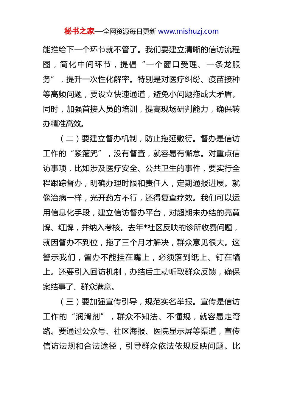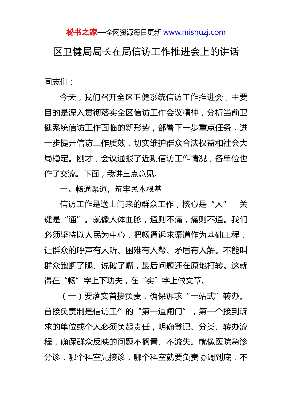 秘书之家—全网资源每日更新 www.mishuzj.com区卫健局局长在局信访工作推进会上的讲话 同志们:今天,我们召开全区卫健系统信访工作推进会,主要目的是深入贯彻落实全区信访工作会议精神,分析当前卫健系统信访工作面临的新形势,部署下一步重点任务,进一步提升信访工作质效,切实维护群众合法权益和社会大局稳定。刚才,会议通报了近期信访工作情况,各单位也作了交流。下面,我讲三点意见。一、畅通渠道,筑牢民本根基信访工作是送上门来的群众工作,核心是“人”,关键是“通”。就像人体血脉,通则不痛,痛则不通。我们必须坚持以人民为中心,把畅通诉求渠道作为基础工程,让群众的呼声有人听、困难有人帮、矛盾有人解。不能叫群众跑断了腿、说破了嘴,最后问题还在原地打转。这就得在“畅”字上下功夫,在“实”字上做文章。(一)要落实首接负责,确保诉求“一站式”转办。首接负责制是信访工作的“第一道闸门”,第一个接到诉求的单位或个人必须负起责任,明确登记、分类、转办流程,确保群众反映的问题不搁置、不流失。就像医院急诊分诊,哪个科室先接诊,哪个科室就要负责协调到底,不秘书之家—全网资源每日更新 www.mishuzj.com能推给下一个环节就不管了。我们要建立清晰的信访流程图,简化中间环节,提倡“一个窗口受理、一条龙服务”,提升一次性化解率。特别是对医疗纠纷、疫苗接种等高频问题,要设立快速通道,避免小问题拖成大矛盾。同时,加强首接人员的培训,提高现场研判能力,确保转办精准高效。(二)要建立督办机制,防止拖延敷衍。督办是信访工作的“紧箍咒”,没有督查,就容易有懈怠。对重点信访事项,比如涉及医疗安全、公共卫生的事件,要实行全程跟踪督办,明确办理时限和责任人,定期通报进展。就像治病一样,光开药方不行,还得复查疗效。我们可以运用信息化手段,建立信访督办平台,对超期未办结的亮黄牌、红牌,并纳入考核。去年*社区反映的诊所收费问题,就因督办不到位,拖了三个月才解决,群众意见很大。这警示我们,督办不能挂在嘴上,必须落到纸上、钉在墙上。还要引入回访机制,办结后主动听取群众反馈,确保案结事了、群众满意。(三)要加强宣传引导,规范实名举报。宣传是信访工作的“润滑剂”,群众不知法、不懂规,就容易走弯路。要通过公众号、社区海报、医院显示屏等渠道,宣传信访法规和合法途径,引导群众依法依规反映问题。比秘书之家—全网资源每日更新 www.mishuzj.com如,多用“以案释法”方式,讲清哪些是有效举报、哪些是无效投诉,减少因误解产生的重复访。对实名举报,要给予优先办理和结果反馈,保护举报人隐私,提升线索可查性。就像看病要挂号,信访也要实名登记,这样问题才能查得清、办得实。我们可以借鉴其他地区经验,对实名举报属实者给予适当鼓励,营造诚信信访氛围。二、法治引领,规范信访秩序法治是信访工作的“压舱石”,没有规矩不成方圆。当前,群众诉求多元复杂,有的涉及政策边界,有的牵扯历史遗留,必须用法治思维框定边界、用法治方式化解矛盾。不能“小闹小解决、大闹大解决”,那样只会乱套。我们要把信访工作全面纳入法治轨道,实现权责明、底数清、依法办、秩序好。(一)要推进信访法治化,落实“五个法治化”要求。法治化不是空话,得具体到类型梳理、程序规范上。比如,对医疗事故争议、医保报销等常见类型,要严格按《信访工作条例》分类处理,明确哪些走行政调解、哪些走司法途径。就像医生治病要分病因,信访也得先诊断类型。今年我们推行“五个法治化”(即受理法治化、办理法治化、监督法治化、化解法治化、管理法治化),就是要确保每一项诉求都依法推进。特别要杜绝“以闹取胜”秘书之家—全网资源每日更新 www.mishuzj.com现象,对无理缠访的,依法终结程序;对合法诉求,快办快结。最近*医院因一起医疗纠纷未按法治程序转办,导致矛盾升级,这教训深刻。我们必须把法治化贯穿全过程,让群众在每一起案件中感受公平。(二)要精准转办交办,实现“四个到位”。转办交办是信访工作的“中枢神经”,差之毫厘谬以千里。要基于问题属性和职责分工,精准分流到医政、疾控、监督等科室...