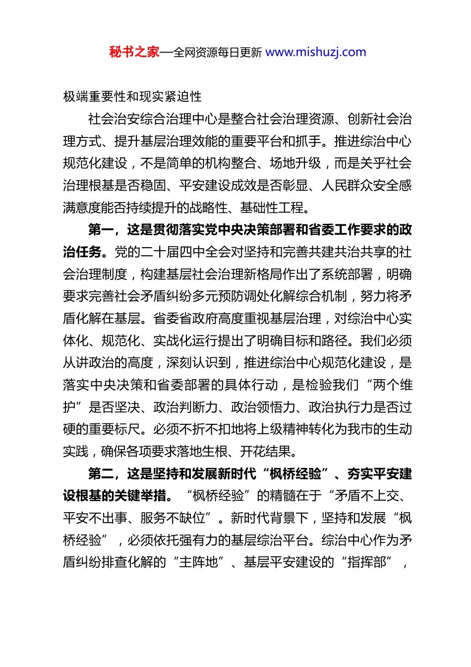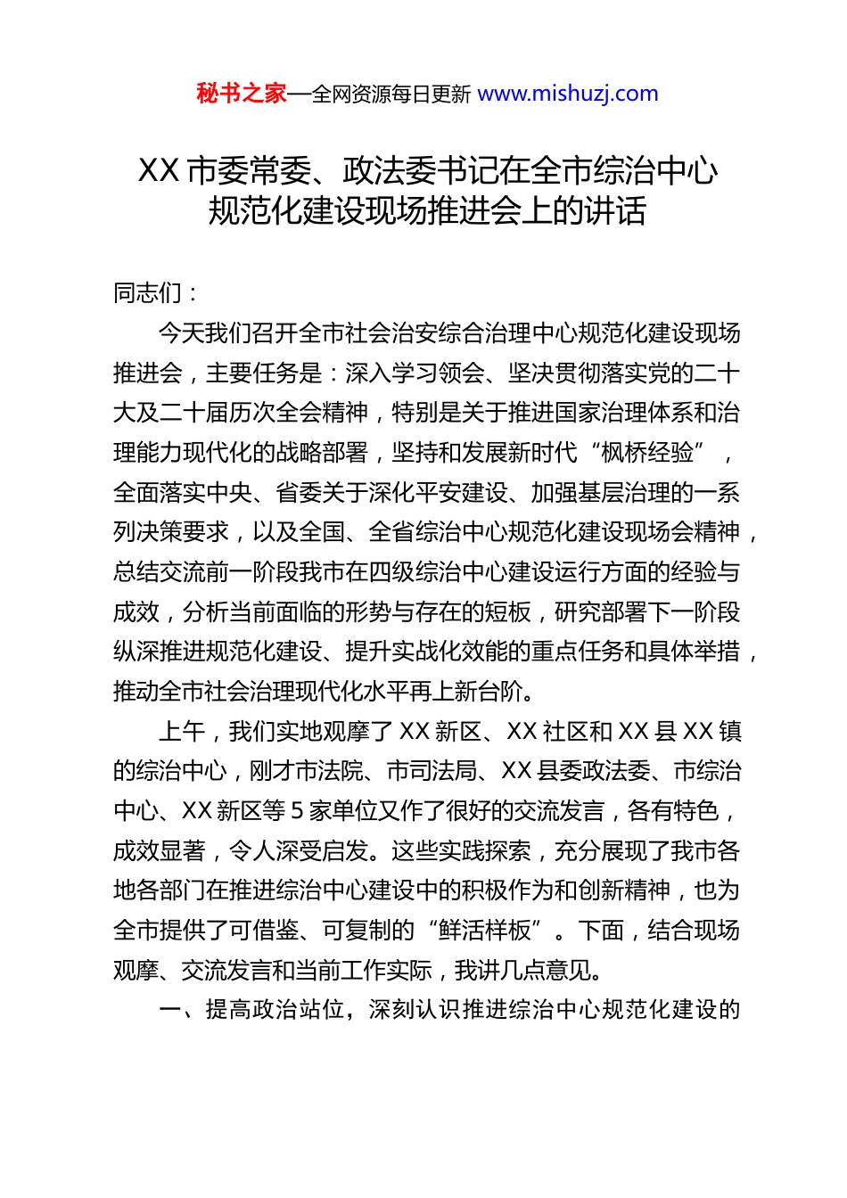 秘书之家—全网资源每日更新 www.mishuzj.comXX 市委常委、政法委书记在全市综治中心规范化建设现场推进会上的讲话同志们:今天我们召开全市社会治安综合治理中心规范化建设现场推进会,主要任务是:深入学习领会、坚决贯彻落实党的二十大及二十届历次全会精神,特别是关于推进国家治理体系和治理能力现代化的战略部署,坚持和发展新时代“枫桥经验”,全面落实中央、省委关于深化平安建设、加强基层治理的一系列决策要求,以及全国、全省综治中心规范化建设现场会精神,总结交流前一阶段我市在四级综治中心建设运行方面的经验与成效,分析当前面临的形势与存在的短板,研究部署下一阶段纵深推进规范化建设、提升实战化效能的重点任务和具体举措,推动全市社会治理现代化水平再上新台阶。上午,我们实地观摩了 XX 新区、XX 社区和 XX 县 XX 镇的综治中心,刚才市法院、市司法局、XX 县委政法委、市综治中心、XX 新区等 5 家单位又作了很好的交流发言,各有特色,成效显著,令人深受启发。这些实践探索,充分展现了我市各地各部门在推进综治中心建设中的积极作为和创新精神,也为全市提供了可借鉴、可复制的“鲜活样板”。下面,结合现场观摩、交流发言和当前工作实际,我讲几点意见。一、提高政治站位,深刻认识推进综治中心规范化建设的秘书之家—全网资源每日更新 www.mishuzj.com极端重要性和现实紧迫性社会治安综合治理中心是整合社会治理资源、创新社会治理方式、提升基层治理效能的重要平台和抓手。推进综治中心规范化建设,不是简单的机构整合、场地升级,而是关乎社会治理根基是否稳固、平安建设成效是否彰显、人民群众安全感满意度能否持续提升的战略性、基础性工程。第一,这是贯彻落实党中央决策部署和省委工作要求的政治任务。党的二十届四中全会对坚持和完善共建共治共享的社会治理制度,构建基层社会治理新格局作出了系统部署,明确要求完善社会矛盾纠纷多元预防调处化解综合机制,努力将矛盾化解在基层。省委省政府高度重视基层治理,对综治中心实体化、规范化、实战化运行提出了明确目标和路径。我们必须从讲政治的高度,深刻认识到,推进综治中心规范化建设,是落实中央决策和省委部署的具体行动,是检验我们“两个维护”是否坚决、政治判断力、政治领悟力、政治执行力是否过硬的重要标尺。必须不折不扣地将上级精神转化为我市的生动实践,确保各项要求落地生根、开花结果。第二,这是坚持和发展新时代“枫桥经验”、夯实平安建设根基的关键举措。“枫桥经验”的精髓在于“矛盾不上交、平安不出事、服务不缺位”。新时代背景下,坚持和发展“枫桥经验”,必须依托强有力的基层综治平台。综治中心作为矛盾纠纷排查化解的“主阵地”、基层平安建设的“指挥部”,秘书之家—全网资源每日更新 www.mishuzj.com其规范化水平直接决定了我们能否有效吸附和化解矛盾纠纷在基层、在萌芽状态。只有把综治中心建强、规范、用活,才能真正构筑起维护社会稳定的“第一道防线”,实现“小事不出村、大事不出镇、矛盾不上交”的目标,为更高水平的平安 XX建设奠定坚实基础。第三,这是破解当前社会治理难题、提升市域社会治理效能的现实需要。当前,我国改革发展稳定任务艰巨繁重,社会结构深刻变动,利益格局深刻调整,思想观念深刻变化,各类矛盾风险交织叠加,社会治理面临许多新挑战新课题。从我市情况看,矛盾纠纷总量依然较大,且呈现出主体多元、类型多样、诉求复杂、化解难度增加等特点。传统分散的、条块分割的治理模式难以适应新形势要求。推进综治中心规范化建设,核心就是要通过整合资源、优化机制、规范流程、强化协同,变“单打独斗”为“联合作战”,变“被动应对”为“主动预防”,变“信息孤岛”为“数据共享”,从而有效提升我们预测预警预防各类风险、化解复杂矛盾、服务人民群众的能力和水平,走出一条具有 XX 特色的社会治理新路子。第四,这是践行以人民为中心发展思想、增进民生福祉的必然要求。社会治理的核心是人,最好的治理是服务。综治中心直接面向基层、面对群众,是党和政府联系服务群众的“桥梁纽带”。一个规范化、高效能运行...