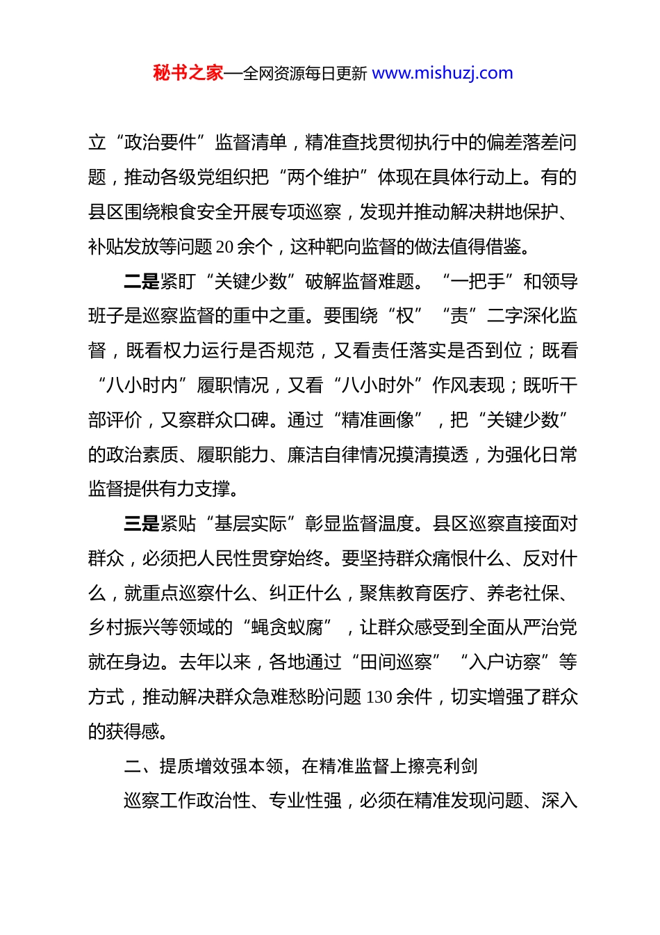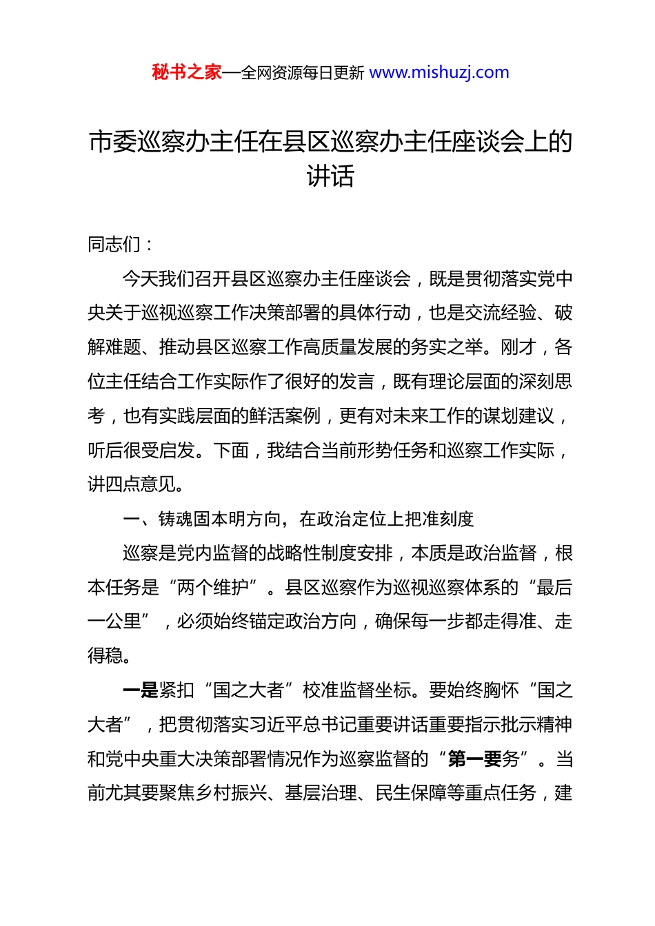 秘书之家—全网资源每日更新 www.mishuzj.com市委巡察办主任在县区巡察办主任座谈会上的讲话 同志们:今天我们召开县区巡察办主任座谈会,既是贯彻落实党中央关于巡视巡察工作决策部署的具体行动,也是交流经验、破解难题、推动县区巡察工作高质量发展的务实之举。刚才,各位主任结合工作实际作了很好的发言,既有理论层面的深刻思考,也有实践层面的鲜活案例,更有对未来工作的谋划建议,听后很受启发。下面,我结合当前形势任务和巡察工作实际,讲四点意见。一、铸魂固本明方向,在政治定位上把准刻度巡察是党内监督的战略性制度安排,本质是政治监督,根本任务是“两个维护”。县区巡察作为巡视巡察体系的“最后一公里”,必须始终锚定政治方向,确保每一步都走得准、走得稳。一是紧扣“国之大者”校准监督坐标。要始终胸怀“国之大者”,把贯彻落实习近平总书记重要讲话重要指示批示精神和党中央重大决策部署情况作为巡察监督的“第一要务”。当前尤其要聚焦乡村振兴、基层治理、民生保障等重点任务,建秘书之家—全网资源每日更新 www.mishuzj.com立“政治要件”监督清单,精准查找贯彻执行中的偏差落差问题,推动各级党组织把“两个维护”体现在具体行动上。有的县区围绕粮食安全开展专项巡察,发现并推动解决耕地保护、补贴发放等问题 20 余个,这种靶向监督的做法值得借鉴。二是紧盯“关键少数”破解监督难题。“一把手”和领导班子是巡察监督的重中之重。要围绕“权”“责”二字深化监督,既看权力运行是否规范,又看责任落实是否到位;既看“八小时内”履职情况,又看“八小时外”作风表现;既听干部评价,又察群众口碑。通过“精准画像”,把“关键少数”的政治素质、履职能力、廉洁自律情况摸清摸透,为强化日常监督提供有力支撑。三是紧贴“基层实际”彰显监督温度。县区巡察直接面对群众,必须把人民性贯穿始终。要坚持群众痛恨什么、反对什么,就重点巡察什么、纠正什么,聚焦教育医疗、养老社保、乡村振兴等领域的“蝇贪蚁腐”,让群众感受到全面从严治党就在身边。去年以来,各地通过“田间巡察”“入户访察”等方式,推动解决群众急难愁盼问题 130 余件,切实增强了群众的获得感。二、提质增效强本领,在精准监督上擦亮利剑巡察工作政治性、专业性强,必须在精准发现问题、深入秘书之家—全网资源每日更新 www.mishuzj.com分析问题、推动解决问题上下功夫,让巡察利剑更光更亮。一是创新方式方法破解监督瓶颈。要打破“常规巡察套路化”困境,探索“常规巡察+专项打法”模式,针对不同领域特点制定专项监督指引,以“小切口”深查“大问题”。比如,对民生部门侧重资金流向监督,对执法单位聚焦执法规范化检查,对村级组织突出惠民政策落实排查。同时要善用大数据手段,整合信访、审计等数据资源,提升问题发现的精准度。二是深化联动贯通凝聚监督合力。要树立“一盘棋”思想,推动巡察与纪检监察、审计、组织等监督贯通协调。在巡前共享信息、巡中协同核查、巡后联动整改,构建“巡察全程统筹、纪检跟进办案、审计穿透监督”的工作体系。今年,部分县区建立巡察与专项整治融合机制,在巡察中同步推进群众身边腐败问题整治,取得了“1+1>2”的效果。三是聚焦基层延伸打通监督末梢。村级组织是党的执政根基,对村巡察必须抓细抓实。要紧扣乡村振兴、村级“三资”管理等重点,盯紧村支书、村会计等关键岗位,严查虚报冒领、权力滥用等问题。通过建立“群众点题、党组织答题、群众评题”的工作闭环,把对村巡察成效的评判权交给群众,真正打通全面从严治党“最后一公里”。三、标本兼治求实效,在整改落实上压实责任秘书之家—全网资源每日更新 www.mishuzj.com做好巡察“后半篇文章”,整改是关键。要坚持发现问题与整改落实并重,以严的要求、实的举措推动整改见底见效。一是压实整改责任不松劲。被巡察党组织的整改主体责任是整改落实的“牛鼻子”。要督促党组织书记履行第一责任人职责,做到亲自研究方案、亲自部署任务、亲自督办进度,班子成员落实“一岗双责”,主动认领责任。建立整改“清单制+责任制”,明确问题、任务、责任“三张清单”,实行整...