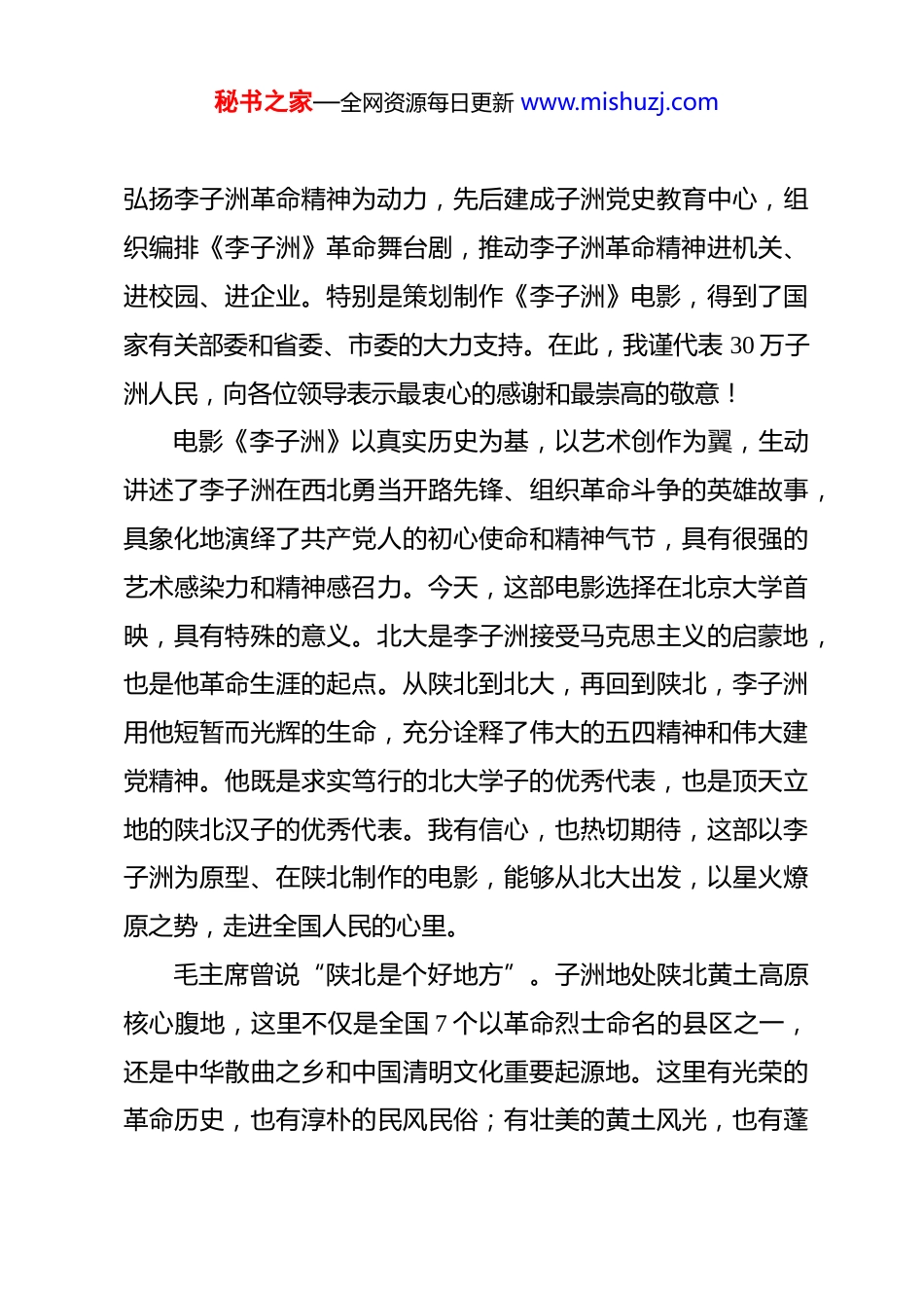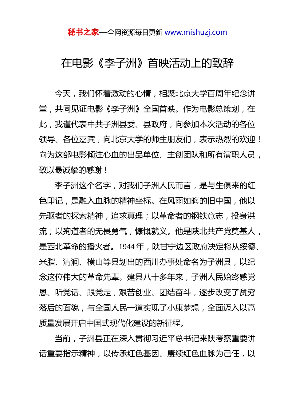 秘书之家—全网资源每日更新 www.mishuzj.com在电影《李子洲》首映活动上的致辞今天,我们怀着激动的心情,相聚北京大学百周年纪念讲堂,共同见证电影《李子洲》全国首映。作为电影总策划,在此,我谨代表中共子洲县委、县政府,向参加本次活动的各位领导、各位嘉宾,向北京大学的师生朋友们,表示热烈的欢迎!向为这部电影倾注心血的出品单位、主创团队和所有演职人员,致以最诚挚的感谢!李子洲这个名字,对我们子洲人民而言,是与生俱来的红色印记,是融入血脉的精神坐标。在风雨如晦的旧中国,他以先驱者的探索精神,追求真理;以革命者的钢铁意志,投身洪流;以殉道者的无畏勇气,慷慨就义。他是陕北共产党奠基人,是西北革命的播火者。1944 年,陕甘宁边区政府决定将从绥德、米脂、清涧、横山等县划出的西川办事处命名为子洲县,以纪念这位伟大的革命先辈。建县八十多年来,子洲人民始终感党恩、听党话、跟党走,艰苦创业、团结奋斗,逐步改变了贫穷落后的面貌,与全国人民一道实现了小康梦想,全面迈入以高质量发展开启中国式现代化建设的新征程。当前,子洲县正在深入贯彻习近平总书记来陕考察重要讲话重要指示精神,以传承红色基因、赓续红色血脉为己任,以秘书之家—全网资源每日更新 www.mishuzj.com弘扬李子洲革命精神为动力,先后建成子洲党史教育中心,组织编排《李子洲》革命舞台剧,推动李子洲革命精神进机关、进校园、进企业。特别是策划制作《李子洲》电影,得到了国家有关部委和省委、市委的大力支持。在此,我谨代表 30 万子洲人民,向各位领导表示最衷心的感谢和最崇高的敬意!电影《李子洲》以真实历史为基,以艺术创作为翼,生动讲述了李子洲在西北勇当开路先锋、组织革命斗争的英雄故事,具象化地演绎了共产党人的初心使命和精神气节,具有很强的艺术感染力和精神感召力。今天,这部电影选择在北京大学首映,具有特殊的意义。北大是李子洲接受马克思主义的启蒙地,也是他革命生涯的起点。从陕北到北大,再回到陕北,李子洲用他短暂而光辉的生命,充分诠释了伟大的五四精神和伟大建党精神。他既是求实笃行的北大学子的优秀代表,也是顶天立地的陕北汉子的优秀代表。我有信心,也热切期待,这部以李子洲为原型、在陕北制作的电影,能够从北大出发,以星火燎原之势,走进全国人民的心里。毛主席曾说“陕北是个好地方”。子洲地处陕北黄土高原核心腹地,这里不仅是全国 7 个以革命烈士命名的县区之一,还是中华散曲之乡和中国清明文化重要起源地。这里有光荣的革命历史,也有淳朴的民风民俗;有壮美的黄土风光,也有蓬秘书之家—全网资源每日更新 www.mishuzj.com勃的发展活力。借此机会,我诚挚邀请各位领导嘉宾和各界朋友关注子洲、走进子洲、了解子洲。我坚信,越多人知道子洲,就越能够把李子洲革命精神传承好、弘扬好,就越能够为子洲发展和老区振兴注入更大动能。最后,预祝电影《李子洲》首映取得圆满成功! 祝愿各位领导、各位嘉宾,老师、同学们,身体健康、阖家幸福、万事顺意!谢谢大家!