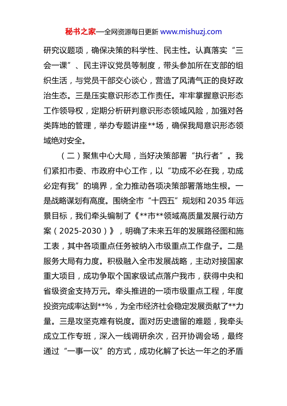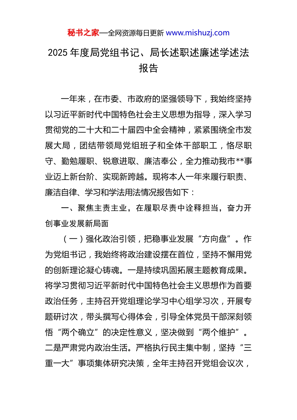 秘书之家—全网资源每日更新 www.mishuzj.com2025 年度局党组书记、局长述职述廉述学述法报告 一年来,在市委、市政府的坚强领导下,我始终坚持以习近平新时代中国特色社会主义思想为指导,深入学习贯彻党的二十大和二十届四中全会精神,紧紧围绕全市发展大局,团结带领局党组班子和全体干部职工,恪尽职守、勤勉履职、锐意进取、廉洁奉公,全力推动我市**事业迈上新台阶、实现新跨越。现将本人一年来履行职责、廉洁自律、学习和学法用法情况报告如下:一、聚焦主责主业,在履职尽责中诠释担当,奋力开创事业发展新局面(一)强化政治引领,把稳事业发展“方向盘”。作为党组书记,我始终将政治建设摆在首位,坚持不懈用党的创新理论凝心铸魂。一是持续巩固拓展主题教育成果。将学习贯彻习近平新时代中国特色社会主义思想作为首要政治任务,主持召开党组理论学习中心组学习次,开展专题研讨次,带头撰写心得体会,引导全体党员干部深刻领悟“两个确立”的决定性意义,坚决做到“两个维护”。二是严肃党内政治生活。严格执行民主集中制,坚持“三重一大”事项集体研究决策,全年主持召开党组会议次,秘书之家—全网资源每日更新 www.mishuzj.com研究议题项,确保决策的科学性、民主性。认真落实“三会一课”、民主评议党员等制度,带头参加所在支部的组织生活,与党员干部交心谈心,营造了风清气正的良好政治生态。三是压实意识形态工作责任。牢牢掌握意识形态工作领导权,定期分析研判意识形态领域风险,加强对各类阵地的管理,举办专题讲座**场,确保我局意识形态领域绝对安全。(二)聚焦中心大局,当好决策部署“执行者”。我们紧扣市委、市政府中心工作,以“功成不必在我,功成必定有我”的境界,全力推动各项决策部署落地生根。一是战略谋划有高度。围绕全市“十四五”规划和 2035 年远景目标,我们牵头编制了《**市**领域高质量发展行动方案(2025-2030)》,明确了未来五年的发展路径图和施工表,其中各项重点任务被纳入市级重点工作盘子。二是服务大局有力度。积极融入全市发展战略,主动对接国家重大项目,成功争取个国家级试点落户我市,获得中央和省级资金支持万元。牵头推进的一项市级重点工程,年度投资完成率达到**%,为全市经济社会稳定发展贡献了**力量。三是攻坚克难有锐度。面对历史遗留的难题,我牵头成立工作专班,深入一线调研余次,召开协调会场,最终通过“一事一议”的方式,成功化解了长达一年之的矛盾秘书之家—全网资源每日更新 www.mishuzj.com纠纷,得到了群众和企业的高度评价。(三)突出发展要务,跑出高质量发展“加速度”。我们坚持以新发展理念为引领,聚焦主业、深耕细作,推动**事业在多个维度实现突破。一是核心指标稳中有进。截至年底,我市**领域主要业务指标同比增长**%,增速位列全省前茅。累计完成投资亿元,带动相关产业产值亿元。二是改革创新激发活力。深化“放管服”改革,推动各项行政审批事项实现“全程网办”,平均办理时限压缩%。探索实施“**+”新模式,成功打造了一个具有区域影响力的创新平台,吸引了多家优质企业入驻。三是产业能级持续提升。我们着力延链补链强链,成功引进了投资额超亿元的头部企业,培育了**家“专精特新”企业,初步形成了上下游协同、优势互补的产业生态圈。(四)践行人民至上,绘就民生福祉“同心圆”。我们始终坚持发展为了人民、发展依靠人民、发展成果由人民共享,用心用情用力解决群众急难愁盼问题。一是民生实事办得更实。年初承诺的各项民生实事项目已全部提前完成。投入资金万元,对一个老旧小区进行了**设施改造,惠及居民户。开展“我为群众办实事”实践活动场次,解决群众反映强烈的热点难点问题个。二是服务效能变得更优。建立健全了领导干部下访接访制度,我本人全秘书之家—全网资源每日更新 www.mishuzj.com年接待来访群众批次,现场解决问题个。开通了“**服务热线”,24 小时回应群众关切,群众满意度测评达到%以上。三是安全底线守得更牢。始终将安全生产放在压倒性位置,组织开展安全生产大检查次,排查整改隐患处。全年未发生较大及以上安全生产事故,确保了**领域的...