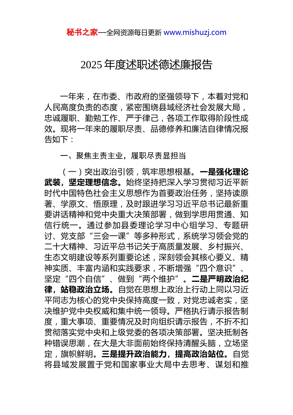 秘书之家—全网资源每日更新 www.mishuzj.com2025 年度述职述德述廉报告一年来,在市委、市政府的坚强领导下,本着对党和人民高度负责的态度,紧密围绕县域经济社会发展大局,忠诚履职、勤勉工作、严于律己,各项工作取得阶段性成效。现将一年来的履职尽责、品德修养和廉洁自律情况报告如下:一、聚焦主责主业,履职尽责显担当(一)突出政治引领,筑牢思想根基。一是强化理论武装,坚定理想信念。始终坚持把深入学习贯彻习近平新时代中国特色社会主义思想作为首要政治任务,坚持读原著、学原文、悟原理,及时跟进学习习近平总书记最新重要讲话精神和党中央重大决策部署,做到学思用贯通、知信行统一。通过参加县委理论学习中心组学习、专题研讨、党支部“三会一课”等多种形式,系统学习领会党的二十大精神、习近平总书记关于高质量发展、乡村振兴、生态文明建设等系列重要论述,深刻领会其核心要义、精神实质、丰富内涵和实践要求,不断增强“四个意识”、坚定“四个自信”、做到“两个维护”。二是严明政治纪律,站稳政治立场。自觉在思想上政治上行动上同以习近平同志为核心的党中央保持高度一致,对党忠诚老实,坚决维护党中央权威和集中统一领导。严格执行请示报告制度,重大事项、重要情况及时向组织请示报告,不折不扣贯彻落实党中央和上级党委的各项决策部署。坚决抵制各种错误思潮,在大是大非面前始终保持清醒头脑,立场坚定,旗帜鲜明。三是提升政治能力,提高政治站位。自觉将县域发展置于党和国家事业大局中去思考、谋划和推秘书之家—全网资源每日更新 www.mishuzj.com动,善于从政治角度看待问题、分析问题、解决问题,不断提高政治判断力、政治领悟力、政治执行力。在具体工作中,注重把讲政治的要求贯穿于经济社会发展的各方面全过程,确保各项工作始终沿着正确的政治方向前进,为县域发展提供坚强政治保证。(二)聚焦发展要务,推动经济提质增效。一是狠抓项目建设,激发经济发展新动能。坚持“项目为王”理念,深度谋划、精准招商,全年累计引进重大产业项目 x个,总投资达 x 亿元,涵盖新能源、高端制造、数字经济等多个领域。聚焦重点项目建设,持续优化营商环境,推行“妈妈式”服务,实行领导包联制度,协调解决项目推进中的难点堵点问题。例如,在 x 新能源产业园建设过程中,针对土地供应、环评手续等瓶颈问题,多次召开专题协调会,推动项目前期工作顺利完成,目前已有多家企业入驻投产,预计年产值可达 x 亿元。二是优化产业结构,构建现代化产业体系。积极引导传统产业转型升级,推动数字技术与实体经济深度融合,培育壮大战略性新兴产业。推进 x传统优势产业改造升级,实施“智改数转”工程,扶持 x 家规上企业完成智能化改造,提升生产效率和产品附加值。同时,大力发展 x、x 等现代农业,推广订单农业、品牌农业,带动农民增收致富。例如,在 x 乡镇,通过发展 x 特色农产品种植与深加工,不仅解决了当地农产品销售难题,还形成了集种植、加工、销售于一体的产业链,带动 x 户农民年均增收 x 元。三是深化改革创新,增强区域发展内生动力。坚定不移全面深化改革,以改革促发展、以创新激活力。深入推进“放管服”改革,精简行政审批事项 x 项,审批效率平均提升 x%,进一步激发市场主体活力。例如,针对企业反映的融资难问题,积极搭建政银企合作平台,推动 x 银行与 x 家中小微企业达成意向贷款 x 亿元。同时,注重科技创新驱动,鼓励企业加大研发投入,推动产学研深秘书之家—全网资源每日更新 www.mishuzj.com度融合,全年新增高新技术企业 x 家,有效提升了县域科技创新能力。(三)心系民生福祉,增进群众获得感。一是加强社会保障,兜牢民生底线。坚持以人民为中心的发展思想,持续加大民生投入,办好人民群众关心的实事好事。全面落实各项社会救助政策,全年发放低保、特困供养、残疾人补贴等各类救助资金 x 万元,惠及 x 人次。加强医疗保障体系建设,县域医保参保率达到 x%,异地就医结算更加便捷高效。优化养老服务供给,新增社区居家养老服务中心 x个,农村互助幸福院 x 个,努力让老年人...