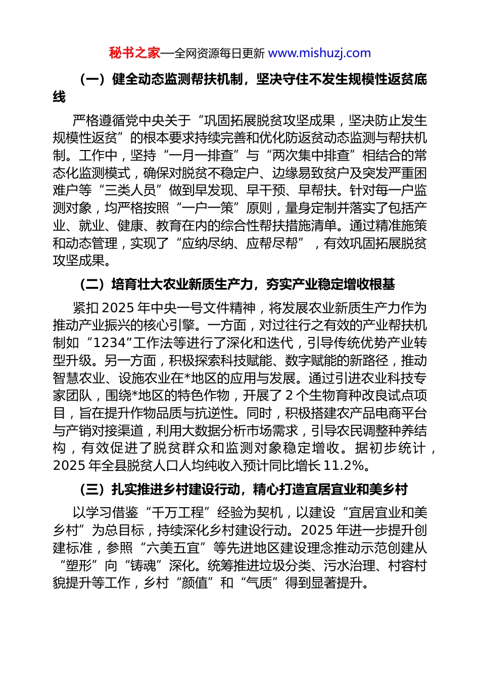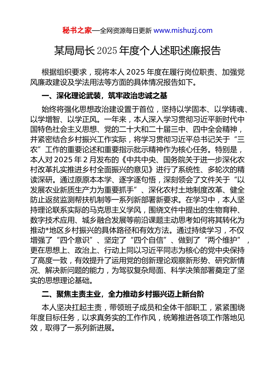 秘书之家—全网资源每日更新 www.mishuzj.com某局局长 2025 年度个人述职述廉报告根据组织要求,现将本人 2025 年度在履行岗位职责、加强党风廉政建设及学法用法等方面的具体情况报告如下。一、深化理论武装,筑牢政治忠诚之基始终将强化思想政治建设置于首位,坚持以学固本、以学铸魂、以学增智、以学正风。一年来,本人深入学习贯彻习近平新时代中国特色社会主义思想、党的二十大和二十届三中、四中全会精神,并紧密结合乡村振兴工作实际,将学习贯彻习近平总书记关于“三农”工作的重要论述和重要指示批示精神作为核心任务。特别是,本人对 2025 年 2 月发布的《中共中央、国务院关于进一步深化农村改革扎实推进乡村全面振兴的意见》进行了系统性、多轮次的精读深研。通过原原本本学、逐字逐句悟,深刻领会了文件关于“以发展农业新质生产力为重要抓手”、深化农村土地制度改革、健全防止返贫监测帮扶机制等一系列新部署新要求。在学习中,本人坚持理论联系实际的马克思主义学风,围绕文件中提出的生物育种、数字技术应用、城乡融合发展等前沿课题主动思考如何将其转化为推动*地区乡村振兴的具体路径和有效方法。通过持续学习,不仅增强了“四个意识”、坚定了“四个自信”、做到了“两个维护”,更在思想上、政治上、行动上同以习近平同志为核心的党中央保持了高度一致,有效提升了运用党的创新理论观察新形势、研究新情况、解决新问题的能力,为驾驭复杂局面、科学决策部署奠定了坚实的思想理论基础。二、聚焦主责主业,全力推动乡村振兴迈上新台阶本人坚决扛起主责,带领班子成员和全体干部职工,紧紧围绕年度目标任务,以求真务实的工作作风,统筹推进各项工作落地见效,取得了一系列新进展。秘书之家—全网资源每日更新 www.mishuzj.com(一)健全动态监测帮扶机制,坚决守住不发生规模性返贫底线严格遵循党中央关于“巩固拓展脱贫攻坚成果,坚决防止发生规模性返贫”的根本要求持续完善和优化防返贫动态监测与帮扶机制。工作中,坚持“一月一排查”与“两次集中排查”相结合的常态化监测模式,确保对脱贫不稳定户、边缘易致贫户及突发严重困难户等“三类人员”做到早发现、早干预、早帮扶。针对每一户监测对象,均严格按照“一户一策”原则,量身定制并落实了包括产业、就业、健康、教育在内的综合性帮扶措施清单。通过精准施策和动态管理,实现了“应纳尽纳、应帮尽帮”,有效巩固拓展脱贫攻坚成果。(二)培育壮大农业新质生产力,夯实产业稳定增收根基紧扣 2025 年中央一号文件精神,将发展农业新质生产力作为推动产业振兴的核心引擎。一方面,对过往行之有效的产业帮扶机制如“1234”工作法等进行了深化和迭代,引导传统优势产业转型升级。另一方面,积极探索科技赋能、数字赋能的新路径,推动智慧农业、设施农业在*地区的应用与发展。通过引进农业科技专家团队,围绕*地区的特色作物,开展了 2 个生物育种改良试点项目,旨在提升作物品质与抗逆性。同时,积极搭建农产品电商平台与产销对接渠道,利用大数据分析市场需求,引导农民调整种养结构,有效促进了脱贫群众和监测对象稳定增收。据初步统计,2025 年全县脱贫人口人均纯收入预计同比增长 11.2%。(三)扎实推进乡村建设行动,精心打造宜居宜业和美乡村以学习借鉴“千万工程”经验为契机,以建设“宜居宜业和美乡村”为总目标,持续深化乡村建设行动。2025 年进一步提升创建标准,参照“六美五宜”等先进地区建设理念推动示范创建从“塑形”向“铸魂”深化。统筹推进垃圾分类、污水治理、村容村貌提升等工作,乡村“颜值”和“气质”得到显著提升。秘书之家—全网资源每日更新 www.mishuzj.com(四)强化项目资金闭环管理,提升财政涉农资金使用效能资金项目管理是乡村振兴的生命线。2025 年,我局严格执行项目管理制度,对全县乡村振兴项目库实行动态管理,确保项目储备科学、精准。全年共统筹整合使用各级财政涉农资金 2.15 亿元,支持实施了涵盖产业发展、基础设施、公共服务等领域的重点项目462 个,撬动社会资本投入超亿元。这些项目的实施,有力地改善了农村生产生活条件。参照已获...