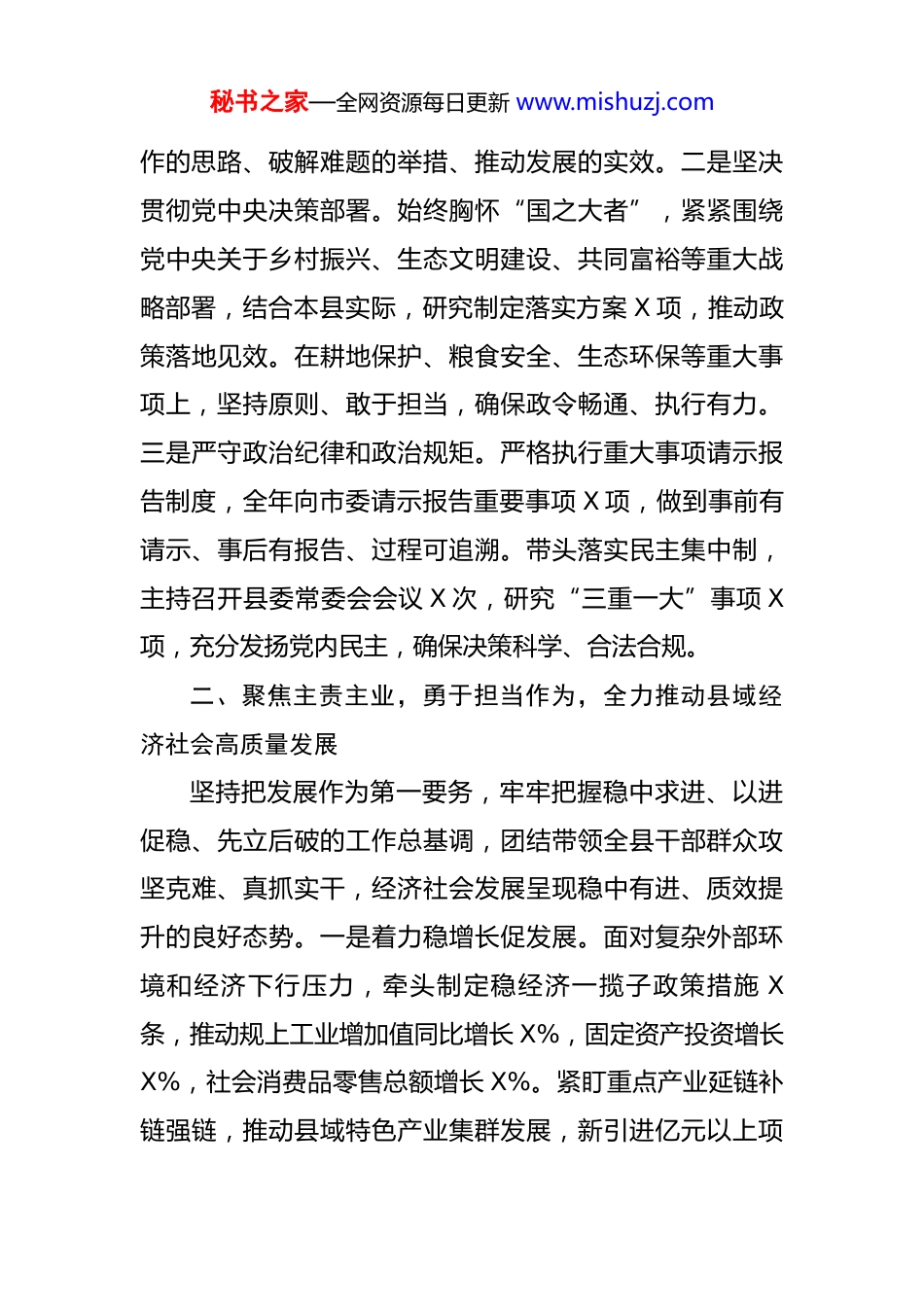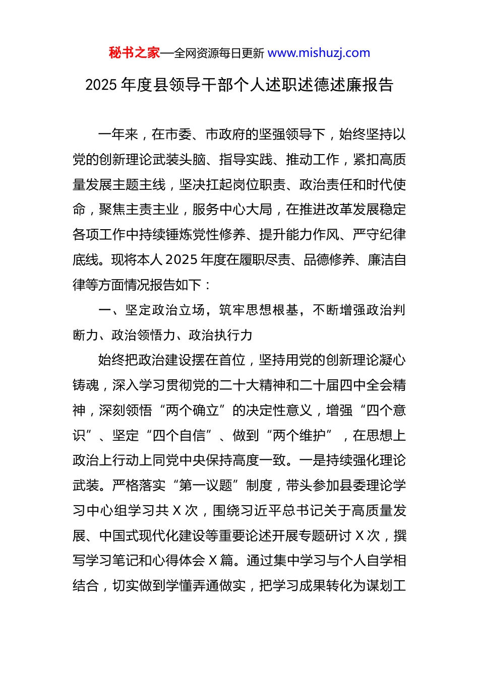 秘书之家—全网资源每日更新 www.mishuzj.com2025 年度县领导干部个人述职述德述廉报告 一年来,在市委、市政府的坚强领导下,始终坚持以党的创新理论武装头脑、指导实践、推动工作,紧扣高质量发展主题主线,坚决扛起岗位职责、政治责任和时代使命,聚焦主责主业,服务中心大局,在推进改革发展稳定各项工作中持续锤炼党性修养、提升能力作风、严守纪律底线。现将本人 2025 年度在履职尽责、品德修养、廉洁自律等方面情况报告如下: 一、坚定政治立场,筑牢思想根基,不断增强政治判断力、政治领悟力、政治执行力始终把政治建设摆在首位,坚持用党的创新理论凝心铸魂,深入学习贯彻党的二十大精神和二十届四中全会精神,深刻领悟“两个确立”的决定性意义,增强“四个意识”、坚定“四个自信”、做到“两个维护”,在思想上政治上行动上同党中央保持高度一致。一是持续强化理论武装。严格落实“第一议题”制度,带头参加县委理论学习中心组学习共 X 次,围绕习近平总书记关于高质量发展、中国式现代化建设等重要论述开展专题研讨 X 次,撰写学习笔记和心得体会 X 篇。通过集中学习与个人自学相结合,切实做到学懂弄通做实,把学习成果转化为谋划工秘书之家—全网资源每日更新 www.mishuzj.com作的思路、破解难题的举措、推动发展的实效。二是坚决贯彻党中央决策部署。始终胸怀“国之大者”,紧紧围绕党中央关于乡村振兴、生态文明建设、共同富裕等重大战略部署,结合本县实际,研究制定落实方案 X 项,推动政策落地见效。在耕地保护、粮食安全、生态环保等重大事项上,坚持原则、敢于担当,确保政令畅通、执行有力。三是严守政治纪律和政治规矩。严格执行重大事项请示报告制度,全年向市委请示报告重要事项 X 项,做到事前有请示、事后有报告、过程可追溯。带头落实民主集中制,主持召开县委常委会会议 X 次,研究“三重一大”事项 X项,充分发扬党内民主,确保决策科学、合法合规。二、聚焦主责主业,勇于担当作为,全力推动县域经济社会高质量发展坚持把发展作为第一要务,牢牢把握稳中求进、以进促稳、先立后破的工作总基调,团结带领全县干部群众攻坚克难、真抓实干,经济社会发展呈现稳中有进、质效提升的良好态势。一是着力稳增长促发展。面对复杂外部环境和经济下行压力,牵头制定稳经济一揽子政策措施 X条,推动规上工业增加值同比增长 X%,固定资产投资增长X%,社会消费品零售总额增长 X%。紧盯重点产业延链补链强链,推动县域特色产业集群发展,新引进亿元以上项秘书之家—全网资源每日更新 www.mishuzj.com目 X 个,实际利用外资 X 万美元。深化“放管服”改革,持续优化营商环境,企业开办时间压缩至 X 个工作日内,市场主体总量同比增长 X%。二是全面推进乡村振兴。深入实施乡村振兴战略,统筹推进产业、人才、文化、生态、组织振兴。完成高标准农田建设 X 万亩,粮食总产量达 X万吨,实现“二十一连丰”。大力发展乡村特色产业,培育农业龙头企业 X 家,打造区域公用品牌 X 个,农村居民人均可支配收入增长 X%。扎实推进农村人居环境整治提升行动,完成户厕改造 X 万户,行政村生活垃圾有效治理率达 X%,X 个村庄入选省级美丽乡村示范村。三是切实增进民生福祉。坚持以人民为中心的发展思想,全年民生支出占一般公共预算支出比重达 X%。新建改扩建中小学幼儿园X 所,新增学位 X 个;县人民医院新院区建成投用,基层医疗卫生机构标准化建设覆盖率提升至 X%。城镇新增就业X 人,城乡居民基本养老保险参保率达 X%。扎实推进“我为群众办实事”实践活动,解决群众急难愁盼问题 X 件,群众满意度持续提升。四是有效防范化解风险。统筹发展和安全,压实安全生产责任制,全年未发生较大及以上生产安全事故。加强政府债务管理,稳妥化解隐性债务 X 亿元,债务风险总体可控。常态化开展矛盾纠纷排查化解,信访总量同比下降 X%。依法打击电信网络诈骗等违法犯罪秘书之家—全网资源每日更新 www.mishuzj.com行为,群众安全感指数达 X%。三、加强党性锻炼,涵养道德品行,始终做到明大德、守公德、严私德始终把立德修...