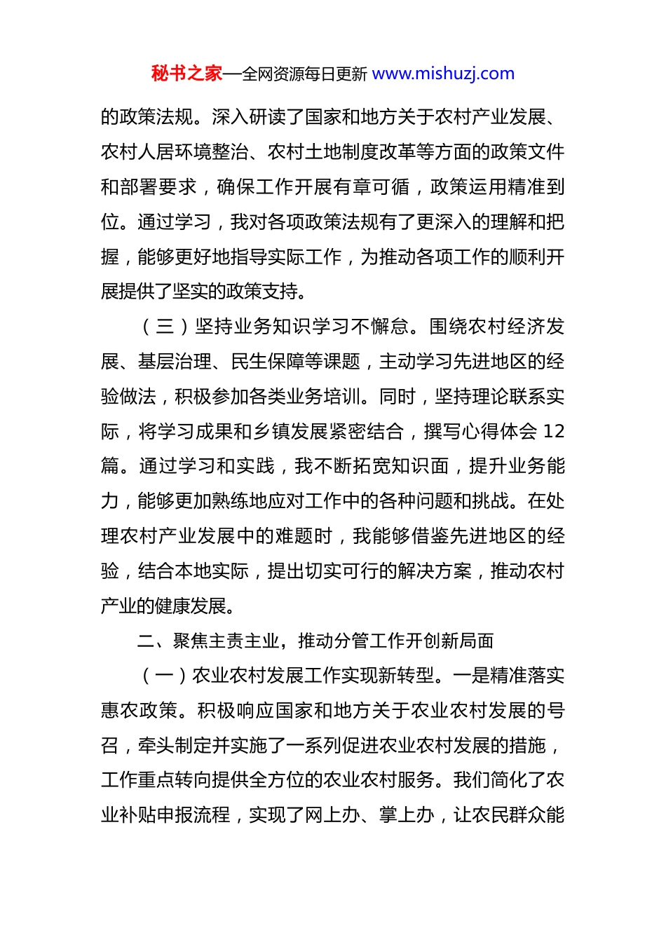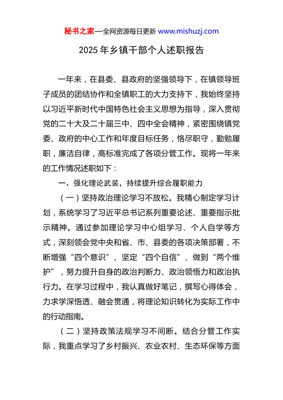 秘书之家—全网资源每日更新 www.mishuzj.com2025 年乡镇干部个人述职报告 一年来,在县委、县政府的坚强领导下,在镇领导班子成员的团结协作和全镇职工的大力支持下,我始终坚持以习近平新时代中国特色社会主义思想为指导,深入贯彻党的二十大及二十届三中、四中全会精神,紧密围绕镇党委、政府的中心工作和年度目标任务,恪尽职守,勤勉履职,廉洁自律,高标准完成了各项分管工作。现将一年来的工作情况述职如下:一、强化理论武装,持续提升综合履职能力(一)坚持政治理论学习不放松。我精心制定学习计划,系统学习了习近平总书记系列重要论述、重要指示批示精神。通过参加理论学习中心组学习、个人自学等方式,深刻领会党中央和省、市、县委的各项决策部署,不断增强“四个意识”、坚定“四个自信”、做到“两个维护”,努力提升自身的政治判断力、政治领悟力和政治执行力。在学习过程中,我认真做好笔记,撰写心得体会,力求学深悟透、融会贯通,将理论知识转化为实际工作中的行动指南。(二)坚持政策法规学习不间断。结合分管工作实际,我重点学习了乡村振兴、农业农村、生态环保等方面秘书之家—全网资源每日更新 www.mishuzj.com的政策法规。深入研读了国家和地方关于农村产业发展、农村人居环境整治、农村土地制度改革等方面的政策文件和部署要求,确保工作开展有章可循,政策运用精准到位。通过学习,我对各项政策法规有了更深入的理解和把握,能够更好地指导实际工作,为推动各项工作的顺利开展提供了坚实的政策支持。(三)坚持业务知识学习不懈怠。围绕农村经济发展、基层治理、民生保障等课题,主动学习先进地区的经验做法,积极参加各类业务培训。同时,坚持理论联系实际,将学习成果和乡镇发展紧密结合,撰写心得体会 12篇。通过学习和实践,我不断拓宽知识面,提升业务能力,能够更加熟练地应对工作中的各种问题和挑战。在处理农村产业发展中的难题时,我能够借鉴先进地区的经验,结合本地实际,提出切实可行的解决方案,推动农村产业的健康发展。二、聚焦主责主业,推动分管工作开创新局面(一)农业农村发展工作实现新转型。一是精准落实惠农政策。积极响应国家和地方关于农业农村发展的号召,牵头制定并实施了一系列促进农业农村发展的措施,工作重点转向提供全方位的农业农村服务。我们简化了农业补贴申报流程,实现了网上办、掌上办,让农民群众能秘书之家—全网资源每日更新 www.mishuzj.com够更加便捷地享受政策红利。联合财政、农业等部门,大力宣传普及农业保险、农机购置补贴等优惠政策,提高了农民群众的政策知晓率和参与度。通过精准落实惠农政策,激发了农民群众的生产积极性,促进了农业农村经济的发展。二是发展农业服务体系。我多次组织对农业生产需求进行摸底调研,形成专题报告 2 篇。通过盘活利用闲置土地、闲置房屋等方式,成功推动了农业社会化服务中心建设,目前,该项目已完成主体工程。农业社会化服务中心的建设,为农民群众提供了农资供应、农机作业、农产品销售等一站式服务,提高了农业生产的效率和质量,促进了农业现代化发展。三是优化农业服务能力。我们对农业技术服务队伍进行系统性转型培训,使其掌握农业新技术、新技能。同时,依托农业科技示范基地,广泛开展农业技术培训和指导服务,切实为农民群众提供了个性化指导服务。通过优化农业服务能力,提高了农业技术服务水平,为农业生产提供了有力的技术支持。(二)乡村振兴工作取得新进展。一是强化党建引领,筑牢战斗堡垒。指导村党组织严格落实“三会一课”、主题党日等制度,主持开展主题活动 12 次,协助村党组织完成换届工作,进一步优化班子结构,提升村党组织的凝聚力和战斗力。通过强化党建引领,充分发挥了村秘书之家—全网资源每日更新 www.mishuzj.com党组织在乡村振兴中的战斗堡垒作用,为乡村振兴提供了坚强的组织保障。二是聚焦产业发展,壮大村集体经济。我深入调研农村产业发展情况,邀请农业专家“会诊把脉”,确立了发展特色种植、乡村旅游等产业发展思路。同时,积极争取上级项目资金,采取“党支部+合作社+农户”的模式,带动农民群众实现家...