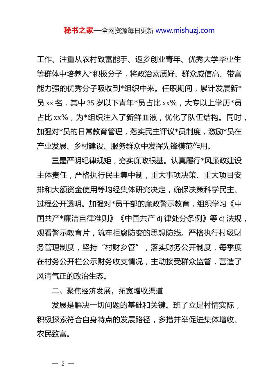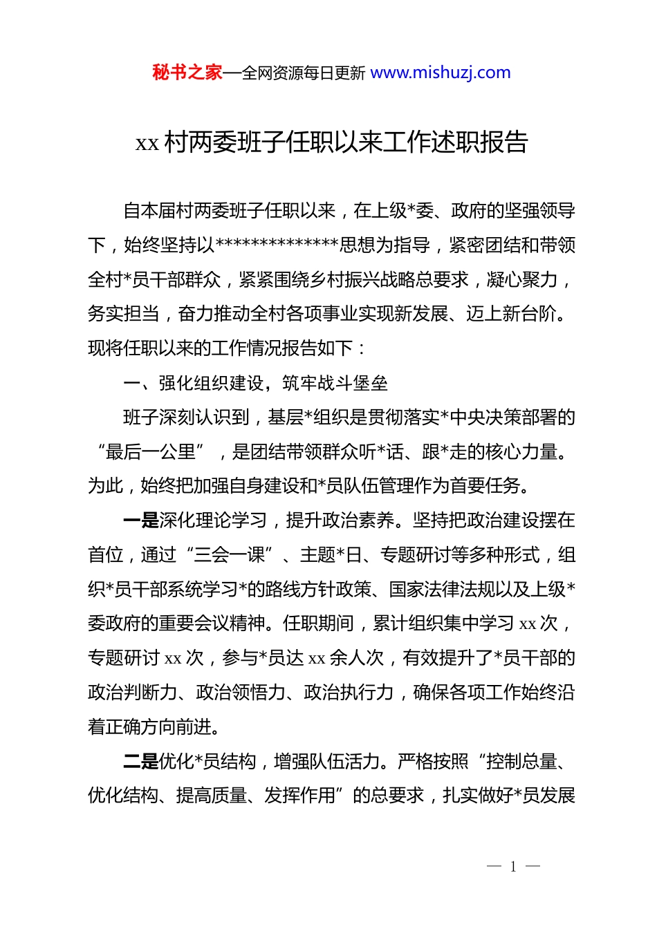 秘书之家—全网资源每日更新 www.mishuzj.comxx 村两委班子任职以来工作述职报告自本届村两委班子任职以来,在上级*委、政府的坚强领导下,始终坚持以**************思想为指导,紧密团结和带领全村*员干部群众,紧紧围绕乡村振兴战略总要求,凝心聚力,务实担当,奋力推动全村各项事业实现新发展、迈上新台阶。现将任职以来的工作情况报告如下:一、强化组织建设,筑牢战斗堡垒班子深刻认识到,基层*组织是贯彻落实*中央决策部署的“最后一公里”,是团结带领群众听*话、跟*走的核心力量。为此,始终把加强自身建设和*员队伍管理作为首要任务。一是深化理论学习,提升政治素养。坚持把政治建设摆在首位,通过“三会一课”、主题*日、专题研讨等多种形式,组织*员干部系统学习*的路线方针政策、国家法律法规以及上级*委政府的重要会议精神。任职期间,累计组织集中学习 xx 次,专题研讨 xx 次,参与*员达 xx 余人次,有效提升了*员干部的政治判断力、政治领悟力、政治执行力,确保各项工作始终沿着正确方向前进。二是优化*员结构,增强队伍活力。严格按照“控制总量、优化结构、提高质量、发挥作用”的总要求,扎实做好*员发展— 1 —秘书之家—全网资源每日更新 www.mishuzj.com工作。注重从农村致富能手、返乡创业青年、优秀大学毕业生等群体中培养入*积极分子,将政治素质好、群众威信高、带富能力强的优秀分子吸收到*组织中来。任职期间,累计发展新*员 xx 名,其中 35 岁以下青年*员占比 xx%,大专以上学历*员占比 xx%,为*组织注入了新鲜血液,优化了队伍结构。同时,加强对*员的日常教育管理,落实民主评议*员制度,激励*员在产业发展、乡村建设、服务群众中发挥先锋模范作用。三是严明纪律规矩,夯实廉政根基。认真履行*风廉政建设主体责任,严格执行民主集中制,重大事项决策、重大项目安排和大额资金使用等均经集体研究决定,确保决策科学民主、过程公开透明。加强对*员干部的廉政警示教育,组织学习《中国共产*廉洁自律准则》《中国共产 dj 律处分条例》等 dj 法规,观看警示教育片,筑牢拒腐防变的思想防线。严格执行村级财务管理制度,坚持“村财乡管”,落实财务公开制度,每季度在村务公开栏公示财务收支情况,主动接受群众监督,营造了风清气正的政治生态。二、聚焦经济发展,拓宽增收渠道发展是解决一切问题的基础和关键。班子立足村情实际,积极探索符合自身特点的发展路径,多措并举促进集体增收、农民致富。— 2 —秘书之家—全网资源每日更新 www.mishuzj.com一是壮大特色产业,激活集体经济。充分盘活土地资源,通过土地流转、成立专业合作社等方式,大力发展特色种养业。任职期间,成功引进并发展了 xx 特色种植产业,规模达到 xx亩。通过整合财政扶持资金 xx 万元、村集体自筹 xx 万元,建设了配套的加工厂房和冷库设施,形成了“种植+加工+销售”的初步产业链条。该项目年产值达 xx 万元,带动村集体经济年均增收 xx 万元,并为村内提供长期就业岗位 xx 个,实现了集体与群众“双增收”。二是强化劳务协作,促进就业增收。针对村内富余劳动力较多的实际,将劳务输出作为农民增收的重要渠道。积极与上级人社部门及劳务中介机构对接,建立劳动力资源信息库,精准掌握村民就业意向和技能状况。任职期间,累计组织村民参加电工、焊工、家政服务等各类技能培训 xx 人次,提升了就业竞争力。通过“点对点”输送、定向推荐等方式,累计向广东、浙江、江苏等经济发达地区输出劳务人员 xx 人次,实现劳务总收入累计达 xx 万元,人均年劳务收入增加 xx 元,有效拓宽了农民增收渠道。三是落实惠农政策,保障民生福祉。不折不扣地贯彻落实国家各项强农惠农政策,确保政策红利精准惠及每一位村民。任职期间,通过“一卡通”系统累计发放耕地地力保护补贴、— 3 —秘书之家—全网资源每日更新 www.mishuzj.com农机购置补贴、生态公益林补偿等各类惠农补贴资金 xx 万元,惠及农户 xx 户。同时,全力推进城乡居民基本医疗保险和养老保险参保工作,通过广泛宣传、上门服务、代缴补贴等方式,确保两项保险参保率均稳定...