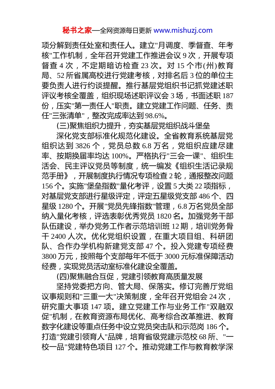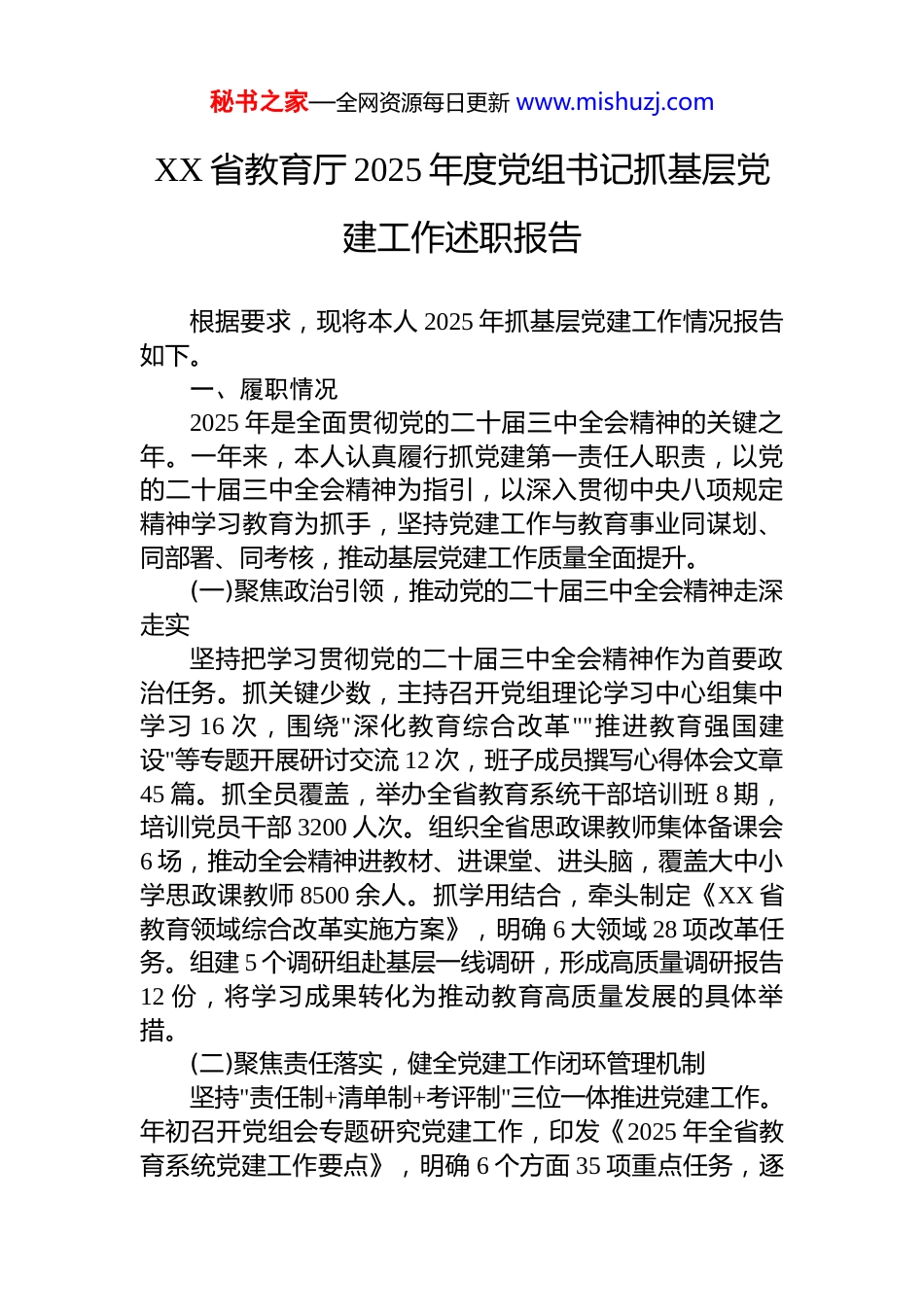 秘书之家—全网资源每日更新 www.mishuzj.comXX 省教育厅 2025 年度党组书记抓基层党建工作述职报告根据要求,现将本人 2025 年抓基层党建工作情况报告如下。一、履职情况2025 年是全面贯彻党的二十届三中全会精神的关键之年。一年来,本人认真履行抓党建第一责任人职责,以党的二十届三中全会精神为指引,以深入贯彻中央八项规定精神学习教育为抓手,坚持党建工作与教育事业同谋划、同部署、同考核,推动基层党建工作质量全面提升。(一)聚焦政治引领,推动党的二十届三中全会精神走深走实坚持把学习贯彻党的二十届三中全会精神作为首要政治任务。抓关键少数,主持召开党组理论学习中心组集中学习 16 次,围绕"深化教育综合改革""推进教育强国建设"等专题开展研讨交流 12 次,班子成员撰写心得体会文章45 篇。抓全员覆盖,举办全省教育系统干部培训班 8 期,培训党员干部 3200 人次。组织全省思政课教师集体备课会6 场,推动全会精神进教材、进课堂、进头脑,覆盖大中小学思政课教师 8500 余人。抓学用结合,牵头制定《XX 省教育领域综合改革实施方案》,明确 6 大领域 28 项改革任务。组建 5 个调研组赴基层一线调研,形成高质量调研报告12 份,将学习成果转化为推动教育高质量发展的具体举措。(二)聚焦责任落实,健全党建工作闭环管理机制坚持"责任制+清单制+考评制"三位一体推进党建工作。年初召开党组会专题研究党建工作,印发《2025 年全省教育系统党建工作要点》,明确 6 个方面 35 项重点任务,逐秘书之家—全网资源每日更新 www.mishuzj.com项分解到责任处室和责任人。建立"月调度、季督查、年考核"工作机制,全年召开党建工作推进会议 9 次,开展专项督查 4 次,不定期暗访检查 23 次。对 15 个市(州)教育局、52 所省属高校进行党建考核,对排名后 3 位的单位主要负责人进行约谈提醒。推行基层党组织书记抓党建述职评议考核全覆盖,组织现场述职评议会 3 场,书面述职 187份,压实"第一责任人"职责。建立党建工作问题、任务、责任"三张清单",整改完成率达到 98.6%。(三)聚焦组织力提升,夯实基层党组织战斗堡垒深化党支部标准化规范化建设。全省教育系统基层党组织达到 3826 个,党员总数 6.8 万名,党组织应建尽建率、按期换届率均达 100%。严格执行"三会一课"、组织生活会、民主评议党员等制度,统一编发《组织生活记录规范手册》,开展制度执行情况专项检查 2 轮,通报整改问题156 个。实施"堡垒指数"量化考评,设置 5 大类 22 项指标,对基层党支部进行星级评定,评定五星级党支部 486 个、四星级 1280 个。开展"党员先锋指数"管理,6.8 万名党员全部纳入量化考核,评选表彰优秀党员 1820 名。加强党务干部队伍建设,举办党务工作者示范培训班 12 期,培训党务骨干 2400 人次。优化党组织设置,在重大项目组、科研团队、合作办学机构新建党支部 47 个。投入党建专项经费3800 万元,按照每个支部每年不低于 3000 元标准保障活动经费,实现党员活动室标准化建设全覆盖。(四)聚焦融合互促,党建引领教育高质量发展坚持党委把方向、管大局、保落实。修订完善厅党组议事规则和"三重一大"决策制度,全年召开党组会 24 次,研究重大事项 147 项。建立党建工作与业务工作"双融双促"机制,在教育资源布局优化、高考综合改革推进、教育数字化建设等重点任务中设立党员突击队和示范岗 186 个。打造"党建引领育人"品牌,培育省级党建示范校 68 所、"一校一品"党建特色项目 127 个。推动党建工作与教育教学深秘书之家—全网资源每日更新 www.mishuzj.com度融合,开展"党员教师示范课"竞赛活动,参与教师达 1.2万人次。2025 年,全省学前教育毛入园率达到 92.5%,义务教育巩固率 98.8%,高中阶段毛入学率 95.2%,高等教育毛入学率 52.6%,各项指标均超额完成年度任务。教育服务经济社会发展能力显著增强,职业院校培养技术技能人才8.6 万人,高校科研成果转化金额突破 XX 亿元。(五)聚焦正风肃纪,深化中央八项规定精神学习教育扎实开展学习教育,制定《关于深入贯彻中央八项规...