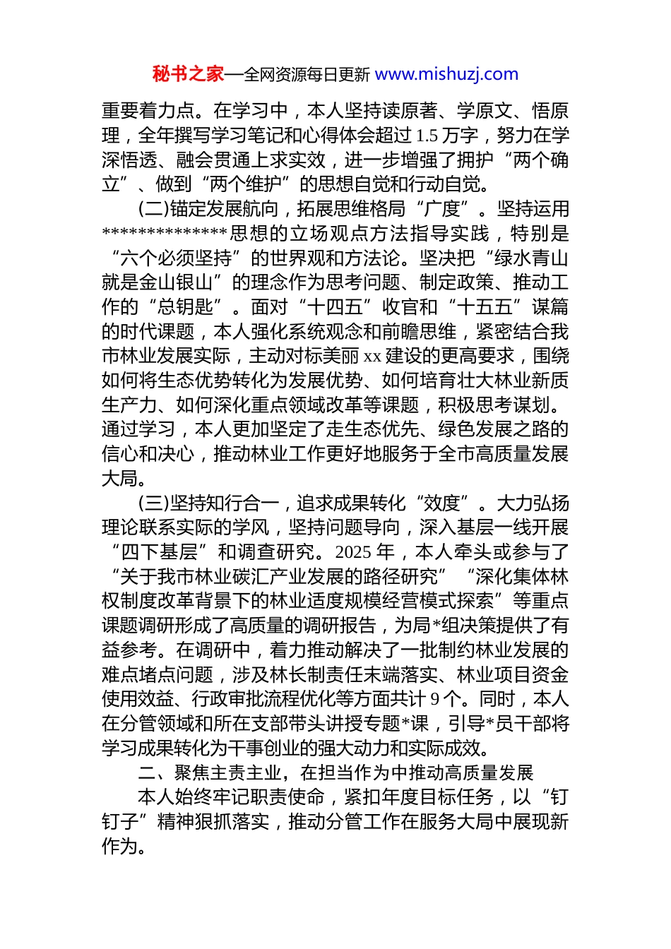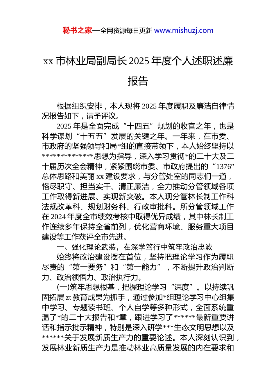 秘书之家—全网资源每日更新 www.mishuzj.comxx 市林业局副局长 2025 年度个人述职述廉报告根据组织安排,本人现将 2025 年度履职及廉洁自律情况报告如下,请予评议。2025 年是全面完成“十四五”规划的收官之年,也是科学谋划“十五五”发展的关键之年。一年来,在市委、市政府的坚强领导和局*组的直接带领下,本人始终坚持以**************思想为指导,深入学习贯彻*的二十大及二十届历次全会精神,紧紧围绕市委、市政府提出的“1376”总体思路和美丽 xx 建设要求,与分管处室的同志们一道,恪尽职守、担当实干、清正廉洁,全力推动分管领域各项工作取得新进展、实现新突破。本人现分管林长制工作科法规改革科、规划财务科、行政审批科。所分管领域工作在 2024 年度全市绩效考核中取得优异成绩,其中林长制工作连续多年保持全省前列,优化营商环境、服务重大项目建设等工作获评全市先进。一、强化理论武装,在深学笃行中筑牢政治忠诚始终将政治建设摆在首位,坚持把理论学习作为履职尽责的“第一要务”和“第一能力”,不断提升政治判断力、政治领悟力、政治执行力。(一)筑牢思想根基,把握理论学习“深度”。以持续巩固拓展 zt 教育成果为抓手,通过参加*组理论学习中心组集中学习、专题读书班、个人自学等多种形式,全面系统重温了*的二十大报告和*章,跟进学习了******最新重要讲话和指示批示精神,特别是深入研学***生态文明思想以及******关于发展新质生产力的重要论述。本人深刻认识到,发展林业新质生产力是推动林业高质量发展的内在要求和秘书之家—全网资源每日更新 www.mishuzj.com重要着力点。在学习中,本人坚持读原著、学原文、悟原理,全年撰写学习笔记和心得体会超过 1.5 万字,努力在学深悟透、融会贯通上求实效,进一步增强了拥护“两个确立”、做到“两个维护”的思想自觉和行动自觉。(二)锚定发展航向,拓展思维格局“广度”。坚持运用**************思想的立场观点方法指导实践,特别是“六个必须坚持”的世界观和方法论。坚决把“绿水青山就是金山银山”的理念作为思考问题、制定政策、推动工作的“总钥匙”。面对“十四五”收官和“十五五”谋篇的时代课题,本人强化系统观念和前瞻思维,紧密结合我市林业发展实际,主动对标美丽 xx 建设的更高要求,围绕如何将生态优势转化为发展优势、如何培育壮大林业新质生产力、如何深化重点领域改革等课题,积极思考谋划。通过学习,本人更加坚定了走生态优先、绿色发展之路的信心和决心,推动林业工作更好地服务于全市高质量发展大局。(三)坚持知行合一,追求成果转化“效度”。大力弘扬理论联系实际的学风,坚持问题导向,深入基层一线开展“四下基层”和调查研究。2025 年,本人牵头或参与了“关于我市林业碳汇产业发展的路径研究”“深化集体林权制度改革背景下的林业适度规模经营模式探索”等重点课题调研形成了高质量的调研报告,为局*组决策提供了有益参考。在调研中,着力推动解决了一批制约林业发展的难点堵点问题,涉及林长制责任末端落实、林业项目资金使用效益、行政审批流程优化等方面共计 9 个。同时,本人在分管领域和所在支部带头讲授专题*课,引导*员干部将学习成果转化为干事创业的强大动力和实际成效。二、聚焦主责主业,在担当作为中推动高质量发展本人始终牢记职责使命,紧扣年度目标任务,以“钉钉子”精神狠抓落实,推动分管工作在服务大局中展现新作为。秘书之家—全网资源每日更新 www.mishuzj.com(一)纵深推进林长制改革,擦亮生态文明建设“xx 名片”持续巩固提升我市林长制工作在全省的标杆地位。一是健全完善工作体系。在 2023 年、2024 年连续获得全省林长制工作考核“优秀”等次的基础上推动 2025 年林长制工作向纵深发展。提请市委、市政府高规格召开全市林长会议,主持举办全市林长制工作部署暨业务培训会,进一步压实各级林长责任。创新和深化“林长+检察长”“林长+警长”等协作机制,形成强大保护合力。2025 年,聚焦古树名木保护、重点区域生物多样性维护等关键领域提请市级林长签发林长令 3 道,有效解决了数个长期存在的生态管护难题。二是...