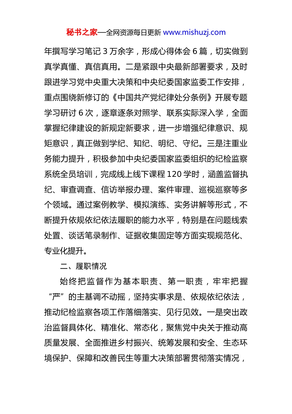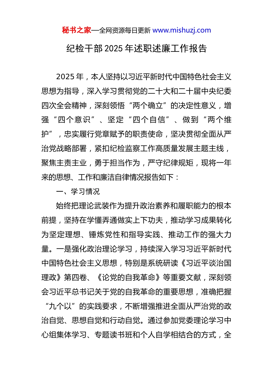 秘书之家—全网资源每日更新 www.mishuzj.com纪检干部 2025 年述职述廉工作报告 2025 年,本人坚持以习近平新时代中国特色社会主义思想为指导,深入学习贯彻党的二十大和二十届中央纪委四次全会精神,深刻领悟“两个确立”的决定性意义,增强“四个意识”、坚定“四个自信”、做到“两个维护”,忠实履行党章赋予的职责使命,坚决贯彻全面从严治党战略部署,紧扣纪检监察工作高质量发展主题主线,聚焦主责主业,勇于担当作为,严守纪律规矩,现将一年来的思想、工作和廉洁自律情况报告如下:一、学习情况始终把理论武装作为提升政治素养和履职能力的根本前提,坚持在学懂弄通做实上下功夫,推动学习成果转化为坚定理想、锤炼党性和指导实践、推动工作的强大力量。一是强化政治理论学习,持续深入学习习近平新时代中国特色社会主义思想,特别是系统研读《习近平谈治国理政》第四卷、《论党的自我革命》等重要文献,深刻领会习近平总书记关于党的自我革命的重要思想,准确把握“九个以”的实践要求,不断增强推进全面从严治党的政治自觉、思想自觉和行动自觉。通过参加党委理论学习中心组集体学习、专题读书班和个人自学相结合的方式,全秘书之家—全网资源每日更新 www.mishuzj.com年撰写学习笔记 3 万余字,形成心得体会 6 篇,切实做到真学真懂、真信真用。二是紧跟中央最新部署要求,及时跟进学习党中央重大决策和中央纪委国家监委工作安排,重点围绕新修订的《中国共产党纪律处分条例》开展专题学习研讨 6 次,逐章逐条对照学、联系实际深入学,全面掌握纪律建设的新规定新要求,进一步增强纪律意识、规矩意识,真正做到学纪、知纪、明纪、守纪。三是注重业务能力提升,积极参加中央纪委国家监委组织的纪检监察系统全员培训,完成线上线下课程 120 学时,涵盖监督执纪、审查调查、信访举报办理、案件审理、巡视巡察等多个领域。通过案例教学、模拟演练、实务讲解等形式,不断提升依规依纪依法履职的能力水平,特别是在问题线索处置、谈话笔录制作、证据收集固定等方面实现规范化、专业化提升。二、履职情况始终把监督作为基本职责、第一职责, 牢牢把握“严”的主基调不动摇,坚持实事求是、依规依纪依法,推动纪检监察各项工作落细落实、见行见效。一是突出政治监督具体化、精准化、常态化,聚焦党中央关于推动高质量发展、全面推进乡村振兴、统筹发展和安全、生态环境保护、保障和改善民生等重大决策部署贯彻落实情况,秘书之家—全网资源每日更新 www.mishuzj.com组织开展专项监督检查 18 次,覆盖农业农村、教育医疗、社会保障、安全生产等重点领域,累计发现问题线索 42个,督促整改 37 个,制发纪律检查建议书 5 份,推动相关职能部门健全制度、堵塞漏洞,确保党中央政令畅通、落地见效。特别是在乡村振兴资金使用监管方面,牵头开展“惠民资金使用不规范”专项整治行动,发现个别单位存在虚报冒领、挪用侵占等问题,及时移交线索并跟踪督办,切实维护群众切身利益。二是做实做细日常监督,坚持抓早抓小、防微杜渐,综合运用谈心谈话、列席会议、廉政档案动态更新、个人有关事项报告核查等多种方式,加强对“一把手”和领导班子成员的监督。全年开展提醒谈话 23 人次,函询 2 人,对苗头性、倾向性问题及时提醒纠正,防止小错酿成大祸。严格落实廉政意见回复制度,出具党风廉政意见回复函 35 份,否决干部提拔任用 2 人,切实把好选人用人政治关、廉洁关。三是保持惩治腐败高压态势,坚持有案必查、有腐必惩,全年共受理群众来信来访和上级转办问题线索 45 件,全部按规定程序进行处置,立案查处违纪案件 9 起,给予党纪处分 8 人,组织处理 12 人,其中涉及违反中央八项规定精神问题 3 起,群众身边腐败问题 2 起,其他违纪问题 4 起。重点查处了某街道办事处工作人员虚报冒领低保补助资金、个别基层干部秘书之家—全网资源每日更新 www.mishuzj.com违规收受管理服务对象礼品礼金等典型案件,在系统内形成有力震慑。四是深化标本兼治,一体推进不敢腐、不能腐、不想腐。坚持“查办一起案件、完善一套制度、教育一批干部”...