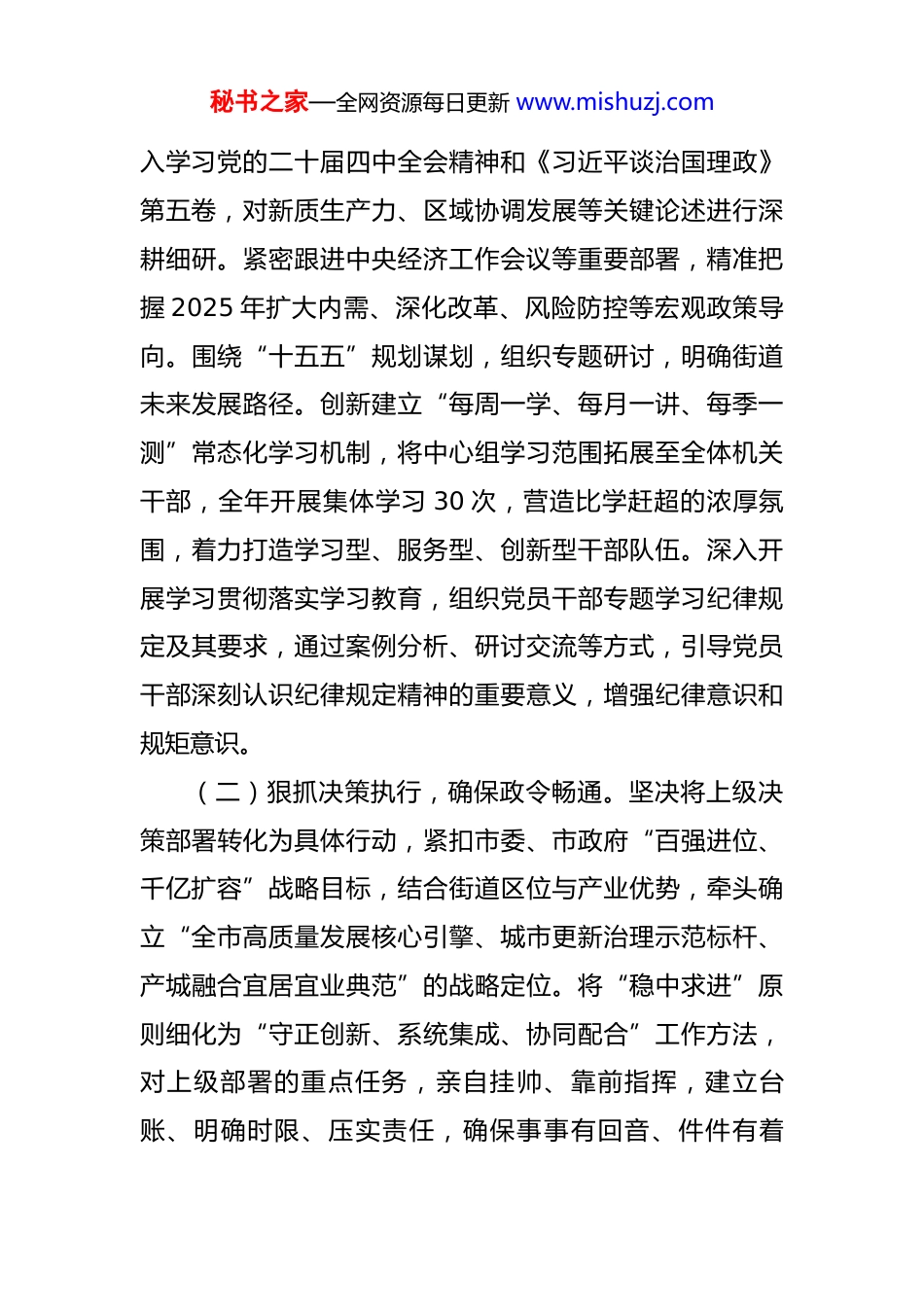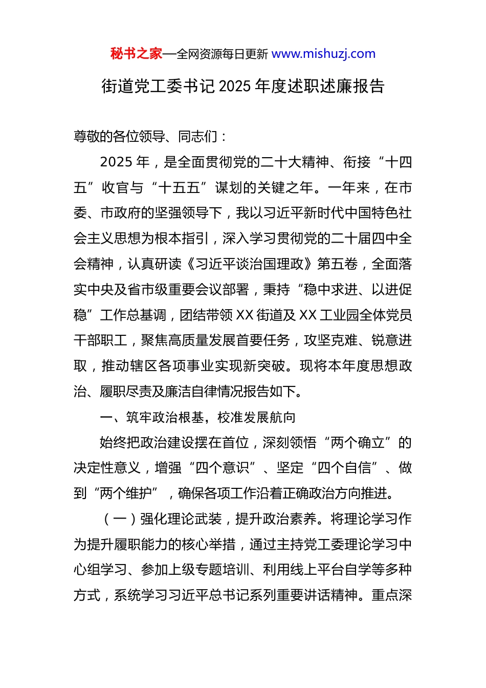 秘书之家—全网资源每日更新 www.mishuzj.com街道党工委书记 2025 年度述职述廉报告 尊敬的各位领导、同志们:2025 年,是全面贯彻党的二十大精神、衔接“十四五”收官与“十五五”谋划的关键之年。一年来,在市委、市政府的坚强领导下,我以习近平新时代中国特色社会主义思想为根本指引,深入学习贯彻党的二十届四中全会精神,认真研读《习近平谈治国理政》第五卷,全面落实中央及省市级重要会议部署,秉持“稳中求进、以进促稳”工作总基调,团结带领 XX 街道及 XX 工业园全体党员干部职工,聚焦高质量发展首要任务,攻坚克难、锐意进取,推动辖区各项事业实现新突破。现将本年度思想政治、履职尽责及廉洁自律情况报告如下。一、筑牢政治根基,校准发展航向始终把政治建设摆在首位,深刻领悟“两个确立”的决定性意义,增强“四个意识”、坚定“四个自信”、做到“两个维护”,确保各项工作沿着正确政治方向推进。(一)强化理论武装,提升政治素养。将理论学习作为提升履职能力的核心举措,通过主持党工委理论学习中心组学习、参加上级专题培训、利用线上平台自学等多种方式,系统学习习近平总书记系列重要讲话精神。重点深秘书之家—全网资源每日更新 www.mishuzj.com入学习党的二十届四中全会精神和《习近平谈治国理政》第五卷,对新质生产力、区域协调发展等关键论述进行深耕细研。紧密跟进中央经济工作会议等重要部署,精准把握 2025 年扩大内需、深化改革、风险防控等宏观政策导向。围绕“十五五”规划谋划,组织专题研讨,明确街道未来发展路径。创新建立“每周一学、每月一讲、每季一测”常态化学习机制,将中心组学习范围拓展至全体机关干部,全年开展集体学习 30 次,营造比学赶超的浓厚氛围,着力打造学习型、服务型、创新型干部队伍。深入开展学习贯彻落实学习教育,组织党员干部专题学习纪律规定及其要求,通过案例分析、研讨交流等方式,引导党员干部深刻认识纪律规定精神的重要意义,增强纪律意识和规矩意识。(二)狠抓决策执行,确保政令畅通。坚决将上级决策部署转化为具体行动,紧扣市委、市政府“百强进位、千亿扩容”战略目标,结合街道区位与产业优势,牵头确立“全市高质量发展核心引擎、城市更新治理示范标杆、产城融合宜居宜业典范”的战略定位。将“稳中求进”原则细化为“守正创新、系统集成、协同配合”工作方法,对上级部署的重点任务,亲自挂帅、靠前指挥,建立台账、明确时限、压实责任,确保事事有回音、件件有着秘书之家—全网资源每日更新 www.mishuzj.com落。定期对重点任务推进情况进行检查调度,及时解决工作中遇到的困难和问题,确保各项工作按计划有序推进。(三)压实意识形态责任,筑牢思想防线。严格落实意识形态工作责任制,将意识形态工作与经济社会发展同部署、同落实、同检查、同考核。履行“第一责任人”职责,定期主持专题会议研判意识形态领域风险点,重点应对网络舆情、社会思潮等挑战。督促班子成员履行“一岗双责”,将意识形态工作融入分管领域,强化思想政治引领,加强对各类宣传文化阵地的管理。通过开展主题宣传活动、举办文化讲座等方式,传播正能量,弘扬主旋律,牢牢掌握意识形态工作领导权、管理权、话语权,为街道发展稳定营造健康向上的思想舆论环境。二、聚焦主责主业,推动高质量发展立足街道实际,围绕中心工作,积极履行职责,推动辖区经济社会各项事业高质量发展。(一)推动经济发展,增强综合实力。依托 XX 工业园,加大招商引资力度,积极引进优质项目。制定招商引资优惠政策,优化营商环境,吸引了一批高科技、高附加值企业入驻。全年新引进项目 X 个,总投资达 X 亿元,为街道经济发展注入了新动力。加强企业服务,建立领导干部联系企业制度,定期深入企业走访调研,了解企业需秘书之家—全网资源每日更新 www.mishuzj.com求,帮助企业解决实际问题。积极协调解决企业用地、融资、人才等方面的困难,推动企业加快发展。全年规模以上工业企业总产值同比增长 X%,固定资产投资同比增长 X%,经济发展态势良好。(二)推进城市建设,提升品质形象。加快城市更新步伐,制定城市更新...