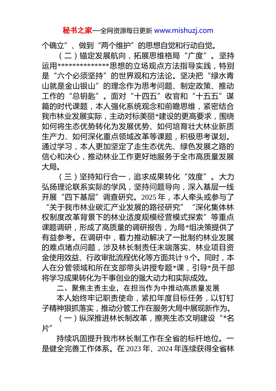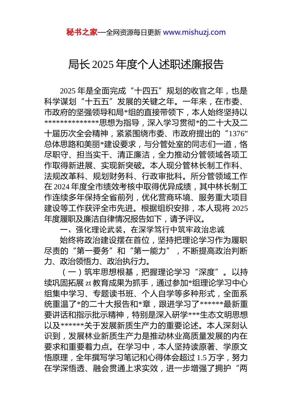 秘书之家—全网资源每日更新 www.mishuzj.com局长 2025 年度个人述职述廉报告2025 年是全面完成“十四五”规划的收官之年,也是科学谋划“十五五”发展的关键之年。一年来,在市委、市政府的坚强领导和局*组的直接带领下,本人始终坚持以**************思想为指导,深入学习贯彻*的二十大及二十届历次全会精神,紧紧围绕市委、市政府提出的“1376”总体思路和美丽*建设要求,与分管处室的同志们一道,恪尽职守、担当实干、清正廉洁,全力推动分管领域各项工作取得新进展、实现新突破。本人现分管林长制工作科、法规改革科、规划财务科、行政审批科。所分管领域工作在 2024 年度全市绩效考核中取得优异成绩,其中林长制工作连续多年保持全省前列,优化营商环境、服务重大项目建设等工作获评全市先进。根据组织安排,本人现将 2025年度履职及廉洁自律情况报告如下,请予评议。一、强化理论武装,在深学笃行中筑牢政治忠诚始终将政治建设摆在首位,坚持把理论学习作为履职尽责的“第一要务”和“第一能力”,不断提高政治判断力、政治领悟力、政治执行力。(一)筑牢思想根基,把握理论学习“深度”。以持续巩固拓展 zt 教育成果为抓手,通过参加*组理论学习中心组集中学习、专题读书班、个人自学等多种形式,全面系统重温了*的二十大报告和*章,跟进学习了******最新重要讲话和指示批示精神,特别是深入研学***生态文明思想以及******关于发展新质生产力的重要论述。本人深刻认识到,发展林业新质生产力是推动林业高质量发展的内在要求和重要着力点。在学习中,本人坚持读原著、学原文悟原理,全年撰写学习笔记和心得体会超过 1.5 万字,努力在学深悟透、融会贯通上求实效,进一步增强了拥护“两秘书之家—全网资源每日更新 www.mishuzj.com个确立”、做到“两个维护”的思想自觉和行动自觉。(二)锚定发展航向,拓展思维格局“广度”。坚持运用**************思想的立场观点方法指导实践,特别是“六个必须坚持”的世界观和方法论。坚决把“绿水青山就是金山银山”的理念作为思考问题、制定政策、推动工作的“总钥匙”。面对“十四五”收官和“十五五”谋篇的时代课题,本人强化系统观念和前瞻思维,紧密结合我市林业发展实际,主动对标美丽*建设的更高要求,围绕如何将生态优势转化为发展优势、如何培育壮大林业新质生产力、如何深化重点领域改革等课题,积极思考谋划。通过学习,本人更加坚定了走生态优先、绿色发展之路的信心和决心,推动林业工作更好地服务于全市高质量发展大局。(三)坚持知行合一,追求成果转化“效度”。大力弘扬理论联系实际的学风,坚持问题导向,深入基层一线开展“四下基层”调查研究。2025 年,本人牵头或参与了“关于我市林业碳汇产业发展的路径研究”“深化集体林权制度改革背景下的林业适度规模经营模式探索”等重点课题调研,形成了高质量的调研报告,为局*组决策提供了有益参考。在调研中,着力推动解决了一批制约林业发展的难点堵点问题,涉及林长制责任末端落实、林业项目资金使用效益、行政审批流程优化等方面共计 9 个。同时,本人在分管领域和所在支部带头讲授专题*课,引导*员干部将学习成果转化为干事创业的强大动力和实际成效。二、聚焦主责主业,在担当作为中推动高质量发展本人始终牢记职责使命,紧扣年度目标任务,以钉钉子精神狠抓落实,推动分管工作在服务大局中展现新作为。(一)纵深推进林长制改革,擦亮生态文明建设“*名片”持续巩固提升我市林长制工作在全省的标杆地位。一是健全完善工作体系。在 2023 年、2024 年连续获得全省林秘书之家—全网资源每日更新 www.mishuzj.com长制工作考核“优秀”等次的基础上,推动 2025 年林长制工作向纵深发展。提请市委、市政府高规格召开全市林长会议,主持举办全市林长制工作部署暨业务培训会,进一步压实各级林长责任。创新和深化“林长+检察长”“林长+警长”等协作机制,形成强大保护合力。2025 年,聚焦古树名木保护、重点区域生物多样性保护等关键领域,提请市级林长签发林长令 3 道,有效解决了数个长期存在的生态管护难题。二是强化督查考核激励。坚持...