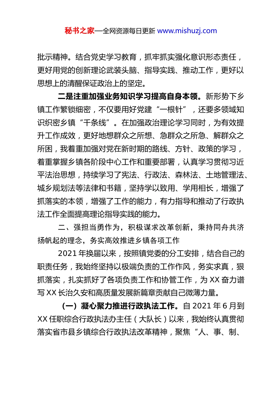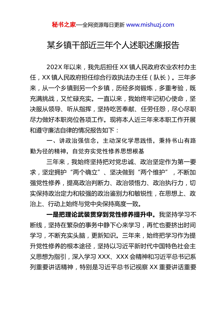 秘书之家—全网资源每日更新 www.mishuzj.com某乡镇干部近三年个人述职述廉报告202X 年以来,我先后担任 XX 镇人民政府农业农村办主任,XX 镇人民政府担任综合行政执法办主任(队长)。三年多来,从一个乡镇到另一个乡镇,历经多岗锻炼,多重考验,既充满挑战,又忙碌充实。一直以来,我始终牢记初心使命,坚决服从领导、听从指挥,坚持吃苦奉献、任劳任怨,尽心尽职尽力做好本职岗位各项工作。现将本人近三年来本职工作开展和遵守廉洁自律的情况报告如下:一、讲政治强信念,主动深化学思践悟,秉持书山有路勤为径的精神,自觉夯实党性修养思想根基三年来,我始终坚持把对党忠诚、政治坚定作为第一要求,坚定拥护“两个确立”、坚决做到“两个维护”,不断加强党性修养,提高政治判断力、政治领悟力、政治执行力,切实保持政治定力和较强的政治鉴别力和敏锐性,在思想上、政治上、行动上始终与党中央保持高度一致。一是把理论武装贯穿到党性修养提升中。我坚持学习不断线,坚持在繁杂的事务中静下心来学习,再忙也要挤出时间学习,不断充实头脑,更新知识。三年来,始终把学习作为提升党性修养的根本途径,坚持以习近平新时代中国特色社会主义思想为指引,深入学习 XXX、XXX 会精神和习近平总书记系列重要讲话精神,特别是习近平总书记视察 XX 重要讲话重要秘书之家—全网资源每日更新 www.mishuzj.com批示精神。结合党史学习教育,抓牢抓实强化意识形态责任,更好用党的创新理论武装头脑、指导实践、推动工作,更好以思想上的清醒保证政治上的坚定。二是注重加强业务知识学习提高自身本领。新形势下乡镇工作繁锁细密,不仅要用好党建“一根针”,还要多领域知识织密乡镇“千条线”。在加强政治理论学习同时,为有效提升工作成效,更好地想群众之所想、急群众之所急、解群众之所困,我着重加强对党在新时期的路线、方针、政策的学习,着重掌握乡镇各阶段中心工作和重要部署,认真学习贯彻习近平法治思想,持续学习了宪法、行政法、森林法、土地管理法、城乡规划法等法律和书籍,坚持学以致用、学用相长,增强了抓落实的本领,增强了工作的能力,有力指导和推动了行政执法工作全面提高理论指导实践的能力。二、强担当勇作为,积极谋求改革创新,秉持同舟共济扬帆起的理念,务实高效推进乡镇各项工作2021 年换届以来,按照镇党委的分工安排,结合自己的职责任务,我始终坚持以极端负责的工作作风,务实求真,狠抓落实,扎实抓好了各项负责工作和协管工作,为 XX 奋力谱写 XX 长治久安和高质量发展新篇章贡献自己微薄力量。(一)凝心聚力推进行政执法工作。自 2021 年 6 月到XX 任职综合行政执法办主任(大队长)以来,我始终认真贯彻落实省市县乡镇综合行政执法改革精神,聚焦“人、事、制、秘书之家—全网资源每日更新 www.mishuzj.com训、物”五个关键字,多措并举规范综合行政执法行为,为推动乡村振兴保驾护航。一是聚焦“人”字。积极动员在职在编干部考取执法证,X 名镇执法队及后备队伍实现“全员持证”。充分发挥“执法队、巡河长、网格员”三种力量,X 名镇执法队及后备队伍 X 名,网格员、X 名巡河人员开展全天候、全方位日常巡查,强化执法线索收集、矛盾化解、“前端”处置等功能,切实做到问题“在苗头时发现,在网格中解决”。二是聚焦“事”字。严格按照《XX 市县级行政处罚权调整由镇街实施事项目录(第一批)》下放的 X 项事项开展执法,坚决打击乡镇农业农村、自然资源、水利、林业、卫生健康、市场监督、城市综合管理等一系列违法行为,带头主动参与办理行政执法案件,依法开展行政检查 X 宗,发放责令停止违法行为通知书X 份,依法办结行政处罚案件 75 宗,其中查处非法占用耕地违建案 2 宗、野外用火案 X 宗、滥伐林木案 X 宗。三是聚焦“制”字。加大采用“两平台”和“粤执法”执法办案,扎实推进基层法制化建设,聘请御福律师事务所专业律师担任执法大队顾问,提高执法队伍法律素养和办案规范率。2021 年以来,开展线上执法 X 宗,纸质执法 X 宗。四是聚焦“训”字。结合“传帮带”培训机制,我举办专题培训...