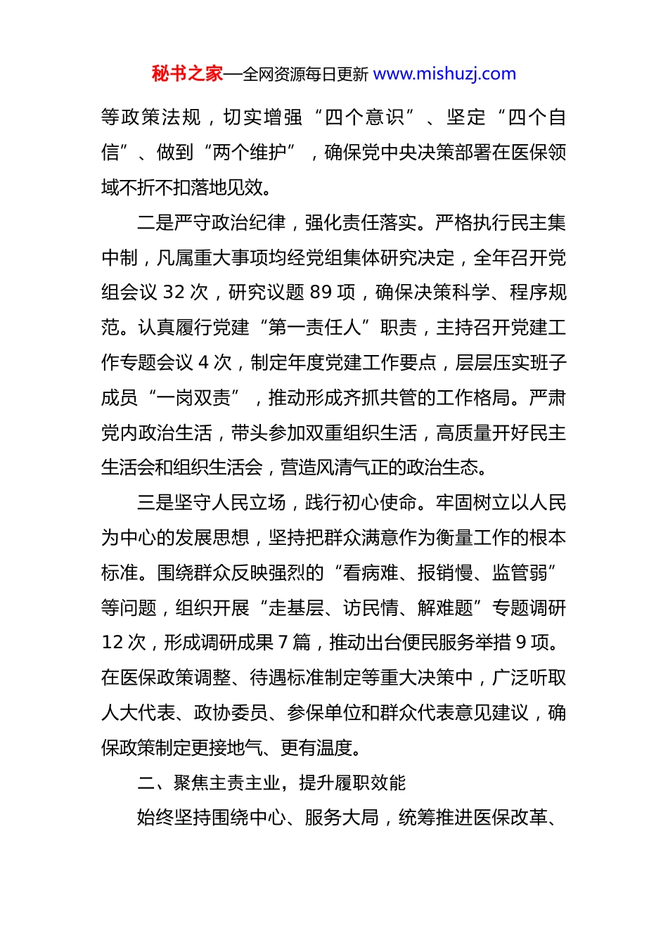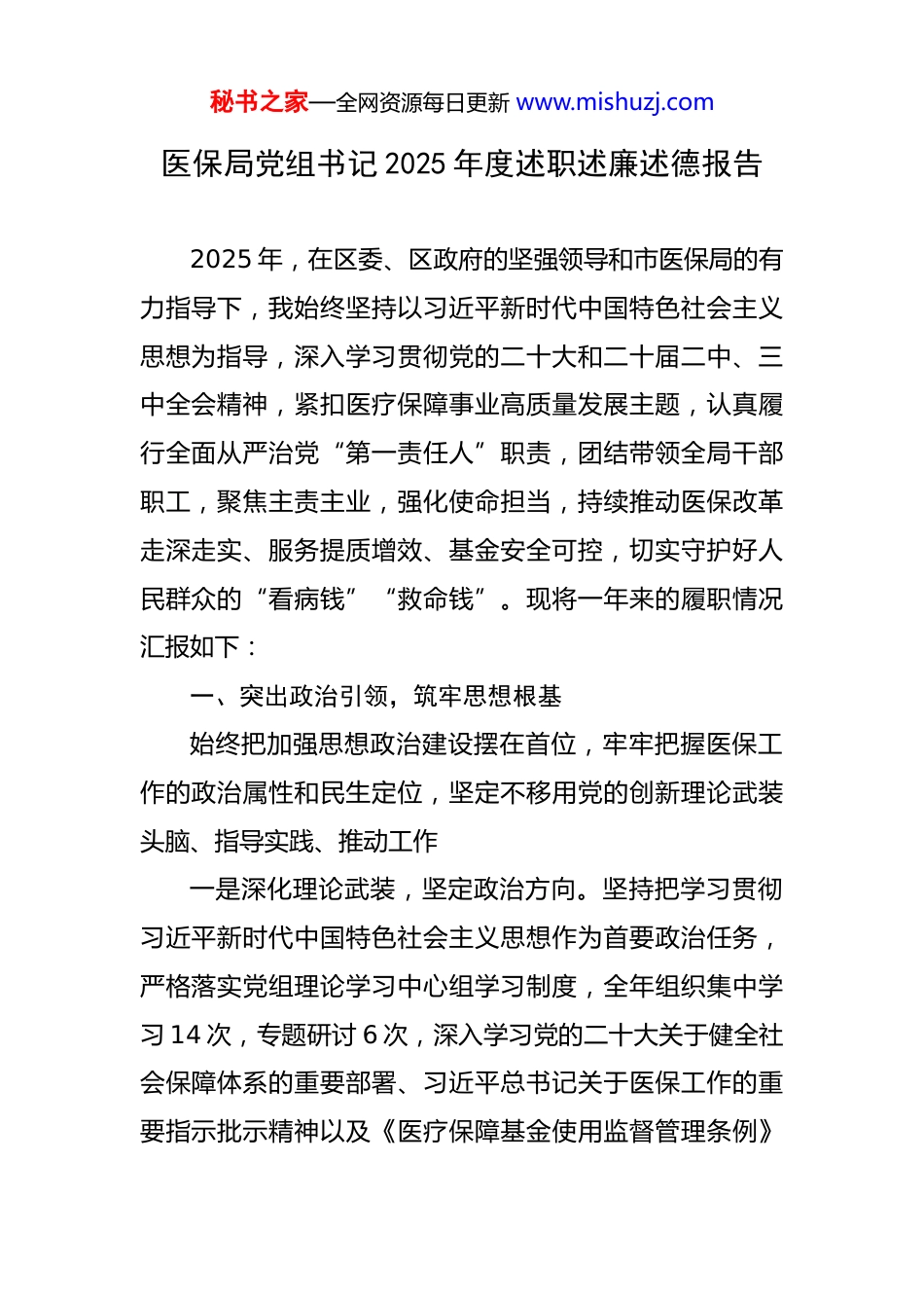 秘书之家—全网资源每日更新 www.mishuzj.com医保局党组书记 2025 年度述职述廉述德报告 2025 年,在区委、区政府的坚强领导和市医保局的有力指导下,我始终坚持以习近平新时代中国特色社会主义思想为指导,深入学习贯彻党的二十大和二十届二中、三中全会精神,紧扣医疗保障事业高质量发展主题,认真履行全面从严治党“第一责任人”职责,团结带领全局干部职工,聚焦主责主业,强化使命担当,持续推动医保改革走深走实、服务提质增效、基金安全可控,切实守护好人民群众的“看病钱”“救命钱”。现将一年来的履职情况汇报如下:一、突出政治引领,筑牢思想根基始终把加强思想政治建设摆在首位,牢牢把握医保工作的政治属性和民生定位,坚定不移用党的创新理论武装头脑、指导实践、推动工作 一是深化理论武装,坚定政治方向。坚持把学习贯彻习近平新时代中国特色社会主义思想作为首要政治任务,严格落实党组理论学习中心组学习制度,全年组织集中学习 14 次,专题研讨 6 次,深入学习党的二十大关于健全社会保障体系的重要部署、习近平总书记关于医保工作的重要指示批示精神以及《医疗保障基金使用监督管理条例》秘书之家—全网资源每日更新 www.mishuzj.com等政策法规,切实增强“四个意识”、坚定“四个自信”、做到“两个维护”,确保党中央决策部署在医保领域不折不扣落地见效。二是严守政治纪律,强化责任落实。严格执行民主集中制,凡属重大事项均经党组集体研究决定,全年召开党组会议 32 次,研究议题 89 项,确保决策科学、程序规范。认真履行党建“第一责任人”职责,主持召开党建工作专题会议 4 次,制定年度党建工作要点,层层压实班子成员“一岗双责”,推动形成齐抓共管的工作格局。严肃党内政治生活,带头参加双重组织生活,高质量开好民主生活会和组织生活会,营造风清气正的政治生态。三是坚守人民立场,践行初心使命。牢固树立以人民为中心的发展思想,坚持把群众满意作为衡量工作的根本标准。围绕群众反映强烈的“看病难、报销慢、监管弱”等问题,组织开展“走基层、访民情、解难题”专题调研12 次,形成调研成果 7 篇,推动出台便民服务举措 9 项。在医保政策调整、待遇标准制定等重大决策中,广泛听取人大代表、政协委员、参保单位和群众代表意见建议,确保政策制定更接地气、更有温度。二、聚焦主责主业,提升履职效能始终坚持围绕中心、服务大局,统筹推进医保改革、秘书之家—全网资源每日更新 www.mishuzj.com管理、服务各项工作,努力让改革发展成果更多更公平惠及广大人民群众。(一)深化改革攻坚,增强发展动能。一是持续推进医保支付方式改革。全面推行以按病种付费为主的多元复合式支付方式,在全区二级及以上定点医疗机构实施 DRG 实际付费,覆盖病种达 680 个,有效遏制过度医疗行为,住院次均费用同比下降 4.3%。探索开展门诊按人头付费试点,引导医疗机构主动控费、合理诊疗。二是稳步提高待遇保障水平。全面落实城乡居民基本医疗保险财政补助提标政策,人均补助标准达到 670 元。优化门诊统筹政策,普通门诊报销比例提高至 60%,年度支付限额提升至 1200 元。将高血压、糖尿病等慢性病纳入门诊用药保障范围,惠及患者 1.2 万余人。全面落实职工医保门诊共济保障机制,实现个人账户家庭共济使用,激活沉淀资金超 3200 万元。三是加快推动药品耗材集采落地。常态化推进国家和省级药品、医用耗材集中带量采购,全年落地执行集采批次 18 批,涉及药品 230 种、高值医用耗材 16 类,平均降价幅度达 58%,累计节约医保基金和群众支出约 1.4 亿元,真正让群众用上“质优价廉”的好药好械。秘书之家—全网资源每日更新 www.mishuzj.com(二)强化基金监管,守牢安全底线。一是织密智能监控网络。依托全省统一的医保信息平台,完善智能审核系统功能,对全区 237 家定点医药机构实行全流程、全链条、全天候监控,全年自动拦截不合理费用支出 2600 余万元。建立医保信用评价体系,对定点机构实行分级分类管理,评定 A 级单位 42 家,约谈整改 C 级以下机构 17 家。二是深化专项治理行动。联...