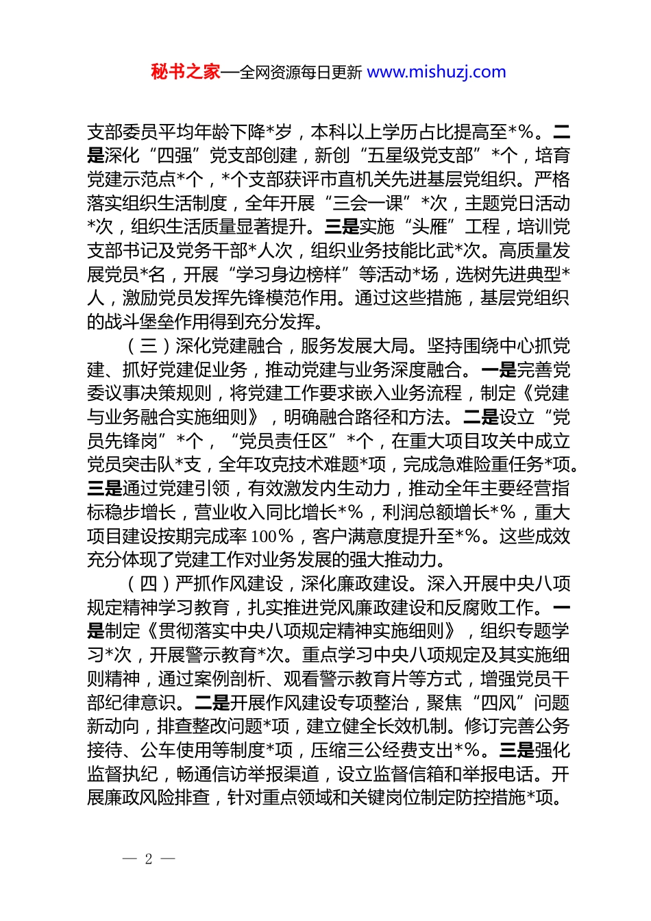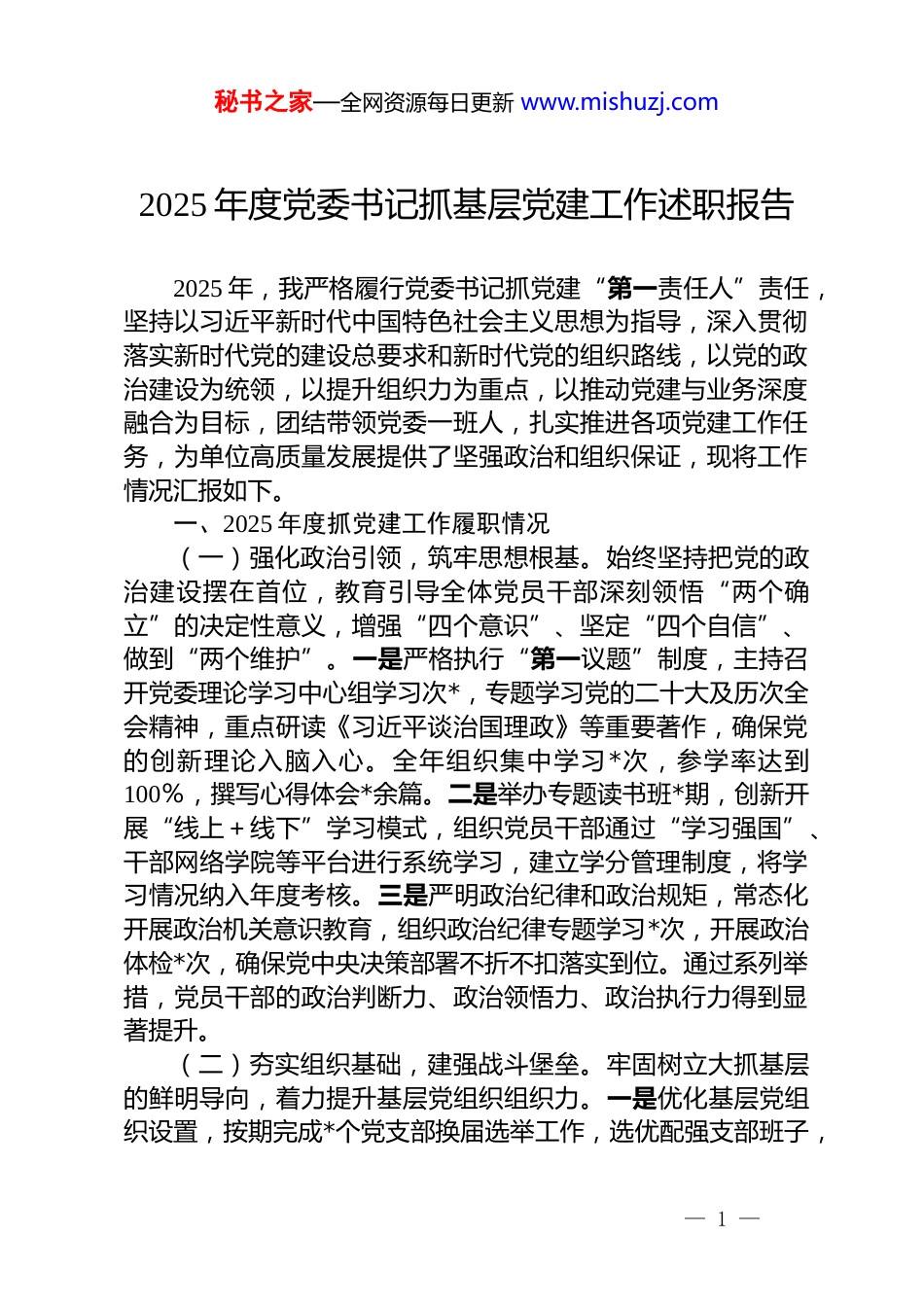秘书之家—全网资源每日更新 www.mishuzj.com2025 年度党委书记抓基层党建工作述职报告2025 年,我严格履行党委书记抓党建“第一责任人”责任,坚持以习近平新时代中国特色社会主义思想为指导,深入贯彻落实新时代党的建设总要求和新时代党的组织路线,以党的政治建设为统领,以提升组织力为重点,以推动党建与业务深度融合为目标,团结带领党委一班人,扎实推进各项党建工作任务,为单位高质量发展提供了坚强政治和组织保证,现将工作情况汇报如下。一、2025 年度抓党建工作履职情况(一)强化政治引领,筑牢思想根基。始终坚持把党的政治建设摆在首位,教育引导全体党员干部深刻领悟“两个确立”的决定性意义,增强“四个意识”、坚定“四个自信”、做到“两个维护”。一是严格执行“第一议题”制度,主持召开党委理论学习中心组学习次*,专题学习党的二十大及历次全会精神,重点研读《习近平谈治国理政》等重要著作,确保党的创新理论入脑入心。全年组织集中学习*次,参学率达到100%,撰写心得体会*余篇。二是举办专题读书班*期,创新开展“线上+线下”学习模式,组织党员干部通过“学习强国”、干部网络学院等平台进行系统学习,建立学分管理制度,将学习情况纳入年度考核。三是严明政治纪律和政治规矩,常态化开展政治机关意识教育,组织政治纪律专题学习*次,开展政治体检*次,确保党中央决策部署不折不扣落实到位。通过系列举措,党员干部的政治判断力、政治领悟力、政治执行力得到显著提升。(二)夯实组织基础,建强战斗堡垒。牢固树立大抓基层的鲜明导向,着力提升基层党组织组织力。一是优化基层党组织设置,按期完成*个党支部换届选举工作,选优配强支部班子,— 1 —秘书之家—全网资源每日更新 www.mishuzj.com支部委员平均年龄下降*岁,本科以上学历占比提高至*%。二是深化“四强”党支部创建,新创“五星级党支部”*个,培育党建示范点*个,*个支部获评市直机关先进基层党组织。严格落实组织生活制度,全年开展“三会一课”*次,主题党日活动*次,组织生活质量显著提升。三是实施“头雁”工程,培训党支部书记及党务干部*人次,组织业务技能比武*次。高质量发展党员*名,开展“学习身边榜样”等活动*场,选树先进典型*人,激励党员发挥先锋模范作用。通过这些措施,基层党组织的战斗堡垒作用得到充分发挥。(三)深化党建融合,服务发展大局。坚持围绕中心抓党建、抓好党建促业务,推动党建与业务深度融合。一是完善党委议事决策规则,将党建工作要求嵌入业务流程,制定《党建与业务融合实施细则》,明确融合路径和方法。二是设立“党员先锋岗”*个,“党员责任区”*个,在重大项目攻关中成立党员突击队*支,全年攻克技术难题*项,完成急难险重任务*项。三是通过党建引领,有效激发内生动力,推动全年主要经营指标稳步增长,营业收入同比增长*%,利润总额增长*%,重大项目建设按期完成率 100%,客户满意度提升至*%。这些成效充分体现了党建工作对业务发展的强大推动力。(四)严抓作风建设,深化廉政建设。深入开展中央八项规定精神学习教育,扎实推进党风廉政建设和反腐败工作。一是制定《贯彻落实中央八项规定精神实施细则》,组织专题学习*次,开展警示教育*次。重点学习中央八项规定及其实施细则精神,通过案例剖析、观看警示教育片等方式,增强党员干部纪律意识。二是开展作风建设专项整治,聚焦“四风”问题新动向,排查整改问题*项,建立健全长效机制。修订完善公务接待、公车使用等制度*项,压缩三公经费支出*%。三是强化监督执纪,畅通信访举报渠道,设立监督信箱和举报电话。开展廉政风险排查,针对重点领域和关键岗位制定防控措施*项。— 2 —秘书之家—全网资源每日更新 www.mishuzj.com运用监督执纪“四种形态”,开展谈心谈话*人次,提醒谈话*人次,做到抓早抓小、防微杜渐。(五)加强队伍建设,创新工作机制。坚持党管干部、党管人才原则,着力打造高素质专业化队伍。一是强化人才培养,实施“青苗计划”,选拔*名优秀年轻干部进行重点培养。开展专业技能培训*次,选派*名业务骨干到先进企业学习交流。成功引进高层次人才*名,...