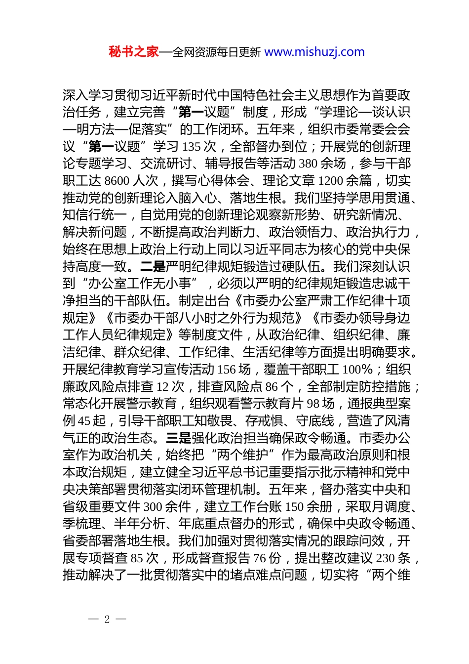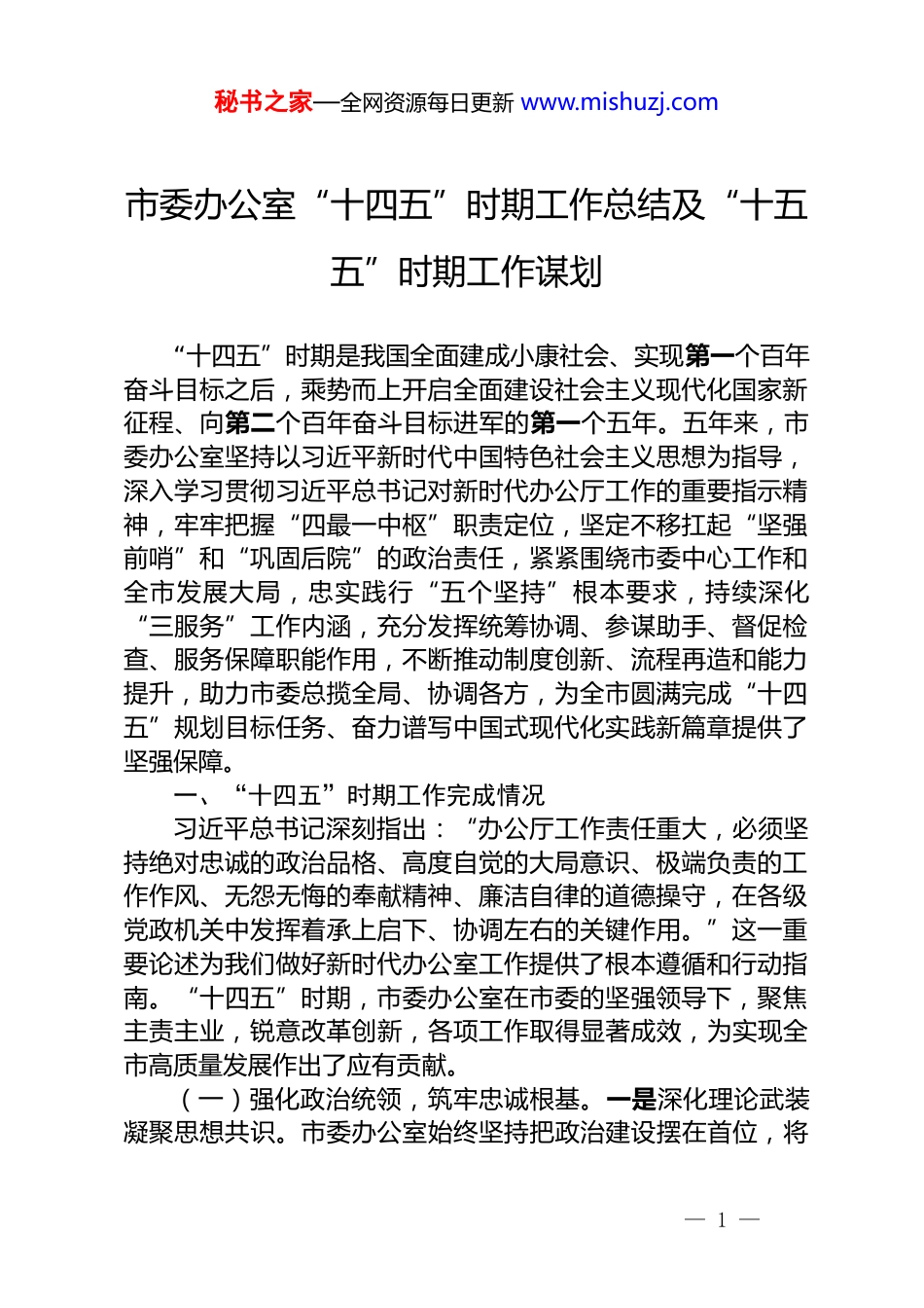 秘书之家—全网资源每日更新 www.mishuzj.com市委办公室“十四五”时期工作总结及“十五五”时期工作谋划“十四五”时期是我国全面建成小康社会、实现第一个百年奋斗目标之后,乘势而上开启全面建设社会主义现代化国家新征程、向第二个百年奋斗目标进军的第一个五年。五年来,市委办公室坚持以习近平新时代中国特色社会主义思想为指导,深入学习贯彻习近平总书记对新时代办公厅工作的重要指示精神,牢牢把握“四最一中枢”职责定位,坚定不移扛起“坚强前哨”和“巩固后院”的政治责任,紧紧围绕市委中心工作和全市发展大局,忠实践行“五个坚持”根本要求,持续深化“三服务”工作内涵,充分发挥统筹协调、参谋助手、督促检查、服务保障职能作用,不断推动制度创新、流程再造和能力提升,助力市委总揽全局、协调各方,为全市圆满完成“十四五”规划目标任务、奋力谱写中国式现代化实践新篇章提供了坚强保障。一、“十四五”时期工作完成情况习近平总书记深刻指出:“办公厅工作责任重大,必须坚持绝对忠诚的政治品格、高度自觉的大局意识、极端负责的工作作风、无怨无悔的奉献精神、廉洁自律的道德操守,在各级党政机关中发挥着承上启下、协调左右的关键作用。”这一重要论述为我们做好新时代办公室工作提供了根本遵循和行动指南。“十四五”时期,市委办公室在市委的坚强领导下,聚焦主责主业,锐意改革创新,各项工作取得显著成效,为实现全市高质量发展作出了应有贡献。(一)强化政治统领,筑牢忠诚根基。一是深化理论武装凝聚思想共识。市委办公室始终坚持把政治建设摆在首位,将— 1 —秘书之家—全网资源每日更新 www.mishuzj.com深入学习贯彻习近平新时代中国特色社会主义思想作为首要政治任务,建立完善“第一议题”制度,形成“学理论—谈认识—明方法—促落实”的工作闭环。五年来,组织市委常委会会议“第一议题”学习 135 次,全部督办到位;开展党的创新理论专题学习、交流研讨、辅导报告等活动 380 余场,参与干部职工达 8600 人次,撰写心得体会、理论文章 1200 余篇,切实推动党的创新理论入脑入心、落地生根。我们坚持学思用贯通、知信行统一,自觉用党的创新理论观察新形势、研究新情况、解决新问题,不断提高政治判断力、政治领悟力、政治执行力,始终在思想上政治上行动上同以习近平同志为核心的党中央保持高度一致。二是严明纪律规矩锻造过硬队伍。我们深刻认识到“办公室工作无小事”,必须以严明的纪律规矩锻造忠诚干净担当的干部队伍。制定出台《市委办公室严肃工作纪律十项规定》《市委办干部八小时之外行为规范》《市委办领导身边工作人员纪律规定》等制度文件,从政治纪律、组织纪律、廉洁纪律、群众纪律、工作纪律、生活纪律等方面提出明确要求。开展纪律教育学习宣传活动 156 场,覆盖干部职工 100%;组织廉政风险点排查 12 次,排查风险点 86 个,全部制定防控措施;常态化开展警示教育,组织观看警示教育片 98 场,通报典型案例 45 起,引导干部职工知敬畏、存戒惧、守底线,营造了风清气正的政治生态。三是强化政治担当确保政令畅通。市委办公室作为政治机关,始终把“两个维护”作为最高政治原则和根本政治规矩,建立健全习近平总书记重要指示批示精神和党中央决策部署贯彻落实闭环管理机制。五年来,督办落实中央和省级重要文件 300 余件,建立工作台账 150 余册,采取月调度、季梳理、半年分析、年底重点督办的形式,确保中央政令畅通、省委部署落地生根。我们加强对贯彻落实情况的跟踪问效,开展专项督查 85 次,形成督查报告 76 份,提出整改建议 230 条,推动解决了一批贯彻落实中的堵点难点问题,切实将“两个维— 2 —秘书之家—全网资源每日更新 www.mishuzj.com护”融入血脉、见诸行动。(二)提升辅政水平,服务科学决策。一是优化信息服务辅助精准研判。市委办公室坚持“围绕中心、服务大局”,充分发挥信息主渠道作用,不断完善信息收集、研判、报送机制。五年来,向上级党委报送信息 2560 条,其中被采用 820 条,获得中央领导批示 7 条,省委领导批示 89 条。我们聚焦经济社会发展...