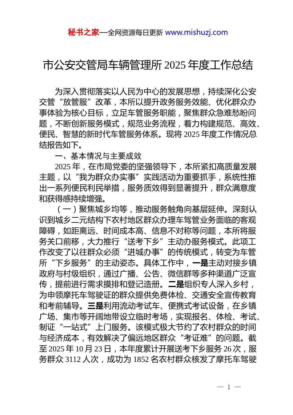 秘书之家—全网资源每日更新 www.mishuzj.com市公安交管局车辆管理所 2025 年度工作总结为深入贯彻落实以人民为中心的发展思想,持续深化公安交管“放管服”改革,本所以提升政务服务效能、优化群众办事体验为核心目标,立足车管服务职能,聚焦群众急难愁盼问题,不断创新服务模式,规范业务流程,着力构建规范、高效、便民、智慧的新时代车管服务体系。现将 2025 年度工作情况总结报告如下。一、基本情况与主要成效2025 年,在市局党委的坚强领导下,本所紧扣高质量发展主题,以“我为群众办实事”实践活动为重要抓手,系统性推出一系列便民利民举措,服务质效得到显著提升,群众满意度和获得感持续增强。(一)聚焦城乡均等,推动服务触角向基层延伸。深刻认识到城乡二元结构下农村地区群众办理车驾管业务面临的客观障碍,如距离远、时间成本高、信息不对称等问题,本所将服务关口前移,大力推行“送考下乡”主动办服务模式。此项工作改变了以往群众必须“进城办事”的传统模式,转变为车管所“下乡服务”的主动姿态。具体工作中,一是主动对接乡镇政府与村级组织,通过广播、公告、微信群等多种渠道广泛宣传,提前进行需求摸排和登记造册。二是组织专人深入乡村,为申领摩托车驾驶证的群众提供免费体检、交通安全宣传教育和考前辅导。三是利用流动考试车、便携式考试设备,在乡镇广场、集市等开阔地带设立临时考场,实现报名、体检、考试、制证“一站式”上门服务。该模式极大节约了农村群众的时间与经济成本,有效解决了偏远地区群众“考证难”的问题。截至 2025 年 10 月 23 日,本年度累计开展送考下乡服务 26 次,服务群众 3112 人次,成功为 1852 名农村群众核发了摩托车驾驶— 1 —秘书之家—全网资源每日更新 www.mishuzj.com证。此举不仅提升了农村地区群众的出行便利性,更从源头上规范了农村道路交通秩序,提高了摩托车驾驶人的持证率,为保障乡村道路交通安全奠定了坚实基础。(二)破解时空限制,构建全时段便民服务格局。针对“上班族”与“上学族”等群体工作日“上班没空办、下班没处办”的现实困境,本所深刻检视自身服务时间的局限性,积极探索并固化了“延时错时”服务机制。该机制旨在打破固定的八小时工作制壁垒,将服务时间延伸至工作日中午、下班后以及周末和法定节假日。为保障机制有效运行,一是科学排班,通过内部挖潜和轮岗调休,确保延时错时服务时段窗口全开、人员在岗。二是提前公告,通过官方新媒体平台、业务大厅公告栏等渠道,提前发布延时错时服务的时间安排和业务范围,引导群众合理规划办事时间。三是优化流程,对延时错时办理的业务进行流程再造,确保在高频时段能够快速响应、高效办结。通过常态化、制度化运行,有效满足了群众差异化的办事需求,实现了车管服务“不打烊”,服务群众“零距离”。本年度以来,通过该机制累计办理延时服务业务 1197 笔,错时服务业务 1294 笔。这一举措体现了政务服务从“供给导向”向“需求导向”的深刻转变,将服务群众的理念真正落到了实处。(三)创新监管模式,提升车辆检验服务质效。机动车安全技术检验是保障道路交通安全的重要防线。为进一步提升车检服务的规范性、透明度和便捷性,本所在严格执行国家技术标准、加强对检验机构数据审核的基础上,推出了系列化的便民服务举措。一是推行“便民办”,简化流程,对于部分无需实质性审查的业务,提供更加快捷的办理通道。二是首创“容缺办”服务,针对群众在办理车检相关业务时,如遇非关键性材料暂时缺失或不完备的情况,在申请人作出书面承诺后,可先行受理和办理,后续再补充材料。此举大幅减少了群众因材料不齐而“来回跑”的现象。三是推广“预约办”,通过“交— 2 —秘书之家—全网资源每日更新 www.mishuzj.com管 12123”APP、官方网站等线上渠道,全面推行检验业务预约办理,引导车主分时段、错峰检验,有效解决了以往检验站排长队、等候时间长的问题。截至目前,本年度已办理便民办业务 82 笔,容缺办业务 1647 笔,预约办业务 1439 笔。这些措施在确保检验质量不降低的前提下,最大限度地为车主提供了...