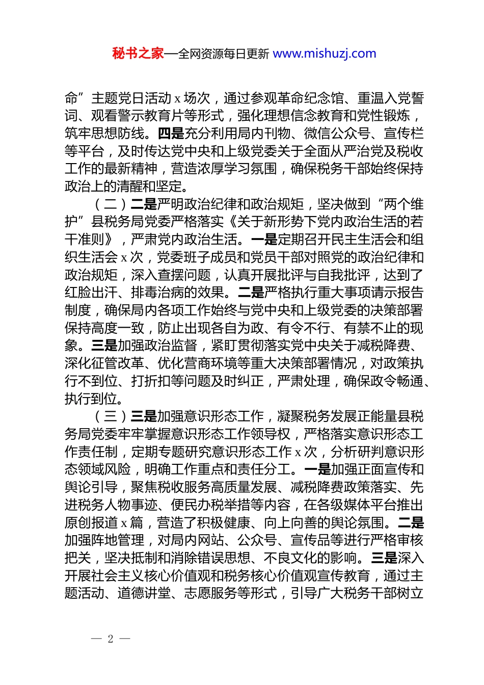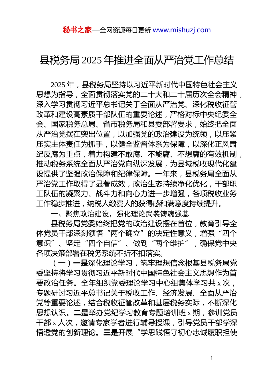 秘书之家—全网资源每日更新 www.mishuzj.com县税务局 2025 年推进全面从严治党工作总结2025 年,县税务局坚持以习近平新时代中国特色社会主义思想为指导,全面贯彻落实党的二十大和二十届历次全会精神,深入学习贯彻习近平总书记关于全面从严治党、深化税收征管改革和建设高素质干部队伍的重要论述,严格对标中央纪委全会、国家税务总局、省市税务局和县委部署要求,始终把全面从严治党摆在突出位置,以加强党的政治建设为统领,以压紧压实主体责任为抓手,以健全监督体系为保障,以深化正风肃纪反腐为重点,着力构建不敢腐、不能腐、不想腐的有效机制,推动税务系统全面从严治党向纵深发展,为县域税收现代化建设提供了坚强政治保障和纪律保障。一年来,县税务局全面从严治党工作取得了显著成效,政治生态持续净化优化,干部职工队伍的凝聚力、战斗力和向心力进一步增强,各项税收业务工作稳步推进,纳税人缴费人的获得感和满意度持续提升。一、聚焦政治建设,强化理论武装铸魂强基县税务局党委始终把党的政治建设摆在首位,教育引导全体党员干部深刻领悟“两个确立”的决定性意义,增强“四个意识”、坚定“四个自信”、做到“两个维护”,确保党中央各项决策部署在税务系统不折不扣落实。(一)一是深化理论学习,筑牢理想信念根基县税务局党委坚持将学习贯彻习近平新时代中国特色社会主义思想作为首要政治任务。全年组织党委理论学习中心组集体学习共 x 次,专题研讨习近平总书记关于税收工作、经济发展、全面从严治党等重要论述,结合税收征管改革和基层税务实际,不断深化思想认识。二是举办党纪学习教育专题培训班 x 期,参训党员干部 x 人次,邀请专家学者进行辅导授课,引导党员干部学深悟透党的创新理论。三是开展“学思践悟守初心忠诚履职担使— 1 —秘书之家—全网资源每日更新 www.mishuzj.com命”主题党日活动 x 场次,通过参观革命纪念馆、重温入党誓词、观看警示教育片等形式,强化理想信念教育和党性锻炼,筑牢思想防线。四是充分利用局内刊物、微信公众号、宣传栏等平台,及时传达党中央和上级党委关于全面从严治党及税收工作的最新精神,营造浓厚学习氛围,确保税务干部始终保持政治上的清醒和坚定。(二)二是严明政治纪律和政治规矩,坚决做到“两个维护”县税务局党委严格落实《关于新形势下党内政治生活的若干准则》,严肃党内政治生活。一是定期召开民主生活会和组织生活会 x 次,党委班子成员和党员干部对照党的政治纪律和政治规矩,深入查摆问题,认真开展批评与自我批评,达到了红脸出汗、排毒治病的效果。二是严格执行重大事项请示报告制度,确保局内各项工作始终与党中央和上级党委的决策部署保持高度一致,防止出现各自为政、有令不行、有禁不止的现象。三是加强政治监督,紧盯贯彻落实党中央关于减税降费、深化征管改革、优化营商环境等重大决策部署情况,对政策执行不到位、打折扣等问题及时纠正,严肃处理,确保政令畅通、执行到位。(三)三是加强意识形态工作,凝聚税务发展正能量县税务局党委牢牢掌握意识形态工作领导权,严格落实意识形态工作责任制,定期专题研究意识形态工作 x 次,分析研判意识形态领域风险,明确工作重点和责任分工。一是加强正面宣传和舆论引导,聚焦税收服务高质量发展、减税降费政策落实、先进税务人物事迹、便民办税举措等内容,在各级媒体平台推出原创报道 x 篇,营造了积极健康、向上向善的舆论氛围。二是加强阵地管理,对局内网站、公众号、宣传品等进行严格审核把关,坚决抵制和消除错误思想、不良文化的影响。三是深入开展社会主义核心价值观和税务核心价值观宣传教育,通过主题活动、道德讲堂、志愿服务等形式,引导广大税务干部树立— 2 —秘书之家—全网资源每日更新 www.mishuzj.com正确的价值导向,为税收事业高质量发展注入强大精神动力。二、压实主体责任,健全管党治党责任体系县税务局党委认真履行全面从严治党主体责任,健全责任体系,完善制度机制,推动管党治党责任层层传导、逐级落实,形成齐抓共管的工作合力。(一)一是完善责任清单,层层传导压力县税务局党委依据上...