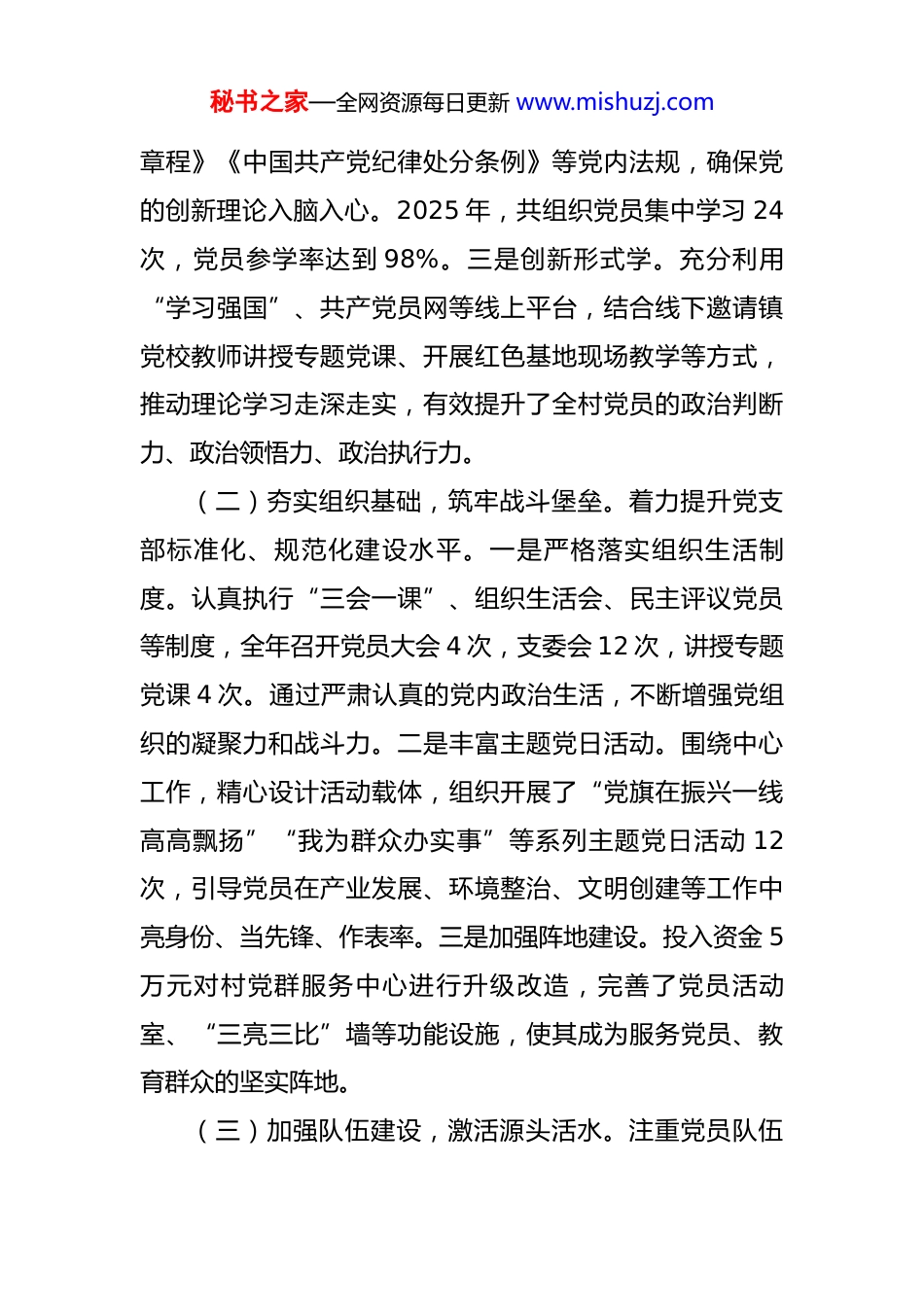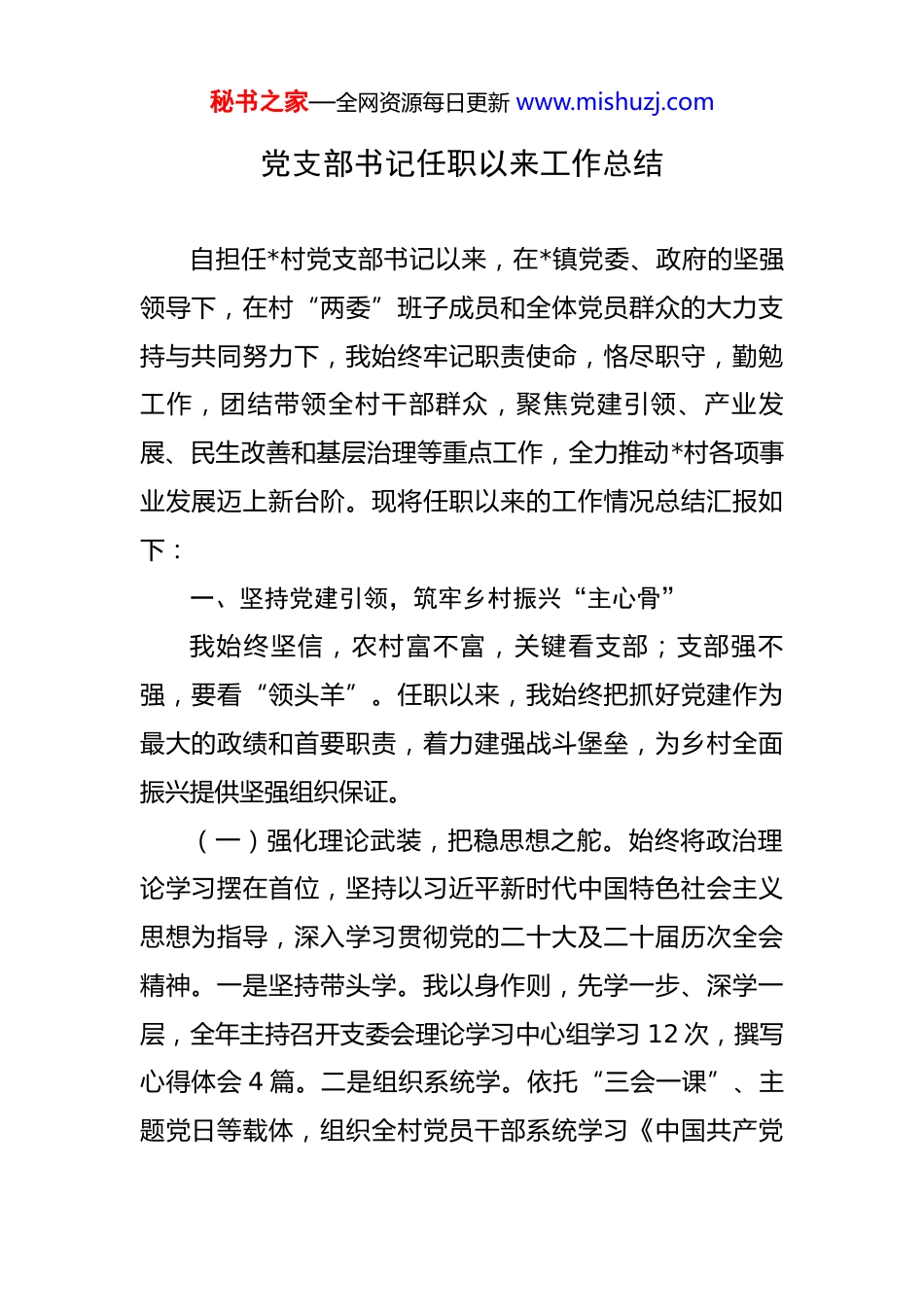 秘书之家—全网资源每日更新 www.mishuzj.com党支部书记任职以来工作总结 自担任*村党支部书记以来,在*镇党委、政府的坚强领导下,在村“两委”班子成员和全体党员群众的大力支持与共同努力下,我始终牢记职责使命,恪尽职守,勤勉工作,团结带领全村干部群众,聚焦党建引领、产业发展、民生改善和基层治理等重点工作,全力推动*村各项事业发展迈上新台阶。现将任职以来的工作情况总结汇报如下:一、坚持党建引领,筑牢乡村振兴“主心骨”我始终坚信,农村富不富,关键看支部;支部强不强,要看“领头羊”。任职以来,我始终把抓好党建作为最大的政绩和首要职责,着力建强战斗堡垒,为乡村全面振兴提供坚强组织保证。(一)强化理论武装,把稳思想之舵。始终将政治理论学习摆在首位,坚持以习近平新时代中国特色社会主义思想为指导,深入学习贯彻党的二十大及二十届历次全会精神。一是坚持带头学。我以身作则,先学一步、深学一层,全年主持召开支委会理论学习中心组学习 12 次,撰写心得体会 4 篇。二是组织系统学。依托“三会一课”、主题党日等载体,组织全村党员干部系统学习《中国共产党秘书之家—全网资源每日更新 www.mishuzj.com章程》《中国共产党纪律处分条例》等党内法规,确保党的创新理论入脑入心。2025 年,共组织党员集中学习 24次,党员参学率达到 98%。三是创新形式学。充分利用“学习强国”、共产党员网等线上平台,结合线下邀请镇党校教师讲授专题党课、开展红色基地现场教学等方式,推动理论学习走深走实,有效提升了全村党员的政治判断力、政治领悟力、政治执行力。(二)夯实组织基础,筑牢战斗堡垒。着力提升党支部标准化、规范化建设水平。一是严格落实组织生活制度。认真执行“三会一课”、组织生活会、民主评议党员等制度,全年召开党员大会 4 次,支委会 12 次,讲授专题党课 4 次。通过严肃认真的党内政治生活,不断增强党组织的凝聚力和战斗力。二是丰富主题党日活动。围绕中心工作,精心设计活动载体,组织开展了“党旗在振兴一线高高飘扬”“我为群众办实事”等系列主题党日活动 12次,引导党员在产业发展、环境整治、文明创建等工作中亮身份、当先锋、作表率。三是加强阵地建设。投入资金 5万元对村党群服务中心进行升级改造,完善了党员活动室、“三亮三比”墙等功能设施,使其成为服务党员、教育群众的坚实阵地。(三)加强队伍建设,激活源头活水。注重党员队伍秘书之家—全网资源每日更新 www.mishuzj.com的教育、管理和发展。一是严把党员“入口关”。坚持标准、严格程序,重点从农村致富带头人、返乡创业青年、退役军人等群体中发展党员。2025 年,共发展新党员 2名,培养入党积极分子 4 名,为党组织注入了新鲜血液。二是搭建干事“练兵场”。建立党员设岗定责制度,设立政策宣传、民情收集、产业发展等 10 个党员先锋岗,让每位党员都有岗有责,在服务群众和推动发展中锤炼党性、增长才干。三是树立先进“风向标”。积极评选表彰“优秀共产党员”“党员致富带众标兵”,并将其先进事迹在村务公开栏进行宣传,营造了学先进、赶先进、当先进的浓厚氛围。(四)擦亮党建品牌,彰显引领实效。通过持续有力的党建工作,我村党支部的组织力、号召力和影响力显著提升。2025 年,我村党支部被*市委授予“先进基层党组织”荣誉称号,同时被*县委评为“人居环境整治工作先进党支部”,并成功入选“全市乡村治理‘过硬党支部’”名单。这些荣誉的取得,是对我们工作的肯定,更是对未来发展的鞭策。二、聚焦产业发展,激活经济增长“新引擎”发展是解决农村一切问题的基础和关键。我带领“两委”班子,立足本村资源禀赋,坚持市场导向,大力发展秘书之家—全网资源每日更新 www.mishuzj.com特色产业,千方百计拓宽村集体和村民的增收渠道。(一)做强特色产业,壮大集体经济。为破解村级集体经济薄弱的难题,我们深入调研论证,决定实施“造血”项目。一是成功落地*村光伏发电与电商中心一体化项目。该项目自 2024 年 3 月启动,于 2025 年 6 月全面建成并网发电。项目总投资 120 万元,其中积极争取上级扶持资...