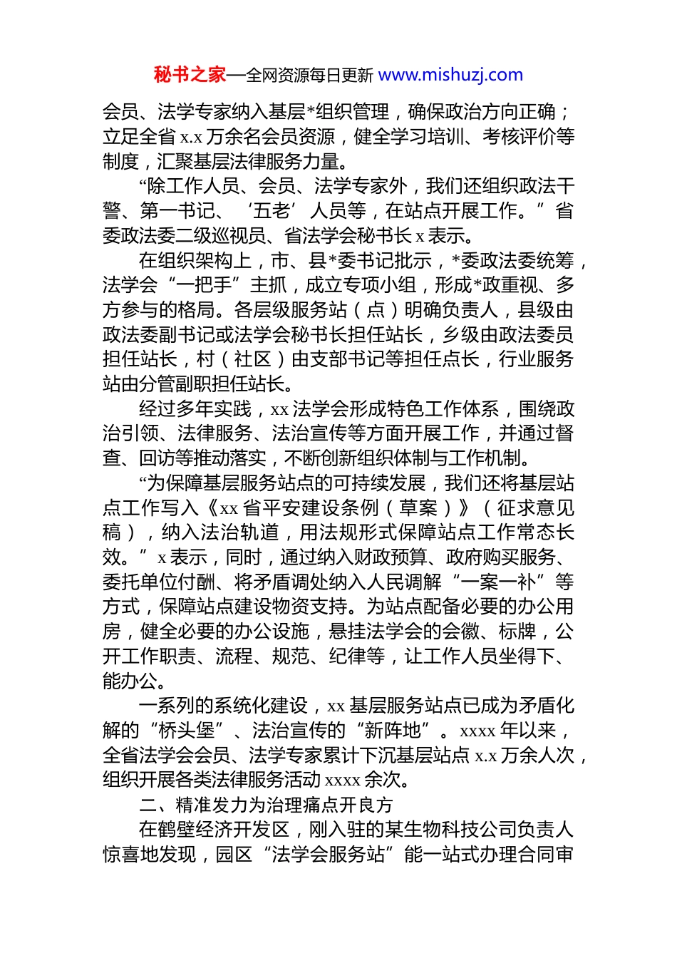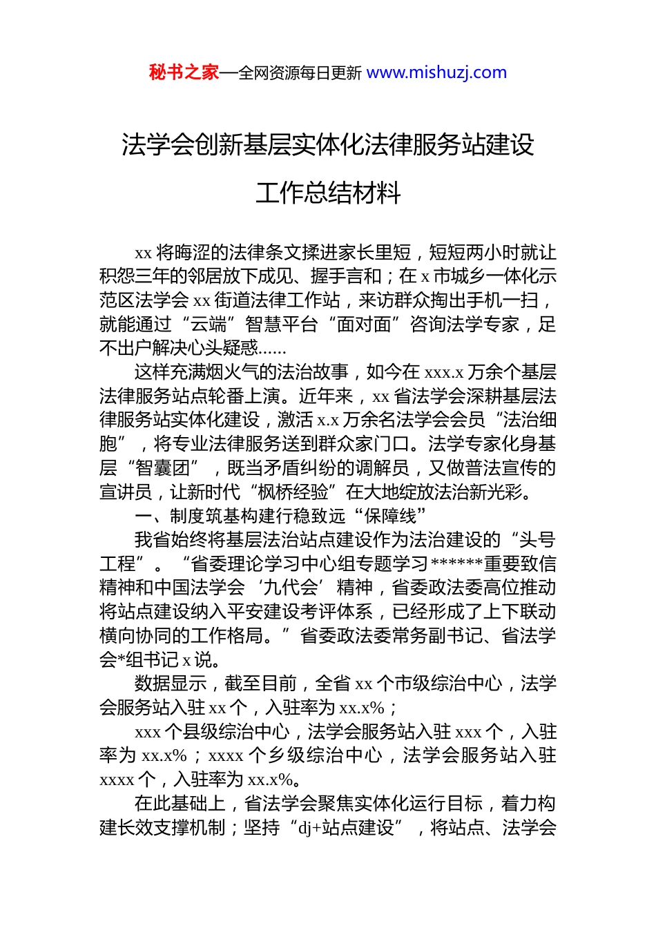秘书之家—全网资源每日更新 www.mishuzj.com法学会创新基层实体化法律服务站建设工作总结材料xx 将晦涩的法律条文揉进家长里短,短短两小时就让积怨三年的邻居放下成见、握手言和;在 x 市城乡一体化示范区法学会 xx 街道法律工作站,来访群众掏出手机一扫,就能通过“云端”智慧平台“面对面”咨询法学专家,足不出户解决心头疑惑……这样充满烟火气的法治故事,如今在 xxx.x 万余个基层法律服务站点轮番上演。近年来,xx 省法学会深耕基层法律服务站实体化建设,激活 x.x 万余名法学会会员“法治细胞”,将专业法律服务送到群众家门口。法学专家化身基层“智囊团”,既当矛盾纠纷的调解员,又做普法宣传的宣讲员,让新时代“枫桥经验”在大地绽放法治新光彩。一、制度筑基构建行稳致远“保障线”我省始终将基层法治站点建设作为法治建设的“头号工程”。“省委理论学习中心组专题学习******重要致信精神和中国法学会‘九代会’精神,省委政法委高位推动将站点建设纳入平安建设考评体系,已经形成了上下联动横向协同的工作格局。”省委政法委常务副书记、省法学会*组书记 x 说。数据显示,截至目前,全省 xx 个市级综治中心,法学会服务站入驻 xx 个,入驻率为 xx.x%;xxx 个县级综治中心,法学会服务站入驻 xxx 个,入驻率为 xx.x%;xxxx 个乡级综治中心,法学会服务站入驻xxxx 个,入驻率为 xx.x%。在此基础上,省法学会聚焦实体化运行目标,着力构建长效支撑机制;坚持“dj+站点建设”,将站点、法学会秘书之家—全网资源每日更新 www.mishuzj.com会员、法学专家纳入基层*组织管理,确保政治方向正确;立足全省 x.x 万余名会员资源,健全学习培训、考核评价等制度,汇聚基层法律服务力量。“除工作人员、会员、法学专家外,我们还组织政法干警、第一书记、‘五老’人员等,在站点开展工作。”省委政法委二级巡视员、省法学会秘书长 x 表示。在组织架构上,市、县*委书记批示,*委政法委统筹,法学会“一把手”主抓,成立专项小组,形成*政重视、多方参与的格局。各层级服务站(点)明确负责人,县级由政法委副书记或法学会秘书长担任站长,乡级由政法委员担任站长,村(社区)由支部书记等担任点长,行业服务站由分管副职担任站长。经过多年实践,xx 法学会形成特色工作体系,围绕政治引领、法律服务、法治宣传等方面开展工作,并通过督查、回访等推动落实,不断创新组织体制与工作机制。“为保障基层服务站点的可持续发展,我们还将基层站点工作写入《xx 省平安建设条例(草案)》(征求意见稿),纳入法治轨道,用法规形式保障站点工作常态长效。”x 表示,同时,通过纳入财政预算、政府购买服务、委托单位付酬、将矛盾调处纳入人民调解“一案一补”等方式,保障站点建设物资支持。为站点配备必要的办公用房,健全必要的办公设施,悬挂法学会的会徽、标牌,公开工作职责、流程、规范、纪律等,让工作人员坐得下、能办公。一系列的系统化建设,xx 基层服务站点已成为矛盾化解的“桥头堡”、法治宣传的“新阵地”。xxxx 年以来,全省法学会会员、法学专家累计下沉基层站点 x.x 万余人次,组织开展各类法律服务活动 xxxx 余次。二、精准发力为治理痛点开良方在鹤壁经济开发区,刚入驻的某生物科技公司负责人惊喜地发现,园区“法学会服务站”能一站式办理合同审秘书之家—全网资源每日更新 www.mishuzj.com查、劳动仲裁等 xx 项法律服务。“过去跑多个部门的事,现在半天就能搞定。”该负责人感慨道。这种精准服务模式正在 xx 全省铺开:针对基层治理主体分散、资源错配等难题,省法学会通过“补位—充值—借势”三效协同机制,组织推动基层站点融入基层治理网格,实现与基层法律服务体系的互补增效。补位增效:在法治单位空缺的“功能区”等建立服务站点 xxx 个,开展“送法进企”;在法治力量薄弱的行业部门开展“送法进单位”;参与执法检查、参加风险评估等,啃下了一批骨头案、疑难事。充值增效:以人员“入股”、智力“入股”、法律“入股”的方式,组织法学专家、站点参与矛盾化解、一村一警等,业务联动、矛盾联调,同...