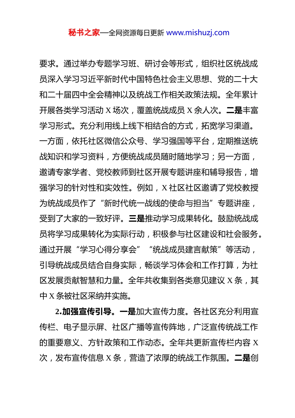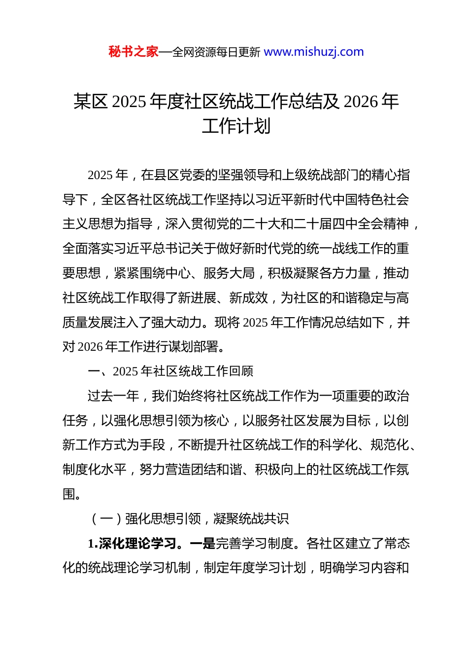 秘书之家—全网资源每日更新 www.mishuzj.com某区 2025 年度社区统战工作总结及 2026 年工作计划 2025 年,在县区党委的坚强领导和上级统战部门的精心指导下,全区各社区统战工作坚持以习近平新时代中国特色社会主义思想为指导,深入贯彻党的二十大和二十届四中全会精神,全面落实习近平总书记关于做好新时代党的统一战线工作的重要思想,紧紧围绕中心、服务大局,积极凝聚各方力量,推动社区统战工作取得了新进展、新成效,为社区的和谐稳定与高质量发展注入了强大动力。现将 2025 年工作情况总结如下,并对 2026 年工作进行谋划部署。一、2025 年社区统战工作回顾过去一年,我们始终将社区统战工作作为一项重要的政治任务,以强化思想引领为核心,以服务社区发展为目标,以创新工作方式为手段,不断提升社区统战工作的科学化、规范化、制度化水平,努力营造团结和谐、积极向上的社区统战工作氛围。(一)强化思想引领,凝聚统战共识1.深化理论学习。一是完善学习制度。各社区建立了常态化的统战理论学习机制,制定年度学习计划,明确学习内容和秘书之家—全网资源每日更新 www.mishuzj.com要求。通过举办专题学习班、研讨会等形式,组织社区统战成员深入学习习近平新时代中国特色社会主义思想、党的二十大和二十届四中全会精神以及统战工作相关政策法规。全年累计开展各类学习活动 X 场次,覆盖统战成员 X 余人次。二是丰富学习形式。充分利用线上线下相结合的方式,拓宽学习渠道。一方面,依托社区微信公众号、学习强国等平台,定期推送统战知识和学习资料,方便统战成员随时随地学习;另一方面,邀请专家学者、党校教师到社区开展专题讲座和辅导报告,增强学习的针对性和实效性。例如,X 社区社区邀请了党校教授为统战成员作了“新时代统一战线的使命与担当”专题讲座,受到了大家的一致好评。三是推动学习成果转化。鼓励统战成员将学习成果转化为实际行动,积极参与社区建设和社会服务。通过开展“学习心得分享会”“统战成员建言献策”等活动,引导统战成员结合自身实际,畅谈学习体会和工作打算,为社区发展贡献智慧和力量。全年共收集到各类意见建议 X 条,其中 X 条被社区采纳并实施。2.加强宣传引导。一是加大宣传力度。各社区充分利用宣传栏、电子显示屏、社区广播等宣传阵地,广泛宣传统战工作的重要意义、方针政策和工作动态。全年共更新宣传栏内容 X次,发布宣传信息 X 条,营造了浓厚的统战工作氛围。二是创秘书之家—全网资源每日更新 www.mishuzj.com新宣传方式。积极运用新媒体平台开展宣传工作,制作发布统战工作短视频、图文并茂的推文等,增强宣传的吸引力和感染力。例如,X 社区社区制作了“社区统战风采”系列短视频,展示了统战成员在社区建设中的积极贡献,在社区居民中引起了强烈反响。三是开展主题宣传活动。结合重要节日和纪念日,组织开展形式多样的主题宣传活动,如“民族团结进步宣传月”“统战知识竞赛”等,增进社区居民对统战工作的了解和认识。全年共开展主题宣传活动 X 场次,参与居民达 X 余人次。(二)服务社区发展,彰显统战作为1.助力社区经济发展。一是搭建交流平台。各社区积极组织开展“社区企业座谈会”“招商推介会”等活动,邀请社区内企业代表、异地商会会员等参加,为企业搭建交流合作的平台,促进资源共享、互利共赢。全年共举办各类活动 X 场次,成功引进项目 X 个,总投资达 X 万元。二是提供精准服务。建立社区统战干部联系重点企业制度,定期走访企业,了解企业发展需求,协调解决企业在用地、融资、用工等方面遇到的困难和问题。全年共走访企业 X 家次,协调解决问题 X 个,为企业发展提供了有力支持。三是推动创新创业。鼓励和支持统战成员在社区内创新创业,为他们提供政策咨询、创业培训、项目推荐等服务。例如,X 社区社区举办了“创新创业大讲堂”秘书之家—全网资源每日更新 www.mishuzj.com活动,邀请创业成功人士分享经验,激发了统战成员的创业热情。全年共有 X 名统战成员成功创业,带动就业 X 余人。2.参与社区建设与治理。一是参与社区环境整治。组织统战成员...