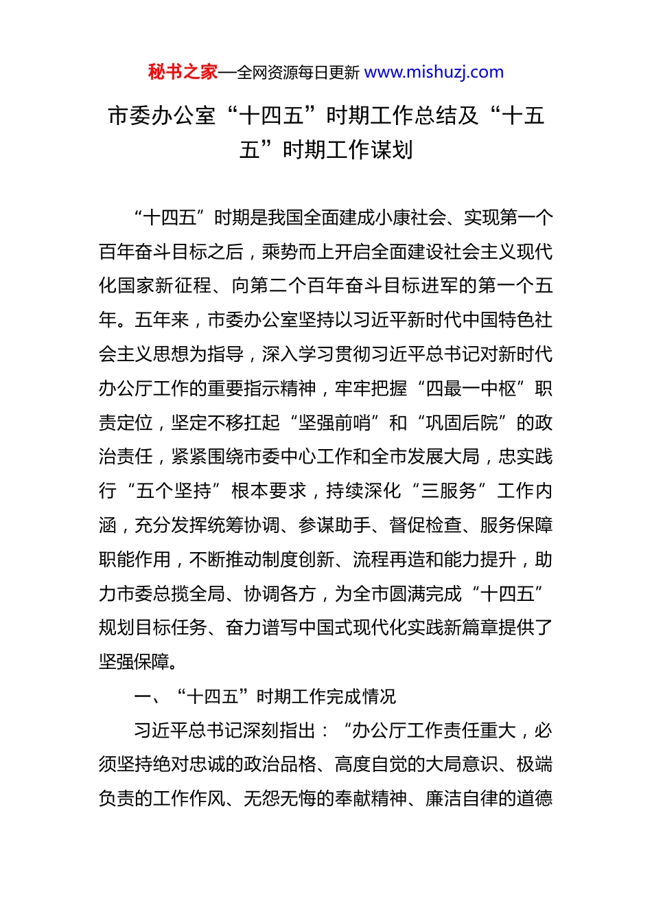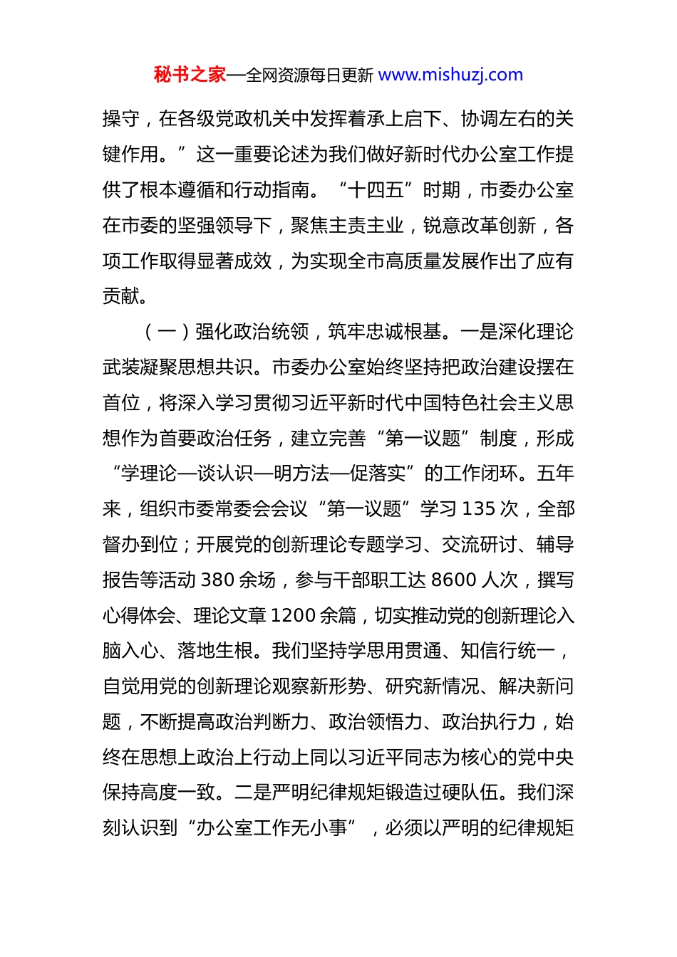 秘书之家—全网资源每日更新 www.mishuzj.com市委办公室“十四五”时期工作总结及“十五五”时期工作谋划 “十四五”时期是我国全面建成小康社会、实现第一个百年奋斗目标之后,乘势而上开启全面建设社会主义现代化国家新征程、向第二个百年奋斗目标进军的第一个五年。五年来,市委办公室坚持以习近平新时代中国特色社会主义思想为指导,深入学习贯彻习近平总书记对新时代办公厅工作的重要指示精神,牢牢把握“四最一中枢”职责定位,坚定不移扛起“坚强前哨”和“巩固后院”的政治责任,紧紧围绕市委中心工作和全市发展大局,忠实践行“五个坚持”根本要求,持续深化“三服务”工作内涵,充分发挥统筹协调、参谋助手、督促检查、服务保障职能作用,不断推动制度创新、流程再造和能力提升,助力市委总揽全局、协调各方,为全市圆满完成“十四五”规划目标任务、奋力谱写中国式现代化实践新篇章提供了坚强保障。一、“十四五”时期工作完成情况习近平总书记深刻指出:“办公厅工作责任重大,必须坚持绝对忠诚的政治品格、高度自觉的大局意识、极端负责的工作作风、无怨无悔的奉献精神、廉洁自律的道德秘书之家—全网资源每日更新 www.mishuzj.com操守,在各级党政机关中发挥着承上启下、协调左右的关键作用。”这一重要论述为我们做好新时代办公室工作提供了根本遵循和行动指南。“十四五”时期,市委办公室在市委的坚强领导下,聚焦主责主业,锐意改革创新,各项工作取得显著成效,为实现全市高质量发展作出了应有贡献。(一)强化政治统领,筑牢忠诚根基。一是深化理论武装凝聚思想共识。市委办公室始终坚持把政治建设摆在首位,将深入学习贯彻习近平新时代中国特色社会主义思想作为首要政治任务,建立完善“第一议题”制度,形成“学理论—谈认识—明方法—促落实”的工作闭环。五年来,组织市委常委会会议“第一议题”学习 135 次,全部督办到位;开展党的创新理论专题学习、交流研讨、辅导报告等活动 380 余场,参与干部职工达 8600 人次,撰写心得体会、理论文章 1200 余篇,切实推动党的创新理论入脑入心、落地生根。我们坚持学思用贯通、知信行统一,自觉用党的创新理论观察新形势、研究新情况、解决新问题,不断提高政治判断力、政治领悟力、政治执行力,始终在思想上政治上行动上同以习近平同志为核心的党中央保持高度一致。二是严明纪律规矩锻造过硬队伍。我们深刻认识到“办公室工作无小事”,必须以严明的纪律规矩秘书之家—全网资源每日更新 www.mishuzj.com锻造忠诚干净担当的干部队伍。制定出台《市委办公室严肃工作纪律十项规定》《市委办干部八小时之外行为规范》《市委办领导身边工作人员纪律规定》等制度文件,从政治纪律、组织纪律、廉洁纪律、群众纪律、工作纪律、生活纪律等方面提出明确要求。开展纪律教育学习宣传活动 156 场,覆盖干部职工 100%;组织廉政风险点排查 12 次,排查风险点 86 个,全部制定防控措施;常态化开展警示教育,组织观看警示教育片 98 场,通报典型案例45 起,引导干部职工知敬畏、存戒惧、守底线,营造了风清气正的政治生态。三是强化政治担当确保政令畅通。市委办公室作为政治机关,始终把“两个维护”作为最高政治原则和根本政治规矩,建立健全习近平总书记重要指示批示精神和党中央决策部署贯彻落实闭环管理机制。五年来,督办落实中央和省级重要文件 300 余件,建立工作台账 150 余册,采取月调度、季梳理、半年分析、年底重点督办的形式,确保中央政令畅通、省委部署落地生根。我们加强对贯彻落实情况的跟踪问效,开展专项督查 85 次,形成督查报告 76 份,提出整改建议 230 条,推动解决了一批贯彻落实中的堵点难点问题,切实将“两个维护”融入血脉、见诸行动。(二)提升辅政水平,服务科学决策。一是优化信息秘书之家—全网资源每日更新 www.mishuzj.com服务辅助精准研判。市委办公室坚持“围绕中心、服务大局”,充分发挥信息主渠道作用,不断完善信息收集、研判、报送机制。五年来,向上级党委报送信息 2560 条,其中被采用 820 条,获得中央领导批示 7 条,省委领导批示89 条...