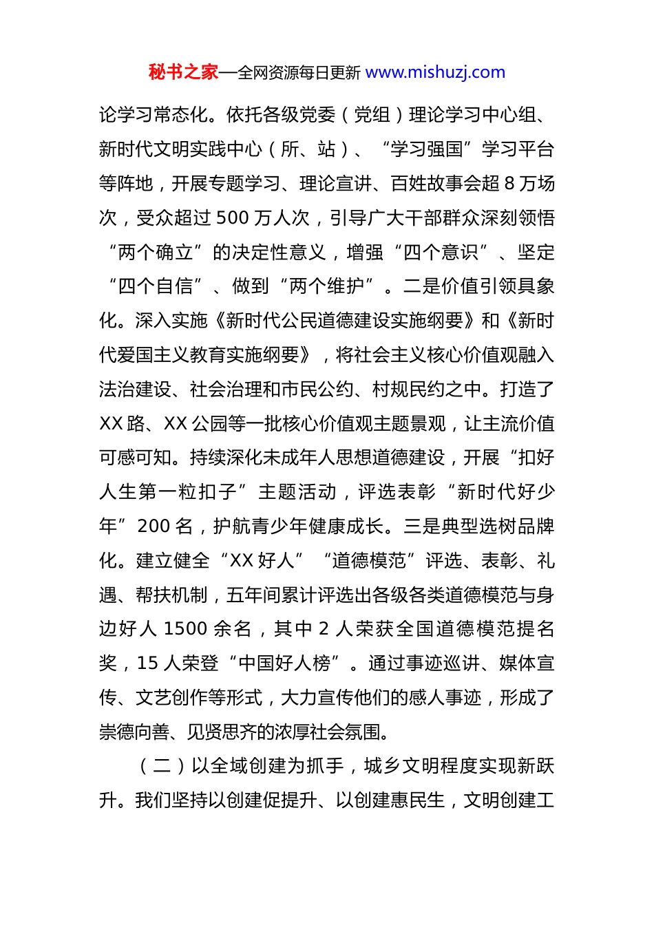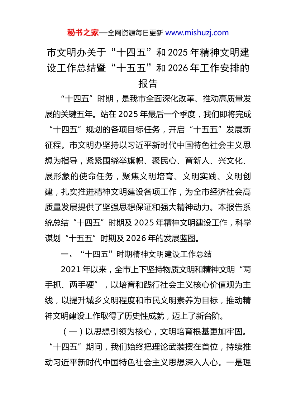 秘书之家—全网资源每日更新 www.mishuzj.com市文明办关于“十四五”和 2025 年精神文明建设工作总结暨“十五五”和 2026 年工作安排的报告 “十四五”时期,是我市全面深化改革、推动高质量发展的关键五年。站在 2025 年最后一个季度,我们即将完成“十四五”规划的各项目标任务,开启“十五五”发展新征程。市文明办坚持以习近平新时代中国特色社会主义思想为指导,紧紧围绕举旗帜、聚民心、育新人、兴文化、展形象的使命任务,聚焦文明培育、文明实践、文明创建,扎实推进精神文明建设各项工作,为全市经济社会高质量发展提供了坚强思想保证和强大精神动力。本报告系统总结“十四五”时期及 2025 年精神文明建设工作,科学谋划“十五五”时期及 2026 年的发展蓝图。一、“十四五”时期精神文明建设工作总结2021 年以来,全市上下坚持物质文明和精神文明“两手抓、两手硬”,以培育和践行社会主义核心价值观为主线,以提升城乡文明程度和市民文明素养为目标,推动精神文明建设工作取得了历史性成就,迈上了新台阶。(一)以思想引领为核心,文明培育根基更加牢固。“十四五”期间,我们始终把理论武装摆在首位,持续推动习近平新时代中国特色社会主义思想深入人心。一是理秘书之家—全网资源每日更新 www.mishuzj.com论学习常态化。依托各级党委(党组)理论学习中心组、新时代文明实践中心(所、站)、“学习强国”学习平台等阵地,开展专题学习、理论宣讲、百姓故事会超 8 万场次,受众超过 500 万人次,引导广大干部群众深刻领悟“两个确立”的决定性意义,增强“四个意识”、坚定“四个自信”、做到“两个维护”。二是价值引领具象化。深入实施《新时代公民道德建设实施纲要》和《新时代爱国主义教育实施纲要》,将社会主义核心价值观融入法治建设、社会治理和市民公约、村规民约之中。打造了XX 路、XX 公园等一批核心价值观主题景观,让主流价值可感可知。持续深化未成年人思想道德建设,开展“扣好人生第一粒扣子”主题活动,评选表彰“新时代好少年”200 名,护航青少年健康成长。三是典型选树品牌化。建立健全“XX 好人”“道德模范”评选、表彰、礼遇、帮扶机制,五年间累计评选出各级各类道德模范与身边好人 1500 余名,其中 2 人荣获全国道德模范提名奖,15 人荣登“中国好人榜”。通过事迹巡讲、媒体宣传、文艺创作等形式,大力宣传他们的感人事迹,形成了崇德向善、见贤思齐的浓厚社会氛围。(二)以全域创建为抓手,城乡文明程度实现新跃升。我们坚持以创建促提升、以创建惠民生,文明创建工秘书之家—全网资源每日更新 www.mishuzj.com作由点及面、全域推进,成果丰硕。一是成功摘取省级荣誉。经过全市人民不懈努力,我市于 2023 年成功荣获“XX 省文明城市”荣誉称号,这是我市精神文明建设史上具有里程碑意义的重大成就,极大提升了城市的知名度、美誉度和市民的自豪感、归属感。二是城乡创建扩面提质。坚持城乡“一盘棋”,扎实推进文明村镇、文明单位、文明家庭、文明校园创建。截至 2025 年底,全市县级及以上文明村镇占比达到 78%,县级及以上文明单位占比达到 85%,均超额完成“十四五”规划目标。建成了一批诸如 XX 镇、XX 村等在全省具有影响力的文明创建示范点。三是创建内涵持续深化。将文明创建与城市更新、乡村振兴、人居环境整治等中心工作紧密结合,累计完成3500 个老旧小区改造,新建“口袋公园”120 个,农村户用卫生厕所普及率达到 88%。通过文明创建,有效解决了一批群众“急难愁盼”问题,城市功能与品质、乡村面貌得到显著改善。(三)以移风易俗为突破,社会文明新风尚广泛弘扬。紧盯陈规陋习和突出问题,深入推进移风易俗,着力培育文明乡风、良好家风、淳朴民风。一是治理体系不断完善。全市 1200 余个行政村全部建立红白理事会、村民议事会等群众自治组织,将婚事新办、丧事简办、喜事俭办秘书之家—全网资源每日更新 www.mishuzj.com等要求纳入村规民约,有效遏制了高价彩礼、大操大办、铺张浪费等不良风气。二是实践活动丰富多彩。广泛开展“反对浪费、崇尚节约”文明行动,深化“文明餐...