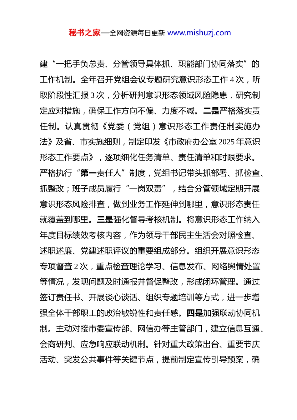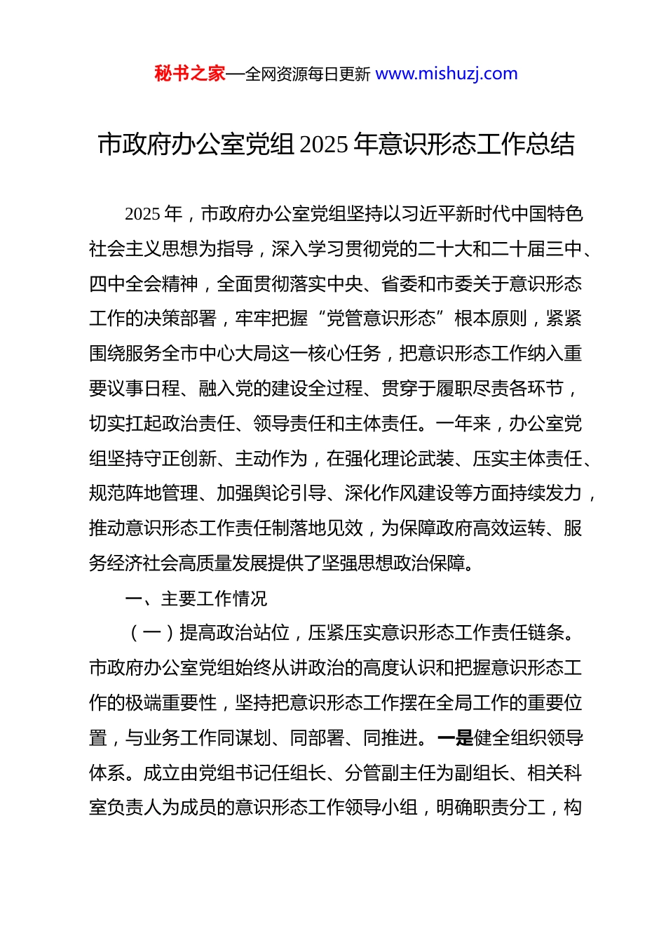 秘书之家—全网资源每日更新 www.mishuzj.com市政府办公室党组 2025 年意识形态工作总结 2025 年,市政府办公室党组坚持以习近平新时代中国特色社会主义思想为指导,深入学习贯彻党的二十大和二十届三中、四中全会精神,全面贯彻落实中央、省委和市委关于意识形态工作的决策部署,牢牢把握“党管意识形态”根本原则,紧紧围绕服务全市中心大局这一核心任务,把意识形态工作纳入重要议事日程、融入党的建设全过程、贯穿于履职尽责各环节,切实扛起政治责任、领导责任和主体责任。一年来,办公室党组坚持守正创新、主动作为,在强化理论武装、压实主体责任、规范阵地管理、加强舆论引导、深化作风建设等方面持续发力,推动意识形态工作责任制落地见效,为保障政府高效运转、服务经济社会高质量发展提供了坚强思想政治保障。一、主要工作情况(一)提高政治站位,压紧压实意识形态工作责任链条。市政府办公室党组始终从讲政治的高度认识和把握意识形态工作的极端重要性,坚持把意识形态工作摆在全局工作的重要位置,与业务工作同谋划、同部署、同推进。一是健全组织领导体系。成立由党组书记任组长、分管副主任为副组长、相关科室负责人为成员的意识形态工作领导小组,明确职责分工,构秘书之家—全网资源每日更新 www.mishuzj.com建“一把手负总责、分管领导具体抓、职能部门协同落实”的工作机制。全年召开党组会议专题研究意识形态工作 4 次,听取阶段性汇报 3 次,分析研判意识形态领域风险隐患,研究制定应对措施,确保工作方向不偏、力度不减。二是严格落实责任制。认真贯彻《党委(党组)意识形态工作责任制实施办法》及省、市实施细则,制定印发《市政府办公室 2025 年意识形态工作要点》,逐项细化任务清单、责任清单和时限要求。严格执行“第一责任人”制度,党组书记带头抓部署、抓检查、抓整改;班子成员履行“一岗双责”,结合分管领域定期开展意识形态风险排查,做到业务工作延伸到哪里,意识形态责任就覆盖到哪里。三是强化督导考核机制。将意识形态工作纳入年度目标绩效考核内容,作为领导干部民主生活会对照检查、述职述廉、党建述职评议的重要组成部分。组织开展意识形态专项督查 2 次,重点检查理论学习、信息发布、网络舆情处置等情况,发现问题及时通报并督促整改,形成闭环管理。通过签订责任书、开展谈心谈话、组织专题培训等方式,进一步增强全体干部职工的政治敏锐性和责任感。四是加强联动协同机制。主动对接市委宣传部、网信办等主管部门,建立信息互通、会商研判、应急响应联动机制。针对重大政策出台、重要节庆活动、突发公共事件等关键节点,提前制定宣传引导预案,确秘书之家—全网资源每日更新 www.mishuzj.com保思想引领有力、舆论导向正确、舆情应对有序。(二)深化理论武装,筑牢党员干部理想信念根基。市政府办公室坚持把理论学习作为加强意识形态建设的根本途径,持续推进学习型机关建设,不断提升党员干部的政治判断力、政治领悟力、政治执行力。一是严格落实“第一议题”制度。坚持把学习贯彻习近平总书记最新重要讲话、重要指示批示精神作为党组会议、党支部大会的首要议题。全年围绕习近平总书记关于主题教育、高质量发展、国家安全、生态文明、数字政府建设等重要论述开展专题学习 18 次,撰写学习体会文章 60余篇,切实做到学思用贯通、知信行统一。二是系统推进理论学习常态化。制定《市政府办公室 2025 年度理论学习计划》,以党组理论学习中心组为龙头,带动各党支部、青年理论学习小组同步跟进。全年组织中心组集中学习 12 次,邀请专家学者作专题辅导报告 4 场,围绕“中国式现代化与政府治理能力提升”“数字经济背景下的政务服务改革”等主题开展研讨交流6 次,推动理论学习走深走实。三是丰富学习形式载体。依托“三会一课”、主题党日、读书班等形式,组织开展“读原著、学原文、悟原理”活动,发放《习近平谈治国理政》第五卷等学习资料 200 余册。举办“政办讲堂”系列讲座 6 期,由处室负责人、业务骨干围绕公文写作、应急管理、依法行政等内容秘书之家—全网资源每日更新 www.mishuzj.com登...