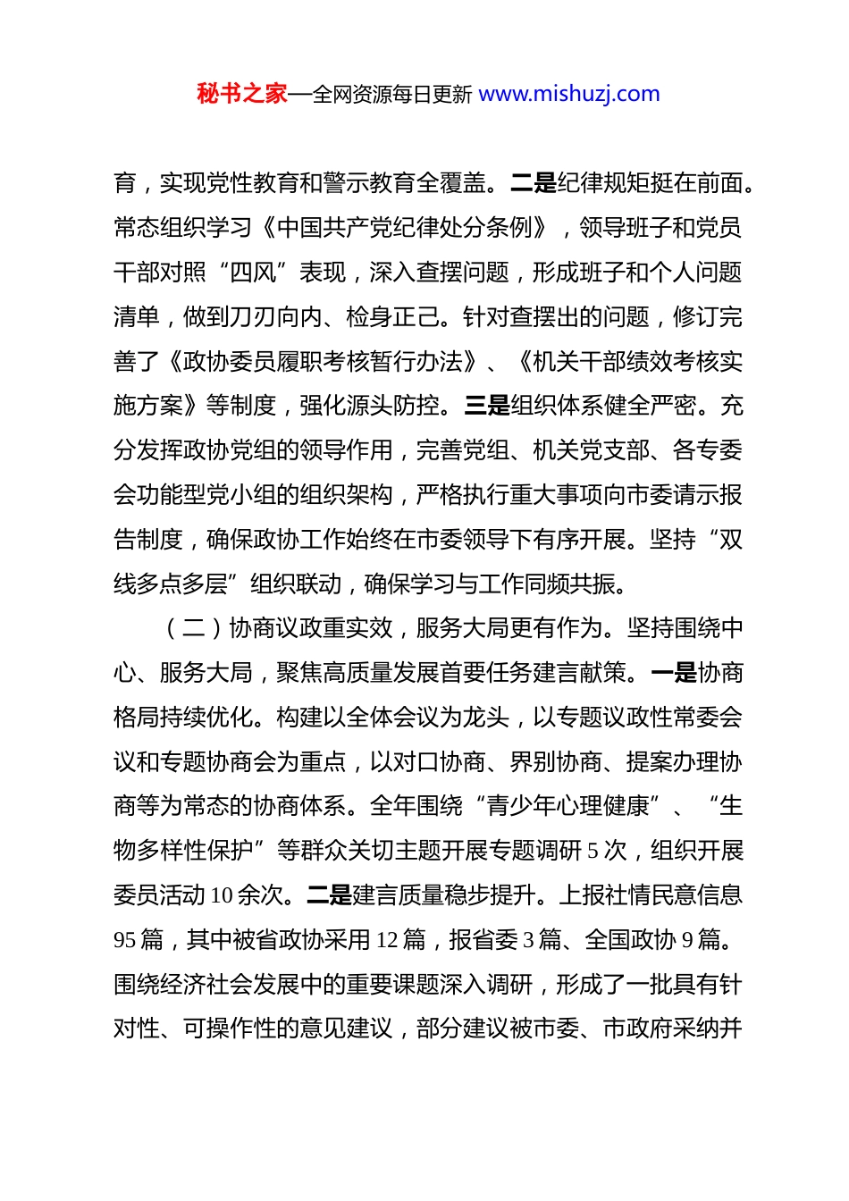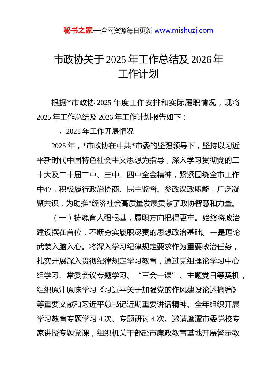 秘书之家—全网资源每日更新 www.mishuzj.com市政协关于 2025 年工作总结及 2026 年工作计划 根据*市政协 2025 年度工作安排和实际履职情况,现将2025 年工作总结及 2026 年工作计划报告如下:一、2025 年工作开展情况2025 年,*市政协在中共*市委的坚强领导下,坚持以习近平新时代中国特色社会主义思想为指导,深入学习贯彻党的二十大及二十届二中、三中、四中全会精神,紧紧围绕全市工作中心,积极履行政治协商、民主监督、参政议政职能,广泛凝聚共识,为助推*经济社会高质量发展贡献了政协智慧和力量。(一)铸魂育人强根基,履职方向把得更牢。始终将政治建设摆在首位,不断夯实履职尽责的思想政治基础。一是理论武装入脑入心。将深入学习纪律规定要求作为重要政治任务,扎实开展深入贯彻纪律规定学习教育,通过党组理论学习中心组学习、常委会议专题学习、“三会一课”、主题党日等契机,组织原汁原味学习《习近平关于加强党的作风建设论述摘编》等重要文献和习近平总书记近期重要讲话精神。全年组织开展学习教育专题学习 4 次、专题研讨 4 次。邀请鹰潭市委党校专家讲授专题党课,组织机关干部赴市廉政教育基地开展警示教秘书之家—全网资源每日更新 www.mishuzj.com育,实现党性教育和警示教育全覆盖。二是纪律规矩挺在前面。常态组织学习《中国共产党纪律处分条例》,领导班子和党员干部对照“四风”表现,深入查摆问题,形成班子和个人问题清单,做到刀刃向内、检身正己。针对查摆出的问题,修订完善了《政协委员履职考核暂行办法》、《机关干部绩效考核实施方案》等制度,强化源头防控。三是组织体系健全严密。充分发挥政协党组的领导作用,完善党组、机关党支部、各专委会功能型党小组的组织架构,严格执行重大事项向市委请示报告制度,确保政协工作始终在市委领导下有序开展。坚持“双线多点多层”组织联动,确保学习与工作同频共振。(二)协商议政重实效,服务大局更有作为。坚持围绕中心、服务大局,聚焦高质量发展首要任务建言献策。一是协商格局持续优化。构建以全体会议为龙头,以专题议政性常委会议和专题协商会为重点,以对口协商、界别协商、提案办理协商等为常态的协商体系。全年围绕“青少年心理健康”、“生物多样性保护”等群众关切主题开展专题调研 5 次,组织开展委员活动 10 余次。二是建言质量稳步提升。上报社情民意信息95 篇,其中被省政协采用 12 篇,报省委 3 篇、全国政协 9 篇。围绕经济社会发展中的重要课题深入调研,形成了一批具有针对性、可操作性的意见建议,部分建议被市委、市政府采纳并秘书之家—全网资源每日更新 www.mishuzj.com转化为具体政策举措。三是民主监督精准发力。聚焦教育、医疗、养老、食品安全等民生领域,组织委员开展专项视察和监督性调研 9 次。针对城市管理、环境卫生、道路交通安全等问题,通过“协商为贵”委员工作群等平台推动解决民生实事 30余件,提升了民主监督实效。设立政协委员“民生实事商量办”协商成果转化专项资金 200 余万元,推动 30 个民生实事项目落地,惠及群众超 10 万人。(三)团结民主聚共识,桥梁纽带更加紧密。坚持大团结大联合,有效发挥统一战线组织功能,广泛汇聚发展合力。一是合作共事富有成效。加强与各民主党派、工商联、无党派人士和各人民团体的联系沟通,优先安排其在政协各类会议上发表意见,联合开展调研视察。积极为党外知识分子、非公有制经济人士、新的社会阶层人士履职建言创造条件。二是凝聚共识形式多样。成功举办“同心筑梦”书画摄影展等活动,展现发展成就,凝聚奋进力量。组织委员深入乡镇、社区、企业开展政策宣讲、理论普及活动,协助党委政府做好协调关系、化解矛盾、理顺情绪的工作。三是联系界别用心用情。完善委员联系界别群众制度机制,鼓励委员深入基层听取民意、反映诉求。优化“数字政协”平台功能,通过网站和微信公众号发布信息,扩大政协工作社会影响。利用线上平台开展网络议政,秘书之家—全网资源每日更新 www.mishuzj.com拓宽委员履职和公众参与渠道。二、工作中存在的问题与不足在总结成绩的同时,我们...