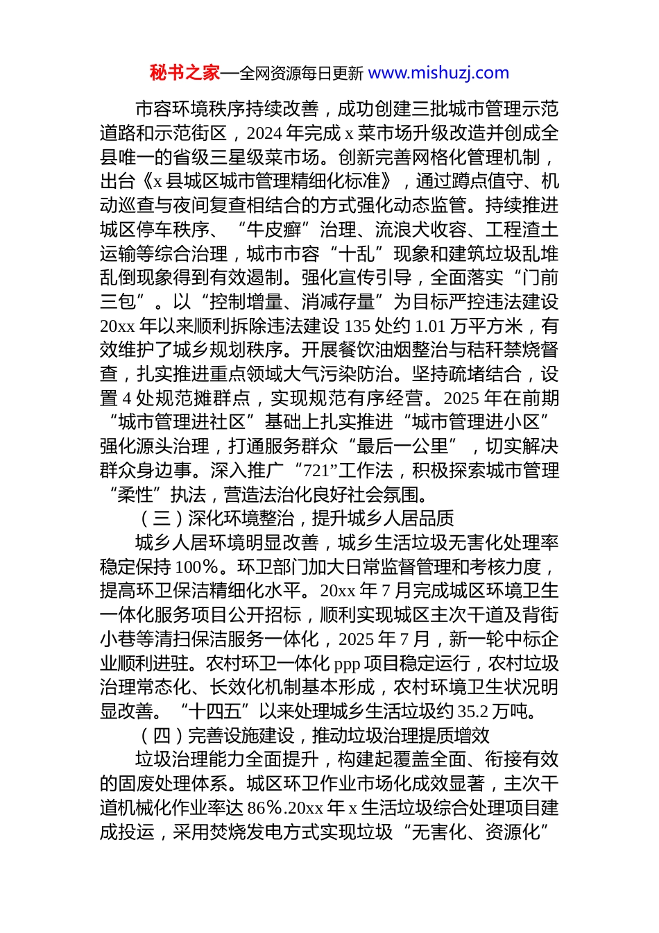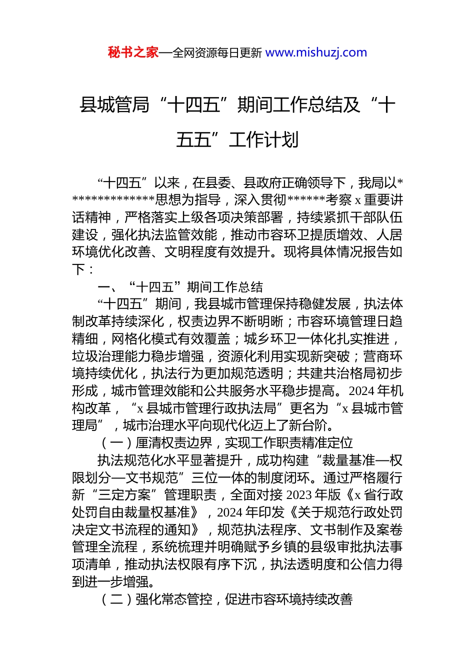 秘书之家—全网资源每日更新 www.mishuzj.com县城管局“十四五”期间工作总结及“十五五”工作计划“十四五”以来,在县委、县政府正确领导下,我局以**************思想为指导,深入贯彻******考察 x 重要讲话精神,严格落实上级各项决策部署,持续紧抓干部队伍建设,强化执法监管效能,推动市容环卫提质增效、人居环境优化改善、文明程度有效提升。现将具体情况报告如下:一、“十四五”期间工作总结“十四五”期间,我县城市管理保持稳健发展,执法体制改革持续深化,权责边界不断明晰;市容环境管理日趋精细,网格化模式有效覆盖;城乡环卫一体化扎实推进,垃圾治理能力稳步增强,资源化利用实现新突破;营商环境持续优化,执法行为更加规范透明;共建共治格局初步形成,城市管理效能和公共服务水平稳步提高。2024 年机构改革,“x 县城市管理行政执法局”更名为“x 县城市管理局”,城市治理水平向现代化迈上了新台阶。(一)厘清权责边界,实现工作职责精准定位执法规范化水平显著提升,成功构建“裁量基准—权限划分—文书规范”三位一体的制度闭环。通过严格履行新“三定方案”管理职责,全面对接 2023 年版《x 省行政处罚自由裁量权基准》,2024 年印发《关于规范行政处罚决定文书流程的通知》,规范执法程序、文书制作及案卷管理全流程,系统梳理并明确赋予乡镇的县级审批执法事项清单,推动执法权限有序下沉,执法透明度和公信力得到进一步增强。(二)强化常态管控,促进市容环境持续改善秘书之家—全网资源每日更新 www.mishuzj.com市容环境秩序持续改善,成功创建三批城市管理示范道路和示范街区,2024 年完成 x 菜市场升级改造并创成全县唯一的省级三星级菜市场。创新完善网格化管理机制,出台《x 县城区城市管理精细化标准》,通过蹲点值守、机动巡查与夜间复查相结合的方式强化动态监管。持续推进城区停车秩序、“牛皮癣”治理、流浪犬收容、工程渣土运输等综合治理,城市市容“十乱”现象和建筑垃圾乱堆乱倒现象得到有效遏制。强化宣传引导,全面落实“门前三包”。以“控制增量、消减存量”为目标严控违法建设20xx 年以来顺利拆除违法建设 135 处约 1.01 万平方米,有效维护了城乡规划秩序。开展餐饮油烟整治与秸秆禁烧督查,扎实推进重点领域大气污染防治。坚持疏堵结合,设置 4 处规范摊群点,实现规范有序经营。2025 年在前期“城市管理进社区”基础上扎实推进“城市管理进小区”强化源头治理,打通服务群众“最后一公里”,切实解决群众身边事。深入推广“721”工作法,积极探索城市管理“柔性”执法,营造法治化良好社会氛围。(三)深化环境整治,提升城乡人居品质城乡人居环境明显改善,城乡生活垃圾无害化处理率稳定保持 100%。环卫部门加大日常监督管理和考核力度,提高环卫保洁精细化水平。20xx 年 7 月完成城区环境卫生一体化服务项目公开招标,顺利实现城区主次干道及背街小巷等清扫保洁服务一体化,2025 年 7 月,新一轮中标企业顺利进驻。农村环卫一体化 ppp 项目稳定运行,农村垃圾治理常态化、长效化机制基本形成,农村环境卫生状况明显改善。“十四五”以来处理城乡生活垃圾约 35.2 万吨。(四)完善设施建设,推动垃圾治理提质增效垃圾治理能力全面提升,构建起覆盖全面、衔接有效的固废处理体系。城区环卫作业市场化成效显著,主次干道机械化作业率达 86%.20xx 年 x 生活垃圾综合处理项目建成投运,采用焚烧发电方式实现垃圾“无害化、资源化”秘书之家—全网资源每日更新 www.mishuzj.com处理,年处理垃圾约 15 万吨,年发电量 5040 万千瓦时,减排成效突出。20xx 年实施县城生活垃圾填埋场垃圾开挖转运运营管理服务项目,督促中标企业严格按照规范要求安全运营,累计开挖转运垃圾约 14.7 万吨,处理渗滤液约11.9 万吨,指导环卫企业落实专人值守,全天候管护等措施,保障建筑垃圾临时处置场稳定运行,启动年处理能力 10 万吨的建筑垃圾资源化利用项目,为“无废城市”建设提供坚实支撑,推动城市绿色低碳发展。(五)优化营商环境,激发城市发展新活力营商环境持续优化,服务效能大幅...