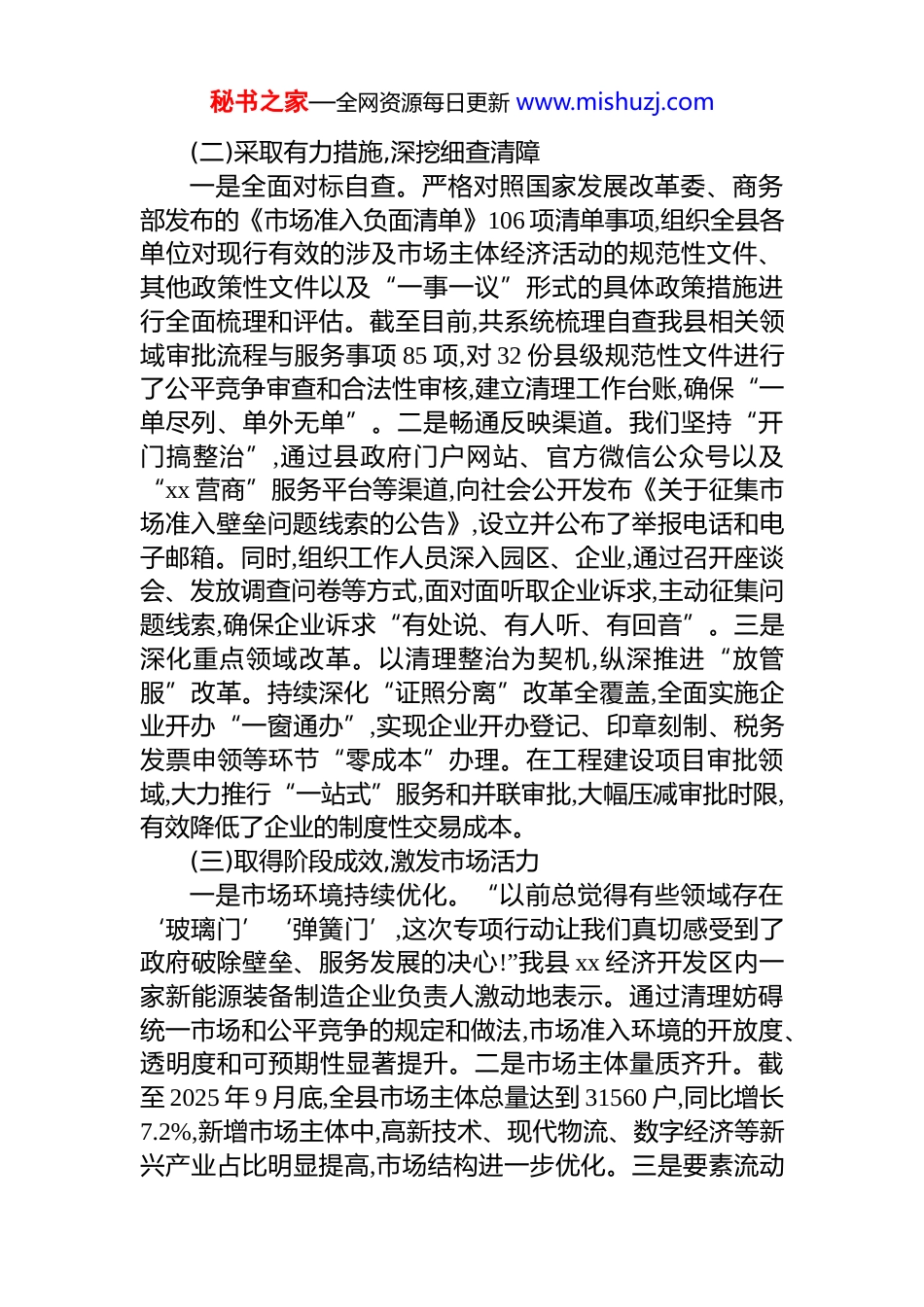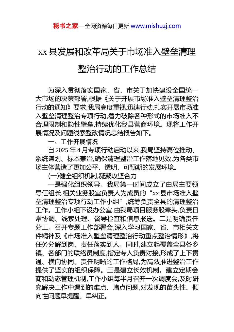 秘书之家—全网资源每日更新 www.mishuzj.comxx 县发展和改革局关于市场准入壁垒清理整治行动的工作总结为深入贯彻落实国家、省、市关于加快建设全国统一大市场的决策部署,根据《关于开展市场准入壁垒清理整治行动的通知》要求,我局高度重视,迅速行动,扎实开展市场准入壁垒清理整治专项行动,着力破除各种形式的市场准入不合理限制和隐性壁垒,持续优化我县营商环境。现将工作开展情况及问题线索整改情况总结报告如下。一、工作开展情况自 2025 年 4 月专项行动启动以来,我局坚持高位推动、系统谋划、标本兼治,确保清理整治工作落地见效,为各类市场主体营造了更加公平、透明、可预期的发展环境。(一)健全组织机制,凝聚攻坚合力一是强化组织领导。我局第一时间成立了由局主要领导任组长,相关业务股室负责人为成员的“xx 县市场准入壁垒清理整治专项行动工作小组”,统筹负责全县的清理整治工作。工作小组下设办公室,由我局项目服务股牵头,负责日常协调、线索处理、督导检查和信息报送。二是明确责任分工。召开专题工作部署会,深入学习国家、省、市相关文件精神及《市场准入壁垒清理整治行动重点整治情形》,将任务分解到岗、责任落实到人。同时,建立起覆盖全县各乡镇、各部门的联络员制度,指定专人负责对接,形成了上下贯通、横向协同、责任明晰的工作格局,为高效推进整治工作提供了坚实的组织保障。三是建立长效机制。建立定期会商和动态管理机制,工作小组每半月召开一次调度会,及时研究解决工作中遇到的难点、堵点问题,对发现的苗头性、倾向性问题早提醒、早纠正。秘书之家—全网资源每日更新 www.mishuzj.com(二)采取有力措施,深挖细查清障一是全面对标自查。严格对照国家发展改革委、商务部发布的《市场准入负面清单》106 项清单事项,组织全县各单位对现行有效的涉及市场主体经济活动的规范性文件、其他政策性文件以及“一事一议”形式的具体政策措施进行全面梳理和评估。截至目前,共系统梳理自查我县相关领域审批流程与服务事项 85 项,对 32 份县级规范性文件进行了公平竞争审查和合法性审核,建立清理工作台账,确保“一单尽列、单外无单”。二是畅通反映渠道。我们坚持“开门搞整治”,通过县政府门户网站、官方微信公众号以及“xx 营商”服务平台等渠道,向社会公开发布《关于征集市场准入壁垒问题线索的公告》,设立并公布了举报电话和电子邮箱。同时,组织工作人员深入园区、企业,通过召开座谈会、发放调查问卷等方式,面对面听取企业诉求,主动征集问题线索,确保企业诉求“有处说、有人听、有回音”。三是深化重点领域改革。以清理整治为契机,纵深推进“放管服”改革。持续深化“证照分离”改革全覆盖,全面实施企业开办“一窗通办”,实现企业开办登记、印章刻制、税务发票申领等环节“零成本”办理。在工程建设项目审批领域,大力推行“一站式”服务和并联审批,大幅压减审批时限,有效降低了企业的制度性交易成本。(三)取得阶段成效,激发市场活力一是市场环境持续优化。“以前总觉得有些领域存在‘玻璃门’‘弹簧门’,这次专项行动让我们真切感受到了政府破除壁垒、服务发展的决心!”我县 xx 经济开发区内一家新能源装备制造企业负责人激动地表示。通过清理妨碍统一市场和公平竞争的规定和做法,市场准入环境的开放度、透明度和可预期性显著提升。二是市场主体量质齐升。截至 2025 年 9 月底,全县市场主体总量达到 31560 户,同比增长7.2%,新增市场主体中,高新技术、现代物流、数字经济等新兴产业占比明显提高,市场结构进一步优化。三是要素流动秘书之家—全网资源每日更新 www.mishuzj.com更趋顺畅。在工程建设招投标领域,通过规范管理和严格监管,全面保障了不同所有制和地区的企业平等参与竞争的权利。2025 年上半年,我县完成公共资源交易项目 152 项,交易总金额达 8.6 亿元,通过公平竞争节约资金约 0.65 亿元,节约率达 7.5%。(四)直面突出问题,提出改进建议在取得成效的同时,我们也清醒地认识到工作中存在一些突出问题。一是隐性壁垒发现难。部分壁垒以“行业惯例”、技术标准、地方保护等隐蔽形式存在,发现和甄别的难度较大。二是协同整治待加强。一些...