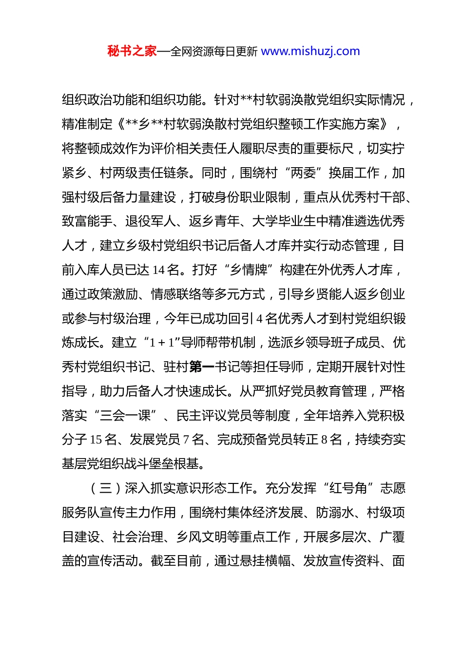 秘书之家—全网资源每日更新 www.mishuzj.com乡 2025 年工作总结及 2026 年工作计划 2025 年是全面贯彻落实党的二十大及二十届二中、三中、四中全会精神,纵深推进乡村振兴战略的关键之年,更是我乡锚定新目标、实现工作承前启后、锐意进取的重要节点。在区委、区政府的坚强领导和上级业务部门的精准指导下,全乡始终紧扣全区发展大局,立足乡域资源禀赋与发展实际,统筹发力推进乡村振兴、民生保障、社会治理等重点工作,实现经济社会发展稳中有进、质效双升,各项工作取得显著成效。一、一年来,我们加强党的建设,强化党建引领赋能(一)不断深化思想理论武装。严格执行“第一议题”学习制度,持续深学细悟习近平新时代中国特色社会主义思想,以及党的二十大和二十届二中、三中、四中全会精神,切实筑牢党员干部思想根基。深入贯彻中央八项规定精神学习教育,第一时间将《习近平关于加强党的作风建设论述摘编》等纳入重点学习范畴,制定系统化学习计划,推动学习往深里走、往实里落。精心组织全乡党员干部参与中央八项规定精神应知应会知识测试,以考促学、以学促行,为作风建设注入强劲动力。(二)持续强化基层党组织建设。严格压实基层党建工作责任制,全力推进基层党组织规范化标准化建设,不断提升党秘书之家—全网资源每日更新 www.mishuzj.com组织政治功能和组织功能。针对**村软弱涣散党组织实际情况,精准制定《**乡**村软弱涣散村党组织整顿工作实施方案》,将整顿成效作为评价相关责任人履职尽责的重要标尺,切实拧紧乡、村两级责任链条。同时,围绕村“两委”换届工作,加强村级后备力量建设,打破身份职业限制,重点从优秀村干部、致富能手、退役军人、返乡青年、大学毕业生中精准遴选优秀人才,建立乡级村党组织书记后备人才库并实行动态管理,目前入库人员已达 14 名。打好“乡情牌”构建在外优秀人才库,通过政策激励、情感联络等多元方式,引导乡贤能人返乡创业或参与村级治理,今年已成功回引 4 名优秀人才到村党组织锻炼成长。建立“1+1”导师帮带机制,选派乡领导班子成员、优秀村党组织书记、驻村第一书记等担任导师,定期开展针对性指导,助力后备人才快速成长。从严抓好党员教育管理,严格落实“三会一课”、民主评议党员等制度,全年培养入党积极分子 15 名、发展党员 7 名、完成预备党员转正 8 名,持续夯实基层党组织战斗堡垒根基。(三)深入抓实意识形态工作。充分发挥“红号角”志愿服务队宣传主力作用,围绕村集体经济发展、防溺水、村级项目建设、社会治理、乡风文明等重点工作,开展多层次、广覆盖的宣传活动。截至目前,通过悬挂横幅、发放宣传资料、面秘书之家—全网资源每日更新 www.mishuzj.com对面政策宣讲等方式开展集中宣传 20 余次,组织各类志愿服务活动 30 余场,推动政策理论真正深入人心。主动加强与区融媒体中心的对接联动,鼓励机关干部敢投稿、多投稿、投好稿,着力打造一支思想过硬、作风优良、素质全面、理论扎实、业务精湛的宣传队伍。截至目前,**乡各项工作成果已在中央及省市区各级主流媒体上稿 50 余篇,宣传影响力持续提升。扎实做好网络舆情管控工作,对抖音、今日头条等重点平台的网络信息开展实时巡查,一旦发现苗头性、倾向性问题,立即介入处置并及时向上级网信部门反馈,确保网络舆情零事故。牢牢守住统一战线意识形态阵地,加强宗教活动场所(民间信仰场所)规范化管理,常态化开展安全检查,精准排查整治安全隐患,严格规范宗教活动秩序;截至目前,共开展安全检查 9 次,整改安全隐患 1 处,切实保障民族宗教领域和谐稳定。(四)有力提升党管武装质量。始终将武装工作纳入党委重要议事日程,多次召开专题会议研究解决武装工作中的重点难点问题,精准部署征兵、拥军优属等关键工作,全程跟踪督促各项任务落地见效。累计动员 35 人报名参军,其中双合格 6人、大学毕业生参军入伍 5 人,圆满完成年度征兵任务。深入推进民兵整组工作,今年以来全乡共组建普通民兵 840 人、基干民兵 30 人,开展民兵思想教育 13 次、拉练点验 4 次,召开秘书之家—全网资源每日更新 ...