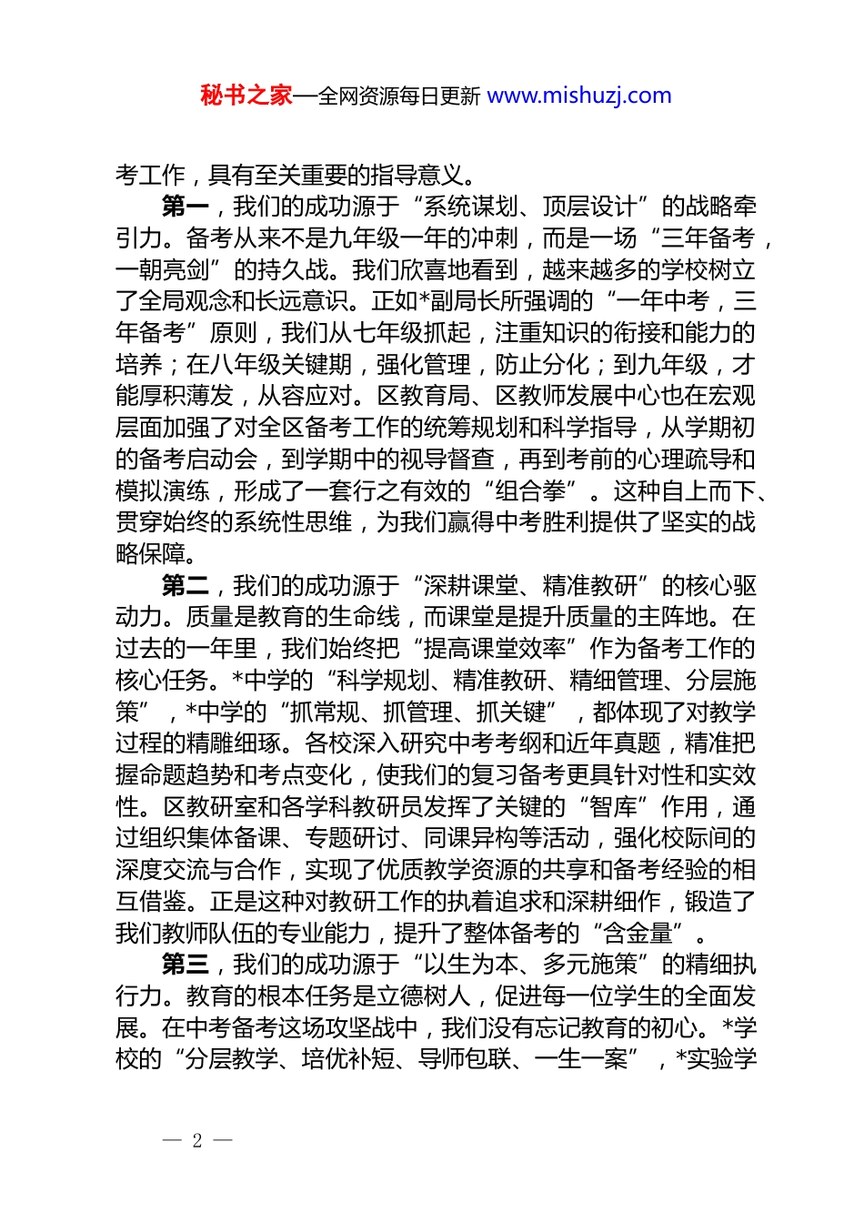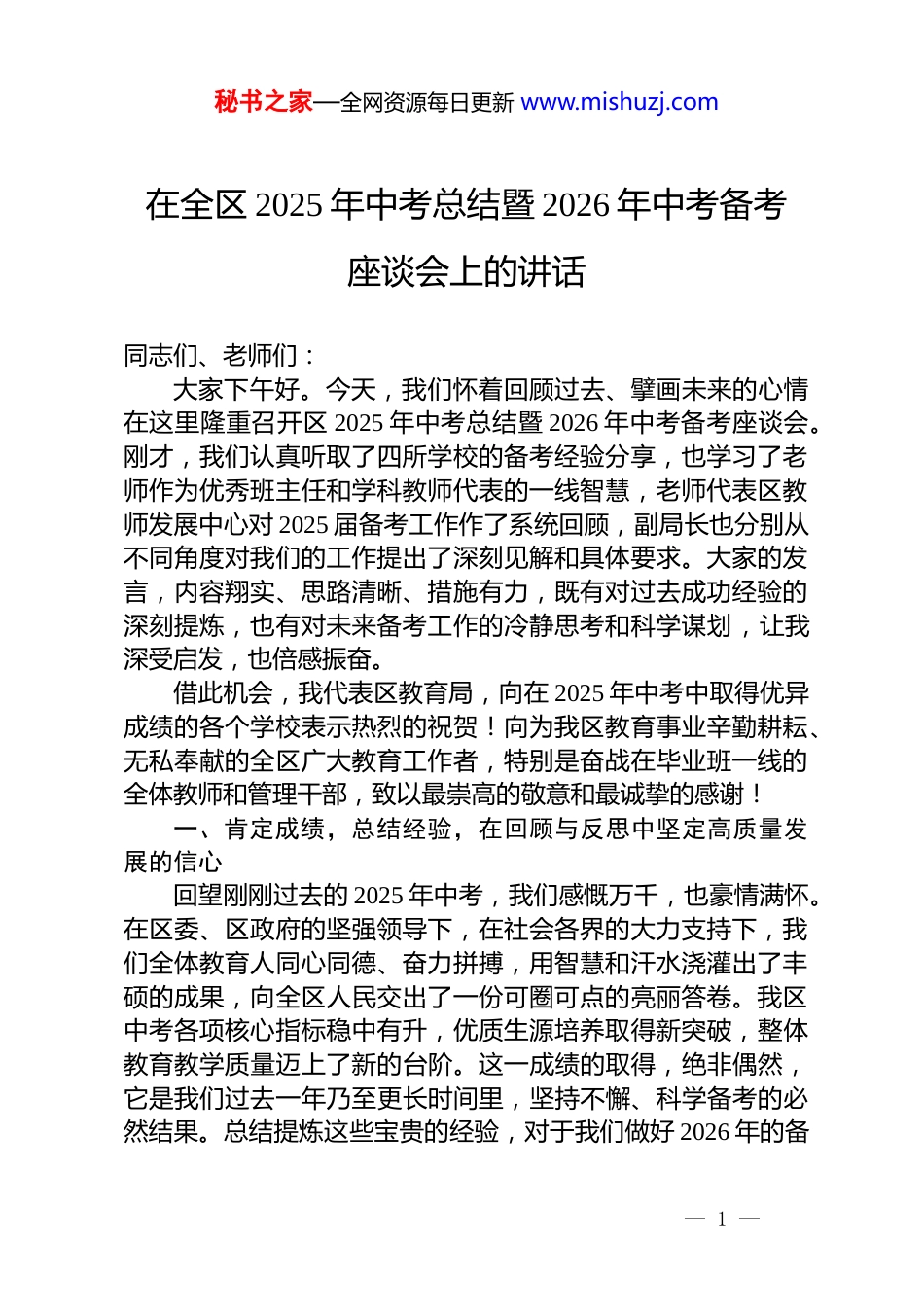 秘书之家—全网资源每日更新 www.mishuzj.com在全区 2025 年中考总结暨 2026 年中考备考座谈会上的讲话同志们、老师们:大家下午好。今天,我们怀着回顾过去、擘画未来的心情在这里隆重召开区 2025 年中考总结暨 2026 年中考备考座谈会。刚才,我们认真听取了四所学校的备考经验分享,也学习了老师作为优秀班主任和学科教师代表的一线智慧,老师代表区教师发展中心对 2025 届备考工作作了系统回顾,副局长也分别从不同角度对我们的工作提出了深刻见解和具体要求。大家的发言,内容翔实、思路清晰、措施有力,既有对过去成功经验的深刻提炼,也有对未来备考工作的冷静思考和科学谋划,让我深受启发,也倍感振奋。借此机会,我代表区教育局,向在 2025 年中考中取得优异成绩的各个学校表示热烈的祝贺!向为我区教育事业辛勤耕耘、无私奉献的全区广大教育工作者,特别是奋战在毕业班一线的全体教师和管理干部,致以最崇高的敬意和最诚挚的感谢!一、肯定成绩,总结经验,在回顾与反思中坚定高质量发展的信心回望刚刚过去的 2025 年中考,我们感慨万千,也豪情满怀。在区委、区政府的坚强领导下,在社会各界的大力支持下,我们全体教育人同心同德、奋力拼搏,用智慧和汗水浇灌出了丰硕的成果,向全区人民交出了一份可圈可点的亮丽答卷。我区中考各项核心指标稳中有升,优质生源培养取得新突破,整体教育教学质量迈上了新的台阶。这一成绩的取得,绝非偶然,它是我们过去一年乃至更长时间里,坚持不懈、科学备考的必然结果。总结提炼这些宝贵的经验,对于我们做好 2026 年的备— 1 —秘书之家—全网资源每日更新 www.mishuzj.com考工作,具有至关重要的指导意义。第一,我们的成功源于“系统谋划、顶层设计”的战略牵引力。备考从来不是九年级一年的冲刺,而是一场“三年备考,一朝亮剑”的持久战。我们欣喜地看到,越来越多的学校树立了全局观念和长远意识。正如*副局长所强调的“一年中考,三年备考”原则,我们从七年级抓起,注重知识的衔接和能力的培养;在八年级关键期,强化管理,防止分化;到九年级,才能厚积薄发,从容应对。区教育局、区教师发展中心也在宏观层面加强了对全区备考工作的统筹规划和科学指导,从学期初的备考启动会,到学期中的视导督查,再到考前的心理疏导和模拟演练,形成了一套行之有效的“组合拳”。这种自上而下、贯穿始终的系统性思维,为我们赢得中考胜利提供了坚实的战略保障。第二,我们的成功源于“深耕课堂、精准教研”的核心驱动力。质量是教育的生命线,而课堂是提升质量的主阵地。在过去的一年里,我们始终把“提高课堂效率”作为备考工作的核心任务。*中学的“科学规划、精准教研、精细管理、分层施策”,*中学的“抓常规、抓管理、抓关键”,都体现了对教学过程的精雕细琢。各校深入研究中考考纲和近年真题,精准把握命题趋势和考点变化,使我们的复习备考更具针对性和实效性。区教研室和各学科教研员发挥了关键的“智库”作用,通过组织集体备课、专题研讨、同课异构等活动,强化校际间的深度交流与合作,实现了优质教学资源的共享和备考经验的相互借鉴。正是这种对教研工作的执着追求和深耕细作,锻造了我们教师队伍的专业能力,提升了整体备考的“含金量”。第三,我们的成功源于“以生为本、多元施策”的精细执行力。教育的根本任务是立德树人,促进每一位学生的全面发展。在中考备考这场攻坚战中,我们没有忘记教育的初心。*学校的“分层教学、培优补短、导师包联、一生一案”,*实验学— 2 —秘书之家—全网资源每日更新 www.mishuzj.com校的“筑牢心理防线、实现个性赋能”,都生动诠释了“以生为本”的教育理念。我们关注每一个学生,不仅关注他们的学业成绩,更关心他们的心理状态和成长需求。通过建立学困生帮扶机制,我们不让一个孩子掉队;通过个性化的辅导方案,我们助力优秀学生突破瓶颈、追求卓越;通过细致入微的心理关怀,我们帮助学生以阳光、自信的心态迎接挑战。*老师分享的“以爱为舟,以智致远”的班级管理策略,正是这种人文关怀的生动写照。这种对学生个体差异的尊重和精细化的管理,让我们的...