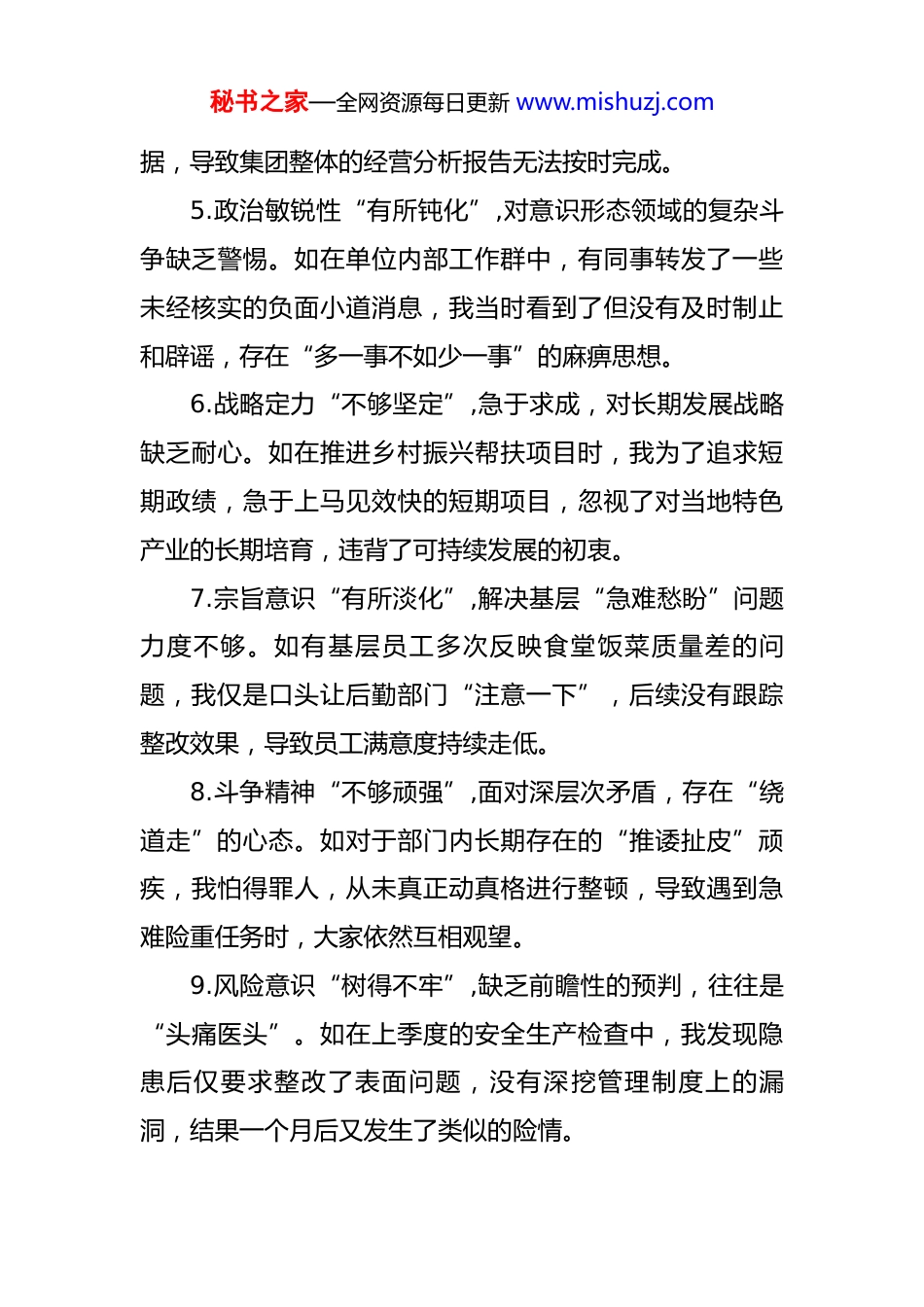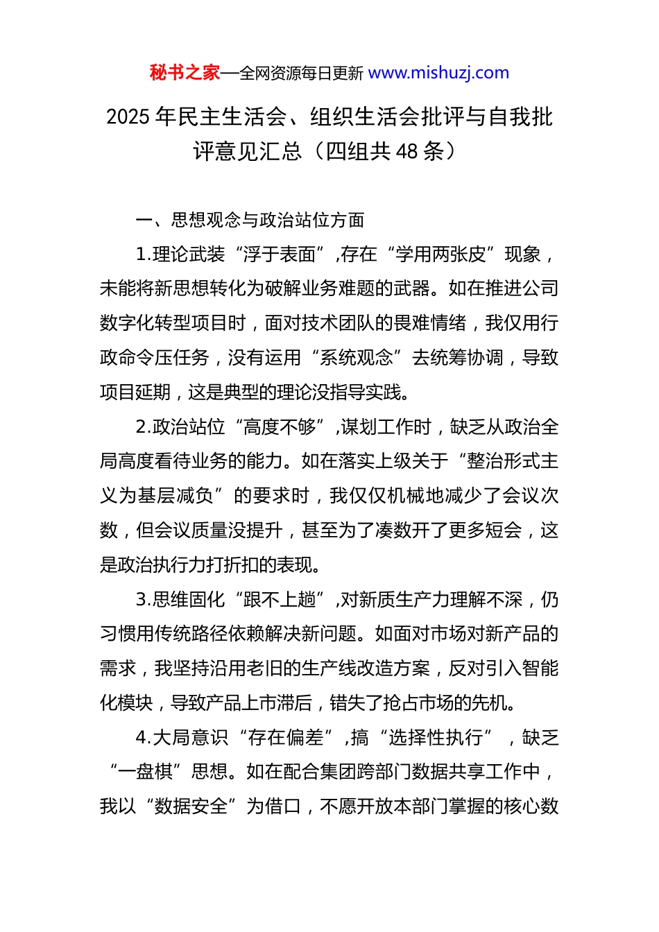 秘书之家—全网资源每日更新 www.mishuzj.com2025 年民主生活会、组织生活会批评与自我批评意见汇总(四组共 48 条)一、思想观念与政治站位方面1.理论武装“浮于表面”,存在“学用两张皮”现象,未能将新思想转化为破解业务难题的武器。如在推进公司数字化转型项目时,面对技术团队的畏难情绪,我仅用行政命令压任务,没有运用“系统观念”去统筹协调,导致项目延期,这是典型的理论没指导实践。2.政治站位“高度不够”,谋划工作时,缺乏从政治全局高度看待业务的能力。如在落实上级关于“整治形式主义为基层减负”的要求时,我仅仅机械地减少了会议次数,但会议质量没提升,甚至为了凑数开了更多短会,这是政治执行力打折扣的表现。3.思维固化“跟不上趟”,对新质生产力理解不深,仍习惯用传统路径依赖解决新问题。如面对市场对新产品的需求,我坚持沿用老旧的生产线改造方案,反对引入智能化模块,导致产品上市滞后,错失了抢占市场的先机。4.大局意识“存在偏差”,搞“选择性执行”,缺乏“一盘棋”思想。如在配合集团跨部门数据共享工作中,我以“数据安全”为借口,不愿开放本部门掌握的核心数秘书之家—全网资源每日更新 www.mishuzj.com据,导致集团整体的经营分析报告无法按时完成。5.政治敏锐性“有所钝化”,对意识形态领域的复杂斗争缺乏警惕。如在单位内部工作群中,有同事转发了一些未经核实的负面小道消息,我当时看到了但没有及时制止和辟谣,存在“多一事不如少一事”的麻痹思想。6.战略定力“不够坚定”,急于求成,对长期发展战略缺乏耐心。如在推进乡村振兴帮扶项目时,我为了追求短期政绩,急于上马见效快的短期项目,忽视了对当地特色产业的长期培育,违背了可持续发展的初衷。7.宗旨意识“有所淡化”,解决基层“急难愁盼”问题力度不够。如有基层员工多次反映食堂饭菜质量差的问题,我仅是口头让后勤部门“注意一下”,后续没有跟踪整改效果,导致员工满意度持续走低。8.斗争精神“不够顽强”,面对深层次矛盾,存在“绕道走”的心态。如对于部门内长期存在的“推诿扯皮”顽疾,我怕得罪人,从未真正动真格进行整顿,导致遇到急难险重任务时,大家依然互相观望。9.风险意识“树得不牢”,缺乏前瞻性的预判,往往是“头痛医头”。如在上季度的安全生产检查中,我发现隐患后仅要求整改了表面问题,没有深挖管理制度上的漏洞,结果一个月后又发生了类似的险情。秘书之家—全网资源每日更新 www.mishuzj.com10.政绩观“存在错位”,过于追求显绩,对打基础的潜绩重视不够。如为了在年终考核中出彩,我把大部分资源都投向了容易出数据的营销活动,却压缩了研发投入,导致核心技术迭代缓慢,透支了未来发展潜力。11.贯彻新发展理念“不彻底”,对绿色发展的理解不深、落实不细。如在审批某项工程改造方案时,为了节省初期成本,我默许采用了能耗较高的设备,没有严格把关环保指标,与“双碳”目标要求背道而驰。12.政治执行力“层层递减”,缺乏一抓到底的狠劲,存在打折扣现象。如上级要求精简文件,但我下发的通知依然篇幅冗长、套话连篇,不仅增加了基层的阅读负担,还导致重点不突出,这是典型的“中梗阻”现象。二、担当作为与工作作风方面13.担当精神“严重缺失”,遇到矛盾就上交,不敢拍板负责。如在处理客户投诉的棘手问题时,明明自己有权决断,我却以“需要请示领导”为由拖延,导致小事拖大,最终引发了舆情危机。14.工作落实“虎头蛇尾”,以会议落实会议,缺乏跟踪问效。如年初召开了誓师大会,口号喊得震天响,但年中没有进行有效的进度督导,导致年底有 3 项重点 KPI 指标未能完成,工作成了“烂尾楼”。秘书之家—全网资源每日更新 www.mishuzj.com15.创新意识“极度匮乏”,工作中墨守成规,满足于“吃老本”。如面对今年市场下滑,我依然沿用去年的促销手段,拒绝尝试直播带货等新渠道,导致市场份额被竞争对手蚕食。16.形式主义“依然存在”,调研走马观花,只看“门面”。如下基层调研时,我只去了准备充分的标杆网点,对偏远地区的问题网点避而不谈,回来后写的报告全是亮点,掩盖了真实的经营困境。17.官僚主义“时有显现”,对基层问题回...