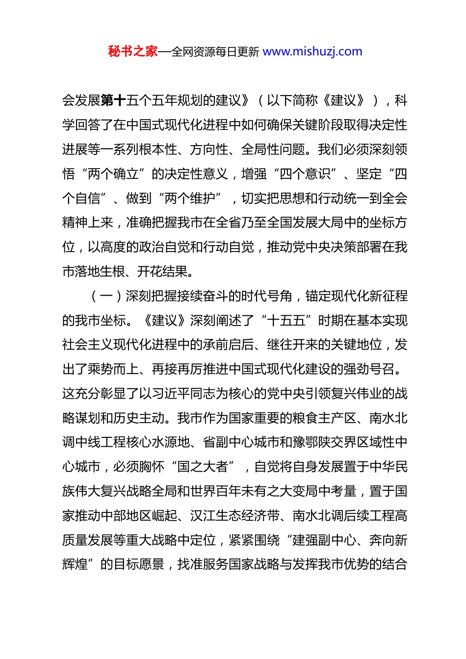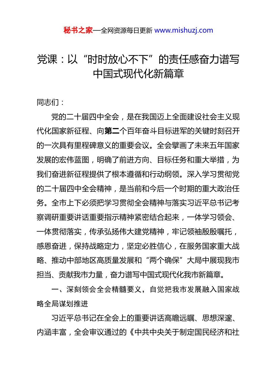 秘书之家—全网资源每日更新 www.mishuzj.com党课:以“时时放心不下”的责任感奋力谱写中国式现代化新篇章 同志们:党的二十届四中全会,是在我国迈上全面建设社会主义现代化国家新征程、向第二个百年奋斗目标进军的关键时刻召开的一次具有里程碑意义的重要会议。全会擘画了未来五年国家发展的宏伟蓝图,明确了前进方向、目标任务和重大举措,为我们奋进新征程提供了根本遵循和行动纲领。深入学习贯彻党的二十届四中全会精神,是当前和今后一个时期的重大政治任务。全市上下必须把学习贯彻全会精神与落实习近平总书记考察调研重要讲话重要指示精神紧密结合起来,一体学习领会、一体贯彻落实,传承弘扬伟大建党精神,牢记领袖殷殷嘱托,感恩奋进,保持战略定力,坚定必胜信心,在服务国家重大战略、推动中部地区高质量发展和“两个确保”大局中展现我市担当、贡献我市力量,奋力谱写中国式现代化我市新篇章。一、深刻领会全会精髓要义,自觉把我市发展融入国家战略全局谋划推进习近平总书记在全会上的重要讲话高瞻远瞩、思想深邃、内涵丰富,全会审议通过的《中共中央关于制定国民经济和社秘书之家—全网资源每日更新 www.mishuzj.com会发展第十五个五年规划的建议》(以下简称《建议》),科学回答了在中国式现代化进程中如何确保关键阶段取得决定性进展等一系列根本性、方向性、全局性问题。我们必须深刻领悟“两个确立”的决定性意义,增强“四个意识”、坚定“四个自信”、做到“两个维护”,切实把思想和行动统一到全会精神上来,准确把握我市在全省乃至全国发展大局中的坐标方位,以高度的政治自觉和行动自觉,推动党中央决策部署在我市落地生根、开花结果。(一)深刻把握接续奋斗的时代号角,锚定现代化新征程的我市坐标。《建议》深刻阐述了“十五五”时期在基本实现社会主义现代化进程中的承前启后、继往开来的关键地位,发出了乘势而上、再接再厉推进中国式现代化建设的强劲号召。这充分彰显了以习近平同志为核心的党中央引领复兴伟业的战略谋划和历史主动。我市作为国家重要的粮食主产区、南水北调中线工程核心水源地、省副中心城市和豫鄂陕交界区域性中心城市,必须胸怀“国之大者”,自觉将自身发展置于中华民族伟大复兴战略全局和世界百年未有之大变局中考量,置于国家推动中部地区崛起、汉江生态经济带、南水北调后续工程高质量发展等重大战略中定位,紧紧围绕“建强副中心、奔向新辉煌”的目标愿景,找准服务国家战略与发挥我市优势的结合秘书之家—全网资源每日更新 www.mishuzj.com点,主动担当,勇毅前行,在强国建设、民族复兴的伟大征程中贡献我市力量。(二)深刻感悟“中国之治”的非凡伟力,凝聚感恩奋进的强大合力。全会系统总结了“十四五”时期党和国家事业取得的全方位、开创性成就和深层次、根本性变革,生动诠释了中国特色社会主义制度的显著优越性和强大生命力。回望我市这五年,我们牢记领袖嘱托,坚决贯彻落实党中央及省委决策部署,克服多重困难挑战,推动高质量发展夯基垒台、积厚成势。经济总量跃居全省前列。农业基础持续巩固,粮食产量连续多年稳定在 140 亿斤以上,稳居全省第一,工业结构加快优化,防爆装备、汽车零部件、生物医药、绿色食品等产业集群初具规模,创新动能日益增强,城市能级显著提升。改革开放纵深推进,营商环境持续优化,“放管服效”改革深化,民生福祉持续改善,“满城绿色半城水”的生态宜居城市形象日益彰显。这些成绩的取得,根本在于习近平总书记的掌舵领航和习近平新时代中国特色社会主义思想的科学指引。我们要把对领袖的忠诚爱戴转化为推动我市高质量发展的强大动力,把坚定拥护“两个确立”、坚决做到“两个维护”落实到工作的各方面全过程,坚定不移沿着习近平总书记指引的方向奋勇前进。(三)深刻认清战略机遇的叠加汇聚,坚定率先突破的信秘书之家—全网资源每日更新 www.mishuzj.com心决心。全会深刻分析了我国发展环境的战略机遇和风险挑战,强调必须增强忧患意识,坚持底线思维,做到居安思危、未雨绸缪,同时更要坚定信心,抓住一切有利时机,利用一切有利条件,看准了就抓紧干,能多干就多...