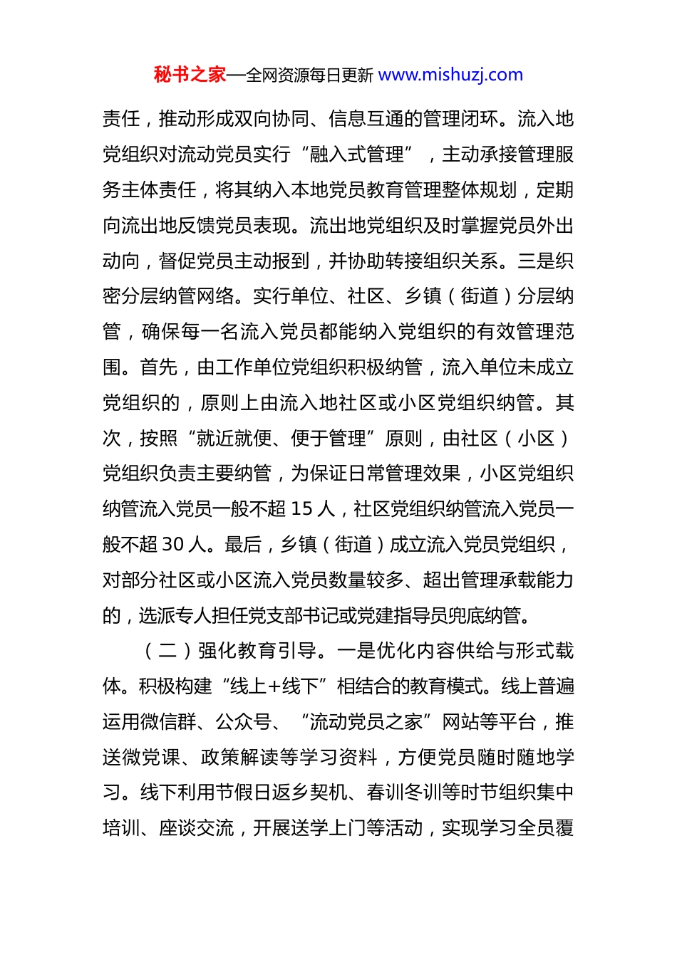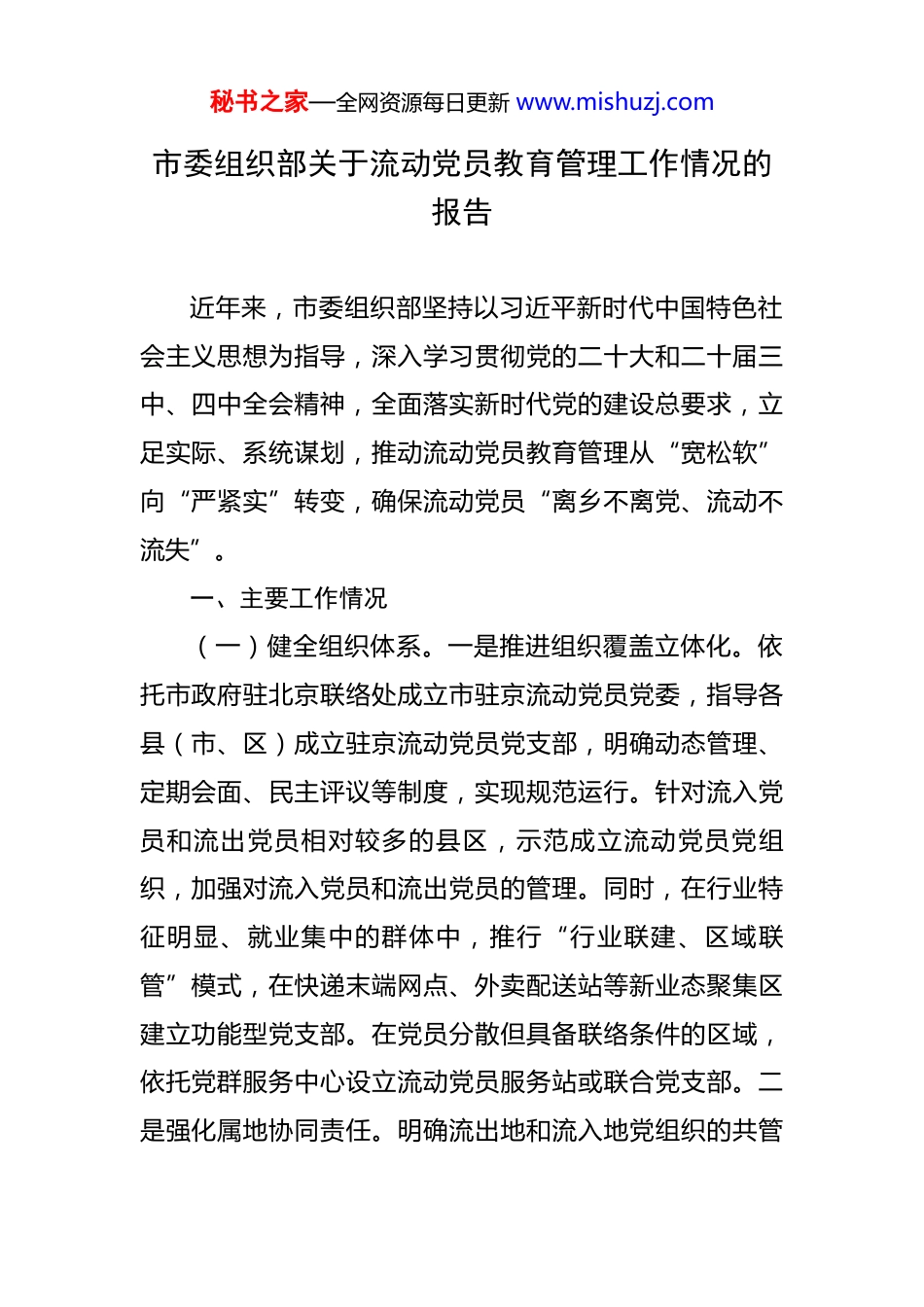 秘书之家—全网资源每日更新 www.mishuzj.com市委组织部关于流动党员教育管理工作情况的报告 近年来,市委组织部坚持以习近平新时代中国特色社会主义思想为指导,深入学习贯彻党的二十大和二十届三中、四中全会精神,全面落实新时代党的建设总要求,立足实际、系统谋划,推动流动党员教育管理从“宽松软”向“严紧实”转变,确保流动党员“离乡不离党、流动不流失”。一、主要工作情况(一)健全组织体系。一是推进组织覆盖立体化。依托市政府驻北京联络处成立市驻京流动党员党委,指导各县(市、区)成立驻京流动党员党支部,明确动态管理、定期会面、民主评议等制度,实现规范运行。针对流入党员和流出党员相对较多的县区,示范成立流动党员党组织,加强对流入党员和流出党员的管理。同时,在行业特征明显、就业集中的群体中,推行“行业联建、区域联管”模式,在快递末端网点、外卖配送站等新业态聚集区建立功能型党支部。在党员分散但具备联络条件的区域,依托党群服务中心设立流动党员服务站或联合党支部。二是强化属地协同责任。明确流出地和流入地党组织的共管秘书之家—全网资源每日更新 www.mishuzj.com责任,推动形成双向协同、信息互通的管理闭环。流入地党组织对流动党员实行“融入式管理”,主动承接管理服务主体责任,将其纳入本地党员教育管理整体规划,定期向流出地反馈党员表现。流出地党组织及时掌握党员外出动向,督促党员主动报到,并协助转接组织关系。三是织密分层纳管网络。实行单位、社区、乡镇(街道)分层纳管,确保每一名流入党员都能纳入党组织的有效管理范围。首先,由工作单位党组织积极纳管,流入单位未成立党组织的,原则上由流入地社区或小区党组织纳管。其次,按照“就近就便、便于管理”原则,由社区(小区)党组织负责主要纳管,为保证日常管理效果,小区党组织纳管流入党员一般不超 15 人,社区党组织纳管流入党员一般不超 30 人。最后,乡镇(街道)成立流入党员党组织,对部分社区或小区流入党员数量较多、超出管理承载能力的,选派专人担任党支部书记或党建指导员兜底纳管。(二)强化教育引导。一是优化内容供给与形式载体。积极构建“线上+线下”相结合的教育模式。线上普遍运用微信群、公众号、“流动党员之家”网站等平台,推送微党课、政策解读等学习资料,方便党员随时随地学习。线下利用节假日返乡契机、春训冬训等时节组织集中培训、座谈交流,开展送学上门等活动,实现学习全员覆秘书之家—全网资源每日更新 www.mishuzj.com盖。二是落实流入地教育主责。《市党员集中培训工作规范》明确规定,流动党员培训由流入地党组织负责,流出地党组织抓好节假日返乡培训。各区县通过县级示范、乡街统筹、村社兜底,每年对流入党员进行一次全覆盖培训,聚焦党章要求、流动党员责任、党费收缴使用规定等内容,增强流入党员党性观念。部分区县通过开展“新流入党员必修课”、组织“送教入企”等活动,建立学习档案,有效提升了教育管理的规范性和持续性。三是发挥流出地源头引导作用。强化流出地党组织源头管理职责,在党员外出前开展行前教育,明确组织纪律和汇报要求,建立稳定的联络机制,及时掌握党员流动期间的思想动态和现实表现。市为各县(市、区)流出党员配备县、乡、村三级联络员,加强与流出党员的常态化联系。村社联络员负责常态对接,每季度至少联络一次,及时传达党支部要求,协助解决探望家属、出具证明等事项;乡镇(街道)联络员负责统筹协调,对接联系流入地党组织,协助流出党员向流入地党组织报到,接受流入地纳管;县级联络员负责政策支撑,督促指导乡村两级加强与流出党员联络,为流出党员提供政策咨询服务。(三)规范管理服务。一是健全动态信息管理机制。依托全国党员管理信息系统,实现党员信息实时更新、组秘书之家—全网资源每日更新 www.mishuzj.com织关系无缝衔接,夯实管理数据基础。杏花岭区构建“网格员入户核实+党员系统追踪+扫码报到”筛查机制,动态更新党员信息库,针对骑手、网约车司机等群体分类建立管理台账,做到流动党员个人信息、流出(入)时间、流动去向(来源)、联系方式、居住地...