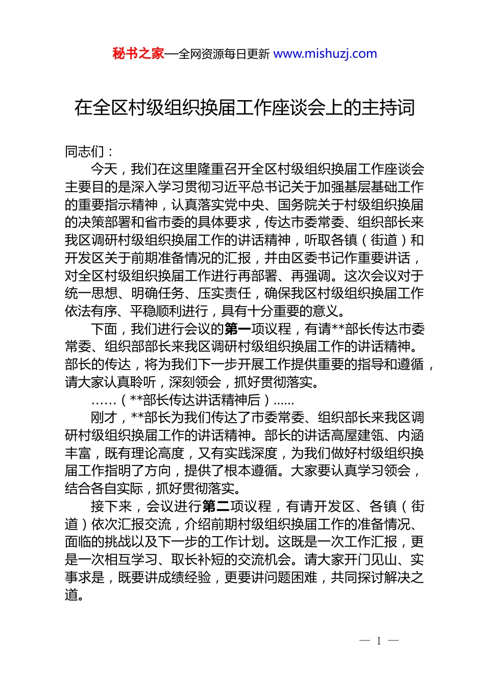 秘书之家—全网资源每日更新 www.mishuzj.com在全区村级组织换届工作座谈会上的主持词同志们:今天,我们在这里隆重召开全区村级组织换届工作座谈会主要目的是深入学习贯彻习近平总书记关于加强基层基础工作的重要指示精神,认真落实党中央、国务院关于村级组织换届的决策部署和省市委的具体要求,传达市委常委、组织部长来我区调研村级组织换届工作的讲话精神,听取各镇(街道)和开发区关于前期准备情况的汇报,并由区委书记作重要讲话,对全区村级组织换届工作进行再部署、再强调。这次会议对于统一思想、明确任务、压实责任,确保我区村级组织换届工作依法有序、平稳顺利进行,具有十分重要的意义。下面,我们进行会议的第一项议程,有请**部长传达市委常委、组织部部长来我区调研村级组织换届工作的讲话精神。部长的传达,将为我们下一步开展工作提供重要的指导和遵循,请大家认真聆听,深刻领会,抓好贯彻落实。……(**部长传达讲话精神后)……刚才,**部长为我们传达了市委常委、组织部长来我区调研村级组织换届工作的讲话精神。部长的讲话高屋建瓴、内涵丰富,既有理论高度,又有实践深度,为我们做好村级组织换届工作指明了方向,提供了根本遵循。大家要认真学习领会,结合各自实际,抓好贯彻落实。接下来,会议进行第二项议程,有请开发区、各镇(街道)依次汇报交流,介绍前期村级组织换届工作的准备情况、面临的挑战以及下一步的工作计划。这既是一次工作汇报,更是一次相互学习、取长补短的交流机会。请大家开门见山、实事求是,既要讲成绩经验,更要讲问题困难,共同探讨解决之道。— 1 —秘书之家—全网资源每日更新 www.mishuzj.com首先,请开发区进行汇报。……(开发区汇报后)……感谢开发区的汇报,经验很宝贵,思考也很深入。下面,请**镇进行汇报。……(各镇(街道)汇报交流后)……感谢开发区和各镇(街道)的汇报交流。大家准备充分,汇报具体,既讲了做法,也谈了认识,特别是对存在的问题和困难,都作了深入分析和思考,提出了有针对性的工作措施。通过听取大家的汇报,我们对全区村级组织换届工作的整体进展、主要特点和面临的突出问题有了更清晰地认识,也为我们下一步精准施策提供了重要依据。下面,会议进行第三项议程,有请区委书记作重要讲话。的讲话,将站在全区高质量发展的大局,对村级组织换届工作提出明确要求,作出全面部署,是指导我们做好此次换届工作的纲领性文件。请大家以高度负责的态度,认真学习领会,并将讲话精神不折不扣地贯彻到各项工作中去。有请区委书记作重要讲话!……(区委书记作重要讲话后)……同志们:刚才,区委书记做了非常重要的讲话。讲话总揽全局、立意深远、思想深刻,既从战略和全局的高度,深刻阐述了做好村级组织换届工作的重大意义,又就如何高质量、高标准完成此次换届任务,从强化政治担当、严格依法依规、选优配强班子、防范化解风险、严肃换届纪律等方面提出了明确要求和具体部署。的讲话,是指导我区做好村级组织换届工作的根本遵循和行动指南,具有很强的思想性、指导性和针对性。我们一定要认真学习领会,吃透精神实质,坚决贯彻落实。今天的会议,主要有三项议程。一是传达了市委常委、组织部长来我区调研村级组织换届工作的讲话精神,为我们指明— 2 —秘书之家—全网资源每日更新 www.mishuzj.com了方向,提供了遵循;二是开发区和各镇(街道)作了汇报交流,交流了经验,指出了问题,提供了启示;三是区委书记作了重要讲话,对全区村级组织换届工作进行了全面部署和明确要求。会议内容丰富,重点突出,达到了统一思想、明确任务、压实责任的预期目的。为确保本次会议精神的全面贯彻落实,我再强调几点要求:第一,迅速传达学习,凝聚思想共识。各镇(街道)、开发区会后要立即组织专题会议,将今天的会议精神,特别是区委书记的重要讲话精神,以及市委常委、组织部长的讲话精神,原原本本、不折不扣地传达到每一位参与换届工作的干部和相关党员群众。要深入开展学习讨论,切实把思想和行动统一到区委的决策部署上来,统一到做好村级组织换届工作的各项要求上来,确保上下同心、步调一...