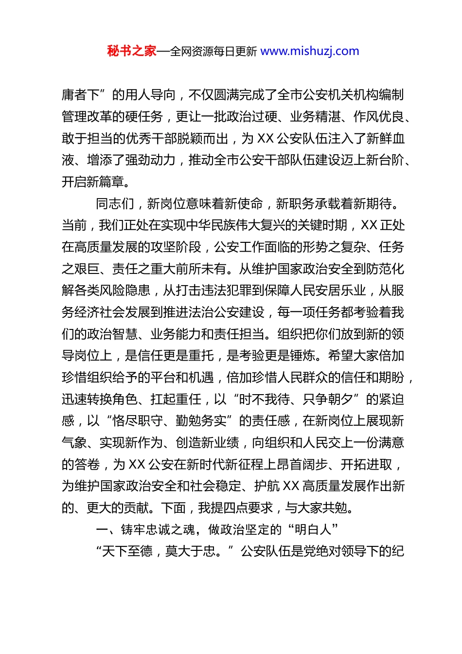 秘书之家—全网资源每日更新 www.mishuzj.com副市长、市公安局党委书记、局长在新任职干部集体谈话会上的讲话同志们:今天,我们怀着十分郑重的心情,召开全市公安机关新任职干部集体谈话会。这既是一次任前的思想动员,也是一次初心使命的再教育,更是一次履职担当的加压鼓劲。首先,我代表市公安局党委,向经过组织慎重考察、光荣走上新岗位的135 名同志,表示最热烈的祝贺!向长期以来默默支持公安工作、关心干部成长的各位同仁和家属们,致以最诚挚的问候和衷心的感谢!11 月的 XX,寒意渐浓,但我们心中涌动着干事创业的滚烫激情;公安队伍的新老交替,既是传承更是跨越,既是责任更是荣光。这次干部调整,是市公安局党委深入学习贯彻习近平新时代中国特色社会主义思想,全面落实习近平总书记关于新时代公安工作、干部队伍建设的重要讲话重要指示精神,严格按照《党政领导干部选拔任用工作条例》规定,紧扣新时代党的组织路线要求作出的重大决策。自今年以来,局党委始终坚持“四新”理念,锚定 XX 公安工作现代化总目标,以新时代好干部标准为标尺,立足 XX 区域安全稳定形势和公安工作发展实际,直面现实斗争中的风险挑战,大刀阔斧推进警务运行机制系统工程优化,鲜明树立“能者上、优者奖、平者让、秘书之家—全网资源每日更新 www.mishuzj.com庸者下”的用人导向,不仅圆满完成了全市公安机关机构编制管理改革的硬任务,更让一批政治过硬、业务精湛、作风优良、敢于担当的优秀干部脱颖而出,为 XX 公安队伍注入了新鲜血液、增添了强劲动力,推动全市公安干部队伍建设迈上新台阶、开启新篇章。同志们,新岗位意味着新使命,新职务承载着新期待。当前,我们正处在实现中华民族伟大复兴的关键时期,XX 正处在高质量发展的攻坚阶段,公安工作面临的形势之复杂、任务之艰巨、责任之重大前所未有。从维护国家政治安全到防范化解各类风险隐患,从打击违法犯罪到保障人民安居乐业,从服务经济社会发展到推进法治公安建设,每一项任务都考验着我们的政治智慧、业务能力和责任担当。组织把你们放到新的领导岗位上,是信任更是重托,是考验更是锤炼。希望大家倍加珍惜组织给予的平台和机遇,倍加珍惜人民群众的信任和期盼,迅速转换角色、扛起重任,以“时不我待、只争朝夕”的紧迫感,以“恪尽职守、勤勉务实”的责任感,在新岗位上展现新气象、实现新作为、创造新业绩,向组织和人民交上一份满意的答卷,为 XX 公安在新时代新征程上昂首阔步、开拓进取,为维护国家政治安全和社会稳定、护航 XX 高质量发展作出新的、更大的贡献。下面,我提四点要求,与大家共勉。一、铸牢忠诚之魂,做政治坚定的“明白人”“天下至德,莫大于忠。”公安队伍是党绝对领导下的纪秘书之家—全网资源每日更新 www.mishuzj.com律部队,忠诚是融入血脉的政治基因,是公安干部的第一品格、第一要求。习近平总书记反复强调,“对党忠诚,是共产党人首要的政治品质”“公安机关要牢牢把握对党忠诚这一建警之魂”。作为新任职的领导干部,我们必须把讲政治摆在首位,始终在政治立场、政治方向、政治原则、政治道路上同以习近平同志为核心的党中央保持高度一致,永葆绝对忠诚、绝对纯洁、绝对可靠的政治本色。一要把稳“政治方向盘”,坚持党的绝对领导。党的绝对领导是公安工作的根本保证,是公安机关安身立命的根本所在。我们要深刻领悟“两个确立”的决定性意义,增强“四个意识”、坚定“四个自信”、做到“两个维护”,始终把党的领导贯穿公安工作全过程、各方面。要严格执行重大事项请示报告制度,坚决服从局党委的统一领导、统一指挥、统一部署,做到令行禁止、政令畅通,绝不允许有令不行、有禁不止,绝不允许搞上有政策、下有对策,绝不允许在贯彻执行上级决策部署上打折扣、搞变通。要深刻认识公安工作的政治属性,始终坚持正确的政治方向,在大是大非面前旗帜鲜明,在风浪考验面前无所畏惧,在各种诱惑面前立场坚定,坚决同一切违背、歪曲、否定党的理论和路线方针政策的言行作斗争,坚决维护党中央权威和集中统一领导。二要筑牢“思想压舱石”,强化创新理论武装。思想是行动的...