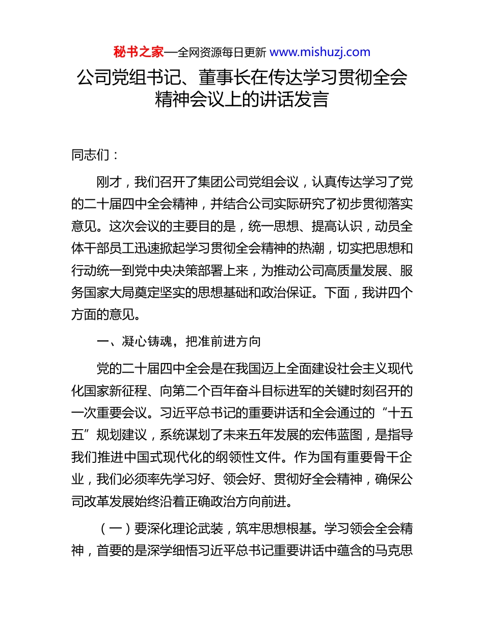 秘书之家—全网资源每日更新 www.mishuzj.com公司党组书记、董事长在传达学习贯彻全会精神会议上的讲话发言同志们:刚才,我们召开了集团公司党组会议,认真传达学习了党的二十届四中全会精神,并结合公司实际研究了初步贯彻落实意见。这次会议的主要目的是,统一思想、提高认识,动员全体干部员工迅速掀起学习贯彻全会精神的热潮,切实把思想和行动统一到党中央决策部署上来,为推动公司高质量发展、服务国家大局奠定坚实的思想基础和政治保证。下面,我讲四个方面的意见。一、凝心铸魂,把准前进方向党的二十届四中全会是在我国迈上全面建设社会主义现代化国家新征程、向第二个百年奋斗目标进军的关键时刻召开的一次重要会议。习近平总书记的重要讲话和全会通过的“十五五”规划建议,系统谋划了未来五年发展的宏伟蓝图,是指导我们推进中国式现代化的纲领性文件。作为国有重要骨干企业,我们必须率先学习好、领会好、贯彻好全会精神,确保公司改革发展始终沿着正确政治方向前进。(一)要深化理论武装,筑牢思想根基。学习领会全会精神,首要的是深学细悟习近平总书记重要讲话中蕴含的马克思秘书之家—全网资源每日更新 www.mishuzj.com主义立场、观点、方法。要组织党员干部原原本本、逐字逐句学习公报和《建议》原文,通过专题研讨、辅导报告、集中培训等多种形式,深刻把握“六个坚持”的重大原则和中国式现代化的五大特征。中国商飞公司党委在学习贯彻全会精神时,特别强调要结合实际开展学习研讨,做好宣传解读,统筹谋划集中培训,这种做法值得借鉴。我们要把学习贯彻全会精神作为当前首要政治任务,制定详细学习计划,分层次、分专题开展系统培训,确保学深悟透、融会贯通。(二)要广泛宣传宣讲,凝聚共识力量。学习贯彻全会精神不能停留在会议层面、文件层面,要推动全会精神直达基层、直通一线。领导干部要带头深入联系点、基层单位开展宣讲,创新运用新媒体平台、专题专栏、文艺宣传等群众喜闻乐见的形式,把政治话语转化为大众话语,把专业术语讲成日常道理。中国石油在学习贯彻党的二十大精神时,要求各级领导干部和党的二十大代表做好层层宣讲,推动精神直达基层、贴近群众,这一经验做法完全可以借鉴到四中全会精神的学习宣传中。我们要组织宣讲团、理论骨干深入井站、车间、班组,用通俗易懂的语言、生动鲜活的事例,把全会精神讲清楚、讲明白、讲透彻。(三)要注重学用结合,推动实践转化。学习的目的全在于运用。要把学习贯彻全会精神与落实习近平总书记视察胜利油田、九江石化重要指示精神结合起来,与完成中央巡视、环秘书之家—全网资源每日更新 www.mishuzj.com保督察等问题整改结合起来,与冲刺全年目标任务、打好“十四五”收官战结合起来。中国石化西北油田采油四厂通过增强党委领导力、支部战斗力和党员引领力的“党建三力”建设,将党建优势转化为发展优势,实现了油气产量连续两年年均增长超 70 万吨的显著成效。我们要坚持学思用贯通、知信行统一,把学习成效体现到推动高质量发展、保障国家能源安全的具体行动中。(四)要把握历史方位,增强战略自觉。“十五五”时期是基本实现社会主义现代化夯实基础、全面发力的关键时期。我们要深刻认识公司在党和国家事业全局中的坐标方位,认清能源行业变革带来的机遇挑战,增强忧患意识,保持战略定力。财政部部长蓝佛安在谈到学习贯彻四中全会精神时指出,要加快建立健全与中国式现代化相适应的财政制度,更高效能加强财政宏观调控。我们要立足“两个大局”,心怀“国之大者”,增强推动高质量发展的战略自觉和行动自觉。二、服务全局,锻造竞争优势高质量发展是新时代的硬道理,也是学习贯彻全会精神最根本的落脚点。作为国有重要骨干企业,我们要牢牢把握推动高质量发展这一主题,聚焦主责主业,加快培育新质生产力,不断增强核心功能、提升核心竞争力,在服务党和国家工作大局中展现新担当、新作为。秘书之家—全网资源每日更新 www.mishuzj.com(一)要做强主业,夯实发展根基。能源的饭碗必须端在自己手里。要坚守“为国找油、为民族争气”的初心使命,加大油气资源勘探开发和增储上产力度,...