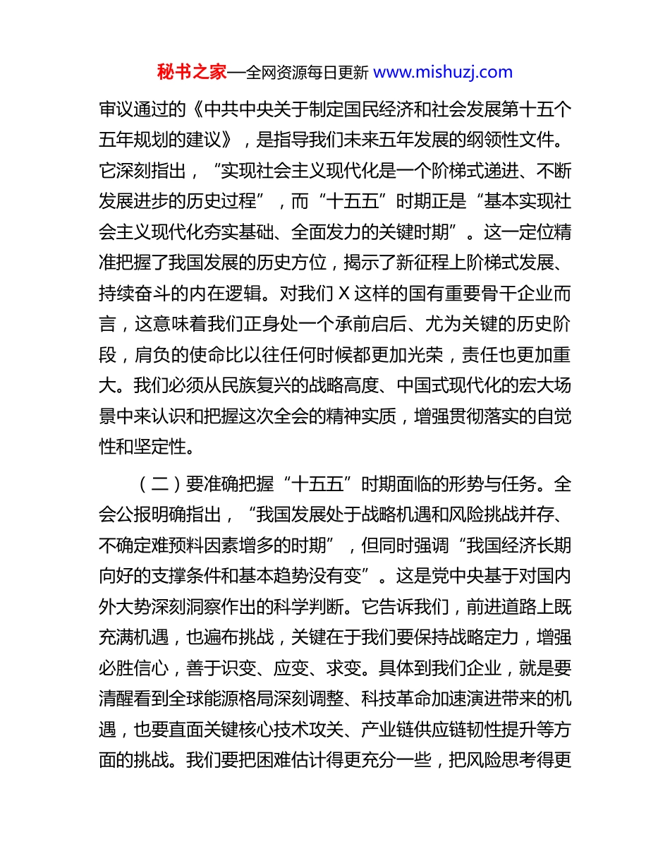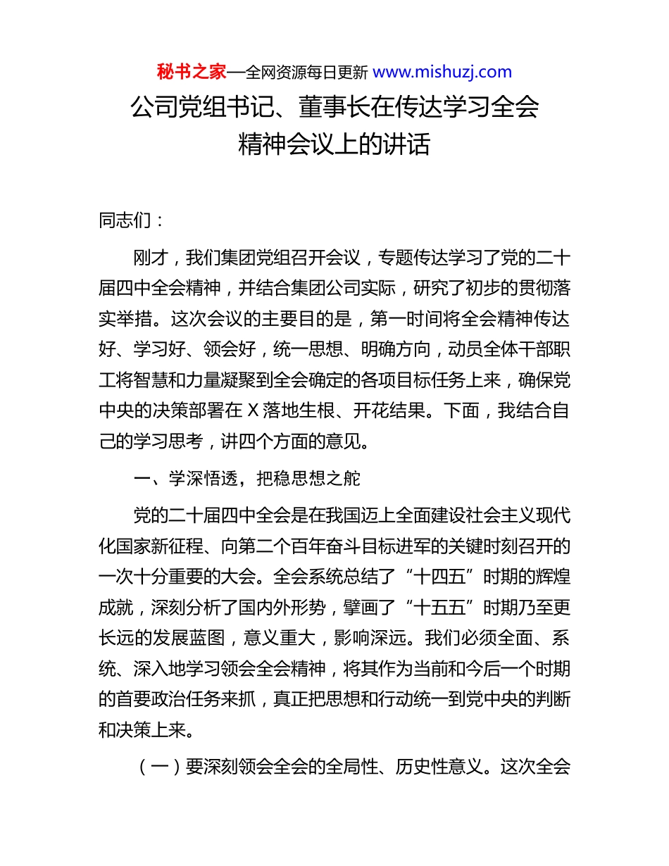 秘书之家—全网资源每日更新 www.mishuzj.com公司党组书记、董事长在传达学习全会精神会议上的讲话同志们:刚才,我们集团党组召开会议,专题传达学习了党的二十届四中全会精神,并结合集团公司实际,研究了初步的贯彻落实举措。这次会议的主要目的是,第一时间将全会精神传达好、学习好、领会好,统一思想、明确方向,动员全体干部职工将智慧和力量凝聚到全会确定的各项目标任务上来,确保党中央的决策部署在 X 落地生根、开花结果。下面,我结合自己的学习思考,讲四个方面的意见。一、学深悟透,把稳思想之舵党的二十届四中全会是在我国迈上全面建设社会主义现代化国家新征程、向第二个百年奋斗目标进军的关键时刻召开的一次十分重要的大会。全会系统总结了“十四五”时期的辉煌成就,深刻分析了国内外形势,擘画了“十五五”时期乃至更长远的发展蓝图,意义重大,影响深远。我们必须全面、系统、深入地学习领会全会精神,将其作为当前和今后一个时期的首要政治任务来抓,真正把思想和行动统一到党中央的判断和决策上来。(一)要深刻领会全会的全局性、历史性意义。这次全会秘书之家—全网资源每日更新 www.mishuzj.com审议通过的《中共中央关于制定国民经济和社会发展第十五个五年规划的建议》,是指导我们未来五年发展的纲领性文件。它深刻指出,“实现社会主义现代化是一个阶梯式递进、不断发展进步的历史过程”,而“十五五”时期正是“基本实现社会主义现代化夯实基础、全面发力的关键时期”。这一定位精准把握了我国发展的历史方位,揭示了新征程上阶梯式发展、持续奋斗的内在逻辑。对我们 X 这样的国有重要骨干企业而言,这意味着我们正身处一个承前启后、尤为关键的历史阶段,肩负的使命比以往任何时候都更加光荣,责任也更加重大。我们必须从民族复兴的战略高度、中国式现代化的宏大场景中来认识和把握这次全会的精神实质,增强贯彻落实的自觉性和坚定性。(二)要准确把握“十五五”时期面临的形势与任务。全会公报明确指出,“我国发展处于战略机遇和风险挑战并存、不确定难预料因素增多的时期”,但同时强调“我国经济长期向好的支撑条件和基本趋势没有变”。这是党中央基于对国内外大势深刻洞察作出的科学判断。它告诉我们,前进道路上既充满机遇,也遍布挑战,关键在于我们要保持战略定力,增强必胜信心,善于识变、应变、求变。具体到我们企业,就是要清醒看到全球能源格局深刻调整、科技革命加速演进带来的机遇,也要直面关键核心技术攻关、产业链供应链韧性提升等方面的挑战。我们要把困难估计得更充分一些,把风险思考得更秘书之家—全网资源每日更新 www.mishuzj.com深入一些,同时更要看到我国经济韧性强、潜力大、活力足,特别是拥有中国特色社会主义制度优势、超大规模市场优势、完整产业体系优势和丰富人才资源优势,这些为我们应对风险挑战、赢得发展主动提供了坚实基础和有利条件。(三)要系统理解中国式现代化的核心内涵与实践要求。全会围绕“以中国式现代化全面推进强国建设、民族复兴伟业”进行了全面部署。中国式现代化是涵盖经济、政治、文化、社会、生态文明等各个方面的宏大系统工程。对于我们装备制造企业,要特别聚焦全会在高质量发展、科技自立自强、现代化产业体系建设、绿色低碳转型、共同富裕等方面提出的明确要求。例如,全会将“高质量发展取得显著成效”置于“十五五”时期经济社会发展主要目标的首位,强调“必须坚持高质量发展”;提出“加快高水平科技自立自强,引领发展新质生产力”;要求“坚持把发展经济的着力点放在实体经济上”,加快建设制造强国、质量强国等;部署“加快经济社会发展全面绿色转型,建设美丽中国”;明确“加大保障和改善民生力度,扎实推进全体人民共同富裕”。这些都需要我们融会贯通,结合主责主业,找到切入点和着力点。(四)要坚决扛起“大国重器”的使命担当。X 集团作为党和国家在能源装备制造领域的“国家队”、“排头兵”,在服务国家战略中具有不可替代的作用。回顾“十四五”,我们正是在党的坚强领导下,顶住压力,迎难而上,推动“零碳”秘书之家—全网资源每日更新 www.mishuzj....