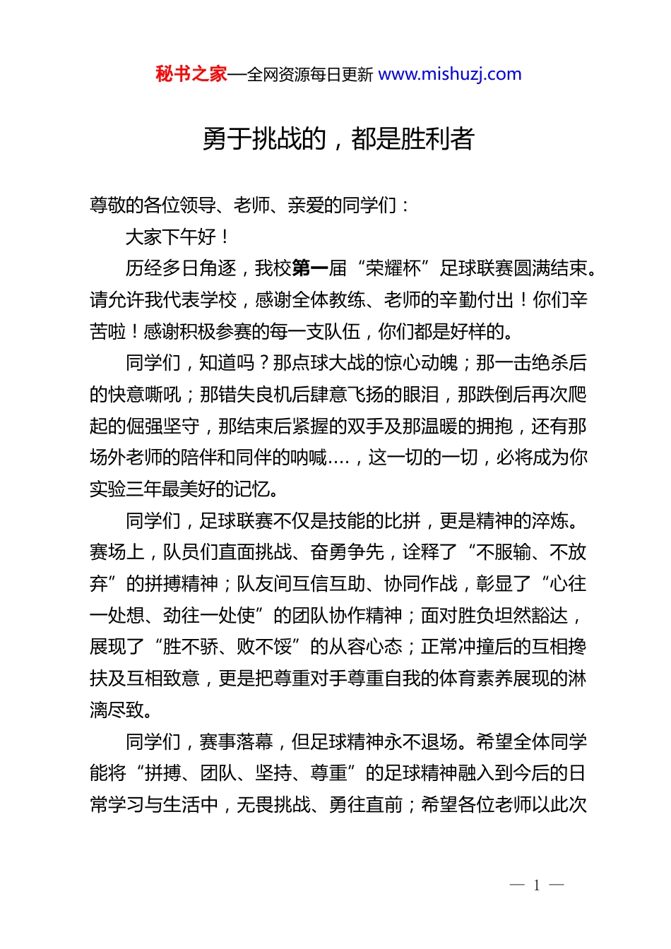 秘书之家—全网资源每日更新 www.mishuzj.com勇于挑战的,都是胜利者尊敬的各位领导、老师、亲爱的同学们:大家下午好!历经多日角逐,我校第一届“荣耀杯”足球联赛圆满结束。请允许我代表学校,感谢全体教练、老师的辛勤付出!你们辛苦啦!感谢积极参赛的每一支队伍,你们都是好样的。同学们,知道吗?那点球大战的惊心动魄;那一击绝杀后的快意嘶吼;那错失良机后肆意飞扬的眼泪,那跌倒后再次爬起的倔强坚守,那结束后紧握的双手及那温暖的拥抱,还有那场外老师的陪伴和同伴的呐喊....,这一切的一切,必将成为你实验三年最美好的记忆。同学们,足球联赛不仅是技能的比拼,更是精神的淬炼。赛场上,队员们直面挑战、奋勇争先,诠释了“不服输、不放弃”的拼搏精神;队友间互信互助、协同作战,彰显了“心往一处想、劲往一处使”的团队协作精神;面对胜负坦然豁达,展现了“胜不骄、败不馁”的从容心态;正常冲撞后的互相搀扶及互相致意,更是把尊重对手尊重自我的体育素养展现的淋漓尽致。同学们,赛事落幕,但足球精神永不退场。希望全体同学能将“拼搏、团队、坚持、尊重”的足球精神融入到今后的日常学习与生活中,无畏挑战、勇往直前;希望各位老师以此次— 1 —秘书之家—全网资源每日更新 www.mishuzj.com联赛为契机,持续重视体育教育,丰富体育教学形式,引导学生养成运动习惯,让体育成为助力学生成长的重要支撑。未来,学校将继续搭建更多体育活动平台,完善体育设施建设,推动校园体育文化蓬勃发展,让运动成为校园常态,让拼搏成为青春底色,助力每一位同学在运动中收获健康、在成长中绽放光彩。同学们,“真正的成功属于敢于大胆尝试的人”。今天,勇于挑战的你们,都是胜利者。愿我们以“荣耀杯”为起点,共筑活力校园,共赴“荣耀”未来!最后,再次祝贺实验学校本部校区第一届“荣耀杯”足球联赛圆满成功!谢谢大家!— 2 —