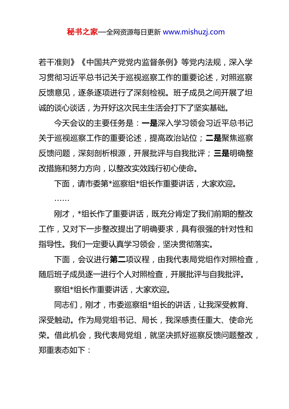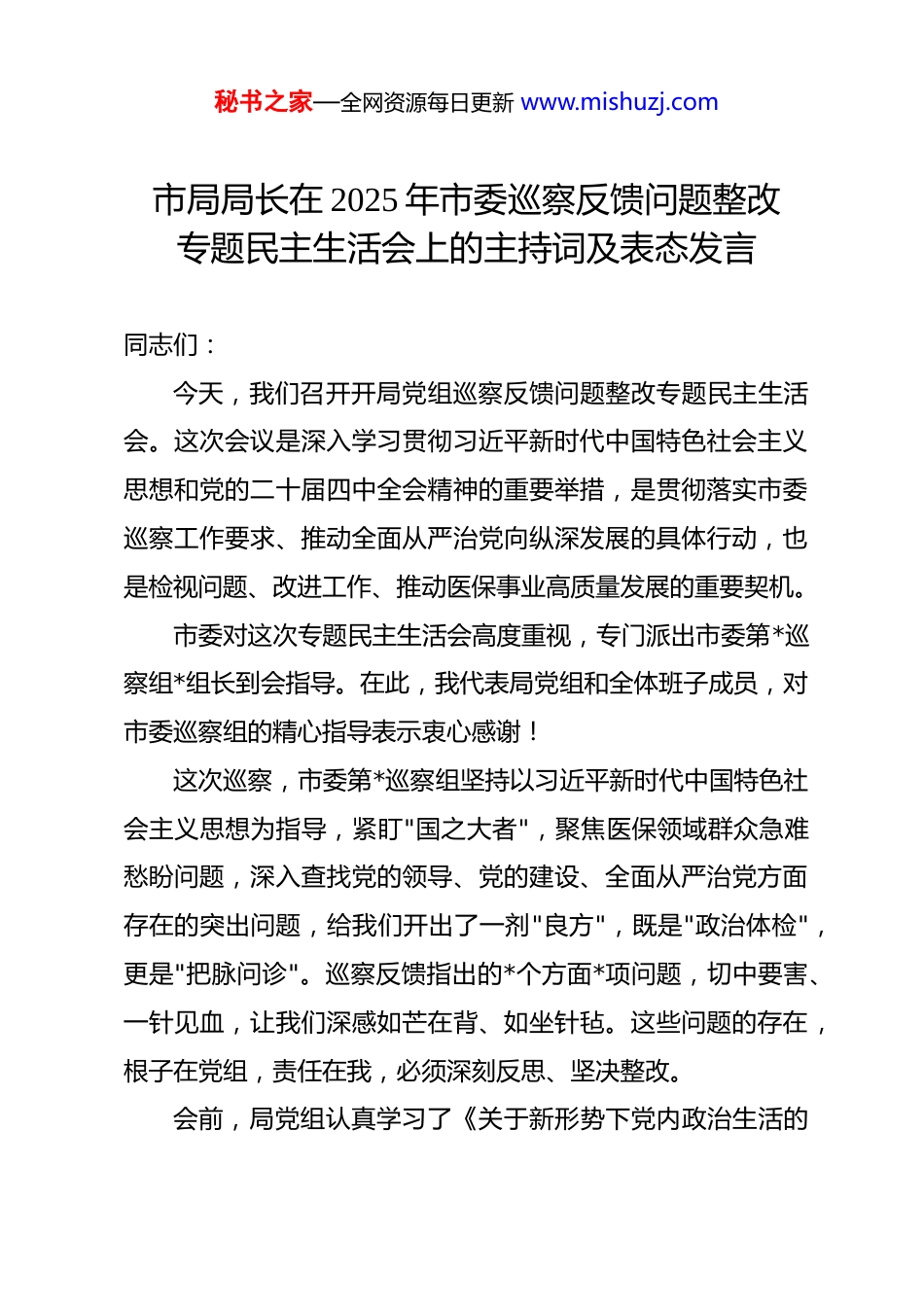 秘书之家—全网资源每日更新 www.mishuzj.com市局局长在 2025 年市委巡察反馈问题整改专题民主生活会上的主持词及表态发言 同志们:今天,我们召开开局党组巡察反馈问题整改专题民主生活会。这次会议是深入学习贯彻习近平新时代中国特色社会主义思想和党的二十届四中全会精神的重要举措,是贯彻落实市委巡察工作要求、推动全面从严治党向纵深发展的具体行动,也是检视问题、改进工作、推动医保事业高质量发展的重要契机。市委对这次专题民主生活会高度重视,专门派出市委第*巡察组*组长到会指导。在此,我代表局党组和全体班子成员,对市委巡察组的精心指导表示衷心感谢!这次巡察,市委第*巡察组坚持以习近平新时代中国特色社会主义思想为指导,紧盯"国之大者",聚焦医保领域群众急难愁盼问题,深入查找党的领导、党的建设、全面从严治党方面存在的突出问题,给我们开出了一剂"良方",既是"政治体检",更是"把脉问诊"。巡察反馈指出的*个方面*项问题,切中要害、一针见血,让我们深感如芒在背、如坐针毡。这些问题的存在,根子在党组,责任在我,必须深刻反思、坚决整改。会前,局党组认真学习了《关于新形势下党内政治生活的秘书之家—全网资源每日更新 www.mishuzj.com若干准则》《中国共产党党内监督条例》等党内法规,深入学习贯彻习近平总书记关于巡视巡察工作的重要论述,对照巡察反馈意见,逐条逐项进行了深刻检视。班子成员之间开展了坦诚的谈心谈话,为开好这次民主生活会打下了坚实基础。今天会议的主要任务是:一是深入学习领会习近平总书记关于巡视巡察工作的重要论述,提高政治站位;二是聚焦巡察反馈问题,深刻剖析根源,开展批评与自我批评;三是明确整改措施和努力方向,以整改实效践行初心使命。下面,请市委第*巡察组*组长作重要讲话,大家欢迎。……刚才,*组长作了重要讲话,既充分肯定了我们前期的整改工作,又对下一步整改提出了明确要求,具有很强的针对性和指导性。我们一定要认真学习领会,坚决贯彻落实。下面,会议进行第二项议程,由我代表局党组作对照检查,随后班子成员逐一进行个人对照检查,开展批评与自我批评。察组*组长作重要讲话,大家欢迎。同志们,刚才,市委巡察组*组长的讲话,让我深受教育、深受触动。作为局党组书记、局长,我深感责任重大、使命光荣。借此机会,我代表局党组,就坚决抓好巡察反馈问题整改,郑重表态如下:秘书之家—全网资源每日更新 www.mishuzj.com一、提高政治站位,把整改作为重大政治任务医保工作连接千家万户,关系人民群众切身利益,是重大的民生工程、民心工程。习近平总书记多次强调,要完善覆盖全民的社会保障体系,让改革发展成果更多更公平惠及全体人民。市委巡察反馈的问题,暴露出我们在政治站位、责任担当、工作作风上存在的差距,必须以高度的政治自觉抓好整改。一是强化理论武装。局党组将把学习贯彻习近平新时代中国特色社会主义思想作为首要政治任务,深入学习习近平总书记关于医疗保障工作的重要论述,深刻领悟"两个确立"的决定性意义,坚决做到"两个维护"。建立党组理论学习中心组常态化学习机制,每月至少开展*次集中学习,每季度至少开展*次专题研讨,推动学习往深里走、往实里走、往心里走。二是压实整改责任。成立由我担任组长的整改工作领导小组,建立"局党组总负责、分管领导具体抓、科室部门抓落实"的责任体系,将*项整改任务逐一分解到人、明确到岗,实行清单化管理、项目化推进、销号式落实。三是坚持立行立改。对巡察反馈的问题,不回避、不遮掩、不推诿,以"马上就办、真抓实干"的态度,该整改的立即整改,该问责的坚决问责,确保整改工作不走过场、不打折扣。二、聚焦突出问题,以刀刃向内的勇气深挖根源秘书之家—全网资源每日更新 www.mishuzj.com巡察反馈指出的问题,既有思想层面的偏差,也有制度机制的缺失,更有作风上的不实。作为"一把手",我必须勇于担当、动真碰硬,从思想深处挖根源、从制度层面找漏洞、从作风建设上抓整改。一是在政治建设方面。巡察指出,局党组理论学习中心组学习存在形式主义,学习研讨不深不透。这暴露出我对理论学习的重要性认识不足,存在...